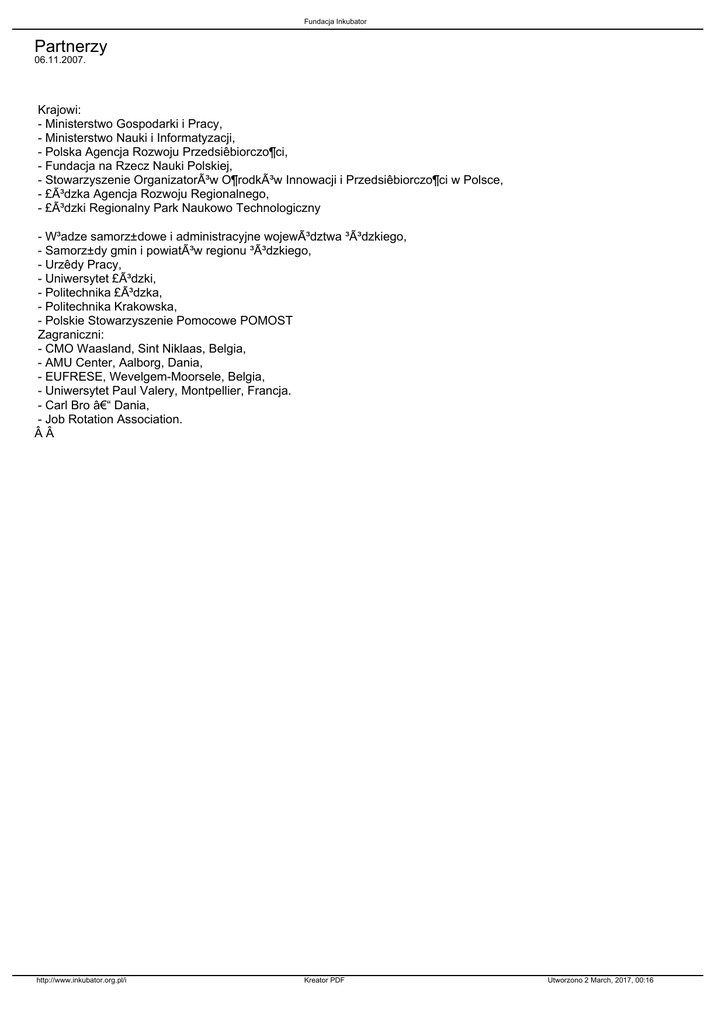 Fundacja Inkubator Partnerzy 06.11.2007. Krajowi: - Ministerstwo Gospodarki i Pracy, - Ministerstwo Nauki i Informatyzacji, - Polska Agencja Rozwoju Przedsiêbiorczo¶ci, - Fundacja na Rzecz Nauki Polskiej, - Stowarzyszenie Organizatorów O¶rodków Innowacji i Przedsiêbiorczo¶ci w Polsce, - £Ã³dzka Agencja Rozwoju Regionalnego, - £Ã³dzki Regionalny Park Naukowo Technologiczny - W³adze samorz±dowe i administracyjne województwa ³Ã³dzkiego, - Samorz±dy gmin i powiatów regionu ³Ã³dzkiego, - Urzêdy Pracy, - Uniwersytet £Ã³dzki, - Politechnika £Ã³dzka, - Politechnika Krakowska, - Polskie Stowarzyszenie Pomocowe POMOST Zagraniczni: - CMO Waasland, Sint Niklaas, Belgia, - AMU Center, Aalborg, Dania, - EUFRESE, Wevelgem-Moorsele, Belgia, - Uniwersytet Paul Valery, Montpellier, Francja. - Carl Bro – Dania, - Job Rotation Association.  http://www.inkubator.org.pl/i Kreator PDF Utworzono 2 March, 2017, 00:16