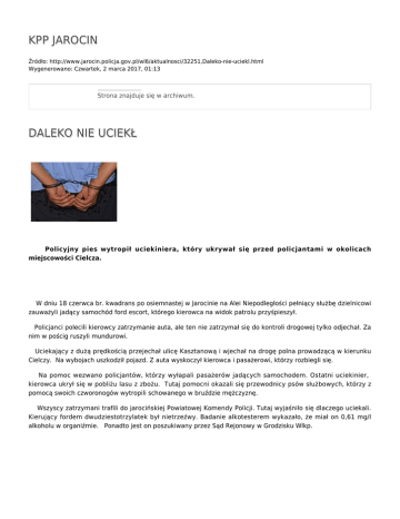 KPP JAROCIN Źródło: http://www.jarocin.policja.gov.pl/wl6/aktualnosci/32251,Daleko-nie-uciekl.html Wygenerowano: Czwartek, 2 marca 2017, 01:13 Strona znajduje się w archiwum. DALEKO NIE UCIEKŁ Policyjny pies wytropił uciekiniera, który ukrywał się przed policjantami w okolicach miejscowości Cielcza. W dniu 18 czerwca br. kwadrans po osiemnastej w Jarocinie na Alei Niepodległości pełniący służbę dzielnicowi zauważyli jadący samochód ford escort, którego kierowca na widok patrolu przyśpieszył. Policjanci polecili kierowcy zatrzymanie auta, ale ten nie zatrzymał się do kontroli drogowej tylko odjechał. Za nim w pościg ruszyli mundurowi. Uciekający z dużą prędkością przejechał ulicę Kasztanową i wjechał na drogę polna prowadzącą w kierunku Cielczy. Na wybojach uszkodził pojazd. Z auta wyskoczył kierowca i pasażerowi, którzy rozbiegli się. Na pomoc wezwano policjantów, którzy wyłapali pasażerów jadących samochodem. Ostatni uciekinier, kierowca ukrył się w pobliżu lasu z zbożu. Tutaj pomocni okazali się przewodnicy psów służbowych, którzy z pomocą swoich czworonogów wytropili schowanego w bruździe mężczyznę. Wszyscy zatrzymani trafili do jarocińskiej Powiatowej Komendy Policji. Tutaj wyjaśniło się dlaczego uciekali. Kierujący fordem dwudziestotrzylatek był nietrzeźwy. Badanie alkotesterem wykazało, że miał on 0,61 mg/l alkoholu w organiźmie. Ponadto jest on poszukiwany przez Sąd Rejonowy w Grodzisku Wlkp. Ocena: 0/5 (0) Tweetnij