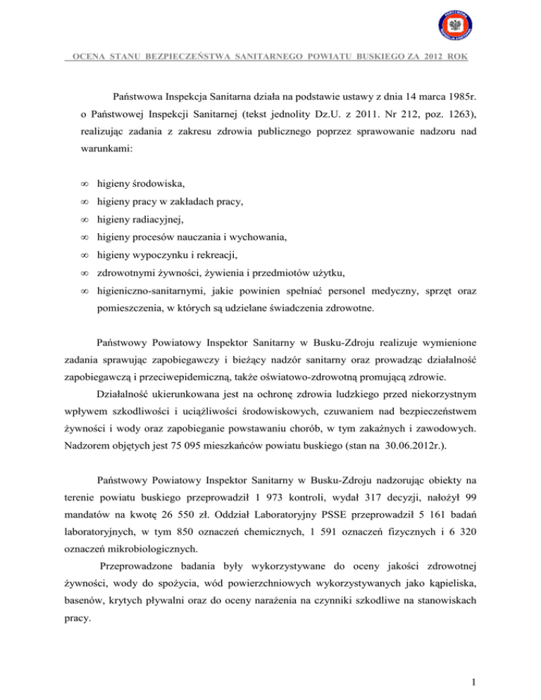OCENA STANU BEZPIECZEŃSTWA SANITARNEGO POWIATU BUSKIEGO ZA 2012 ROK Państwowa Inspekcja Sanitarna działa na podstawie ustawy z dnia 14 marca 1985r. o Państwowej Inspekcji Sanitarnej (tekst jednolity Dz.U. z 2011. Nr 212, poz. 1263), realizując zadania z zakresu zdrowia publicznego poprzez sprawowanie nadzoru nad warunkami: • higieny środowiska, • higieny pracy w zakładach pracy, • higieny radiacyjnej, • higieny procesów nauczania i wychowania, • higieny wypoczynku i rekreacji, • zdrowotnymi Ŝywności, Ŝywienia i przedmiotów uŜytku, • higieniczno-sanitarnymi, jakie powinien spełniać personel medyczny, sprzęt oraz pomieszczenia, w których są udzielane świadczenia zdrowotne. Państwowy Powiatowy Inspektor Sanitarny w Busku-Zdroju realizuje wymienione zadania sprawując zapobiegawczy i bieŜący nadzór sanitarny oraz prowadząc działalność zapobiegawczą i przeciwepidemiczną, takŜe oświatowo-zdrowotną promującą zdrowie. Działalność ukierunkowana jest na ochronę zdrowia ludzkiego przed niekorzystnym wpływem szkodliwości i uciąŜliwości środowiskowych, czuwaniem nad bezpieczeństwem Ŝywności i wody oraz zapobieganie powstawaniu chorób, w tym zakaźnych i zawodowych. Nadzorem objętych jest 75 095 mieszkańców powiatu buskiego (stan na 30.06.2012r.). Państwowy Powiatowy Inspektor Sanitarny w Busku-Zdroju nadzorując obiekty na terenie powiatu buskiego przeprowadził 1 973 kontroli, wydał 317 decyzji, nałoŜył 99 mandatów na kwotę 26 550 zł. Oddział Laboratoryjny PSSE przeprowadził 5 161 badań laboratoryjnych, w tym 850 oznaczeń chemicznych, 1 591 oznaczeń fizycznych i 6 320 oznaczeń mikrobiologicznych. Przeprowadzone badania były wykorzystywane do oceny jakości zdrowotnej Ŝywności, wody do spoŜycia, wód powierzchniowych wykorzystywanych jako kąpieliska, basenów, krytych pływalni oraz do oceny naraŜenia na czynniki szkodliwe na stanowiskach pracy. 1 OCENA STANU BEZPIECZEŃSTWA SANITARNEGO POWIATU BUSKIEGO ZA 2012 ROK Oddział Laboratoryjny Powiatowej Stacji Sanitarno – Epidemiologicznej w BuskuZdroju wykonuje badania w zakresie: • wody do spoŜycia, wód powierzchniowych, kąpielisk i basenów. • zanieczyszczeń mikrobiologicznych Ŝywności oraz oznaczania składników odŜywczych w posiłkach • zapylenia, hałasu, mikroklimatu, oświetlenia oraz zawartość substancji toksycznych na stanowiskach pracy • badań diagnostycznych w kierunku chorób bakteryjnych, wirusowych i pasoŜytniczych Posiada akredytację i utrzymuje wysoki poziom jakości wykonywanych badań. W laboratorium został przeprowadzony w 2012 roku przez Polskie Centrum Akredytacji audit zgodnie z PN-EN-ISO/IEC 17025:2007, potwierdzający wiarygodność wykonywanych badań laboratoryjnych. Państwowy Powiatowy Inspektor Sanitarny realizuje zadania w ramach zintegrowanych systemów działających w Unii Europejskiej np. systemu wczesnego ostrzegania o niebezpiecznych produktach Ŝywnościowych (RASFF) oraz prowadzi monitoring jakości wody, nadzór epidemiologiczny, ocenę ryzyka zagroŜenia bezpieczeństwa Ŝywności (przestrzegania zasad GMP, GHP, HACCP). W działalności kontrolnej udoskonalano wdroŜony system jakości i jednolite procedury kontroli obiektów i urządzeń. Wyniki działalności Państwowej Inspekcji Sanitarnej pozwalają na ocenę sytuacji epidemiologicznej i stanu sanitarnego powiatu buskiego, uwzględniającą istniejące oraz mogące się pojawić zagroŜenia. Przedstawiony „Stan bezpieczeństwa sanitarnego powiatu buskiego” został opracowany na podstawie informacji i materiałów własnych. Niniejsza ocena nie uwzględnia stanu sanitarnego podmiotów, dla których powiat jest organem załoŜycielskim lub organem prowadzącym. Z dniem 01.01.2010r. w/w podmioty zostały przekazane do nadzoru Świętokrzyskiemu Państwowemu Wojewódzkiemu Inspektorowi Sanitarnemu. Informacje zawarte w niniejszej ocenie wskazują, iŜ bezpieczeństwo sanitarne mieszkańców powiatu buskiego, podobnie jak w latach poprzednich, jest na wysokim poziomie. 2 OCENA STANU BEZPIECZEŃSTWA SANITARNEGO POWIATU BUSKIEGO ZA 2012 ROK Aktualne informacje dotyczące działalności Państwowej Inspekcji Sanitarnej w Busku-Zdroju znajdują się na stronie internetowej pssebusko.w.interia.pl Niniejszą ocenę opracowano i przesyła się na podstawie art. 12 a ust.3 Ustawy z dnia 14 marca 1985r. o Państwowej Inspekcji Sanitarnej (tekst jednolity Dz.U. z 2011r. Nr 212, poz. 1263 ). 3 OCENA STANU BEZPIECZEŃSTWA SANITARNEGO POWIATU BUSKIEGO ZA 2012 ROK I. OCENA ZAGROśENIA EPIDEMIOLOGICZNEGO Choroby zakaźne wieku dziecięcego oraz choroby przenoszone drogą pokarmową w porównaniu do lat 2010-2011 w roku 2012 mieszczą się w średniej krajowej. Pozostałe choroby zakaźne, zakaŜenia i zatrucia objęte obowiązkiem zgłaszania i rejestracji pozostają na stałym niskim poziomie i mieszczą się w średniej krajowej. W roku 2012 nastąpił znaczny wzrost zachorowań na ospę wietrzną. W roku 2011 w powiecie buskim zarejestrowano 197 przypadków ospy wietrznej, natomiast w roku 2012 zarejestrowano 532 przypadki ospy wietrznej. W 2012 r. odnotowano ponowny spadek zachorowań wywołanych przez Salmonellę. W 2011 roku było ich 13, natomiast w 2012 odnotowano 6 zachorowań wywołanych przez Salmonellę. W roku 2012 odnotowano niewielki spadek zachorowań na wirusowe zapalenie wątroby (Ŝółtaczkę zakaźną ) typu B oraz znaczny wzrost zachorowań na przewlekłe wirusowe zapalenie wątroby typu C w porównaniu do roku 2011. W 2011 r. zarejestrowano w powiecie buskim 7 przypadków WZW B, w 2012 r. – 7 przypadków: przy zapadalności - w 2011 r. 9,59/100 tys. dla powiatu i 5,53/100 tys. w województwie świętokrzyskim i 3,85/100 tys. w kraju. - w 2012 r. 8,09/100 tys. dla powiatu i 6,11/100 tys. w województwie świętokrzyskim i 3,85/100 tys. w kraju. W 2011 roku w powiecie buskim zarejestrowano 6 przypadków WZW C , w 2012 r. – 18 przypadków: przy 