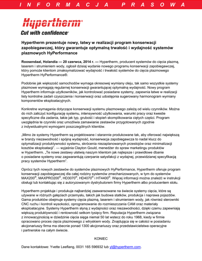 I N F O R M A C J A P R A S O W Hypertherm prezentuje nowy, łatwy w realizacji program konserwacji zapobiegawczej, który gwarantuje optymalną trwałość i wydajność systemów plazmowych HyPerformance Roosendaal, Holandia — 20 czerwca, 2014 r. — Hypertherm, producent systemów do cięcia plazmą, laserem i strumieniem wody, ogłosił dzisiaj wydanie nowego programu konserwacji zapobiegawczej, który pomoże klientom zmaksymalizować wydajność i trwałość systemów do cięcia plazmowego Hypertherm HyPerformance®. Podobnie jak większość samochodów wymaga okresowej wymiany oleju, tak samo wszystkie systemy plazmowe wymagają regularnej konserwacji gwarantującej optymalną wydajność. Nowy program Hypertherm informuje użytkowników, jak kontrolować posiadane systemy, zapewnia łatwe w realizacji listy kontrolne zadań czyszczenia i konserwacji oraz udostępnia sugerowany harmonogram wymiany komponentów eksploatacyjnych. Konkretne wymagania dotyczące konserwacji systemu plazmowego zależą od wielu czynników. Można do nich zaliczyć konfigurację systemu, intensywność użytkowania, warunki pracy oraz kwestie specyficzne dla zadania, takie jak typ, grubość i stopień skomplikowania ciętych części. Program uwzględnia te czynniki oraz umożliwia zamawianie zestawów przygotowanych zgodnie z indywidualnymi wymogami poszczególnych klientów. „Mimo że systemy Hypertherm są projektowane i starannie produkowane tak, aby oferować największą w branży niezawodność i spójną wydajność, konserwacja zapobiegawcza to nadal klucz do optymalizacji produktywności systemu, skrócenia niezaplanowanych przestojów oraz minimalizacji kosztów eksploatacji”. — wyjaśnia Clayton Gould, menedżer do spraw marketingu produktów w Hypertherm. „Te nowe zestawy ułatwią naszym klientom jak najlepsze i prawidłowe dbanie o posiadane systemy oraz zagwarantują czerpanie satysfakcji z wydajnej, przewidzianej specyfikacją pracy systemów Hypertherm”. Oprócz tych nowych zestawów do systemów plazmowych HyPerformance, Hypertherm oferuje program konserwacji zapobiegawczej dla całej rodziny systemów zmechanizowanych, w tym do systemów MAX200®, MAXPRO200®, HD3070®, HD4070® i HT4400®. Więcej informacji można znaleźć w instrukcji obsługi lub kontaktując się z autoryzowanym dystrybutorem firmy Hypertherm albo producentem stołu. Hypertherm projektuje i produkuje najbardziej zaawansowane na świecie systemy cięcia, które są używane w różnych gałęziach przemysłu, takich jak budowa statków, produkcja i naprawa pojazdów. Gama produktów obejmuje systemy cięcia plazmą, laserem i strumieniem wody, jak również sterowniki CNC ruchu i kontroli wysokości, oprogramowanie do rozmieszczania CAM oraz materiały eksploatacyjne. Systemy Hypertherm słyną z wydajności oraz niezawodności, dzięki czemu zapewniają większą produktywność i rentowność setkom tysięcy firm. Reputacja Hypertherm związana z innowacyjnością w dziedzinie cięcia sięga niemal 50 lat wstecz do roku 1968, kiedy w firmie opracowano proces cięcia plazmowego z wtryskiem wody. Znajdująca się w całości w posiadaniu akcjonariuszy firma ma obecnie ponad 1300 akcjonariuszy oraz przedstawicielstwa operacyjne i partnerskie na całym świecie. KONIEC Dane kontaktowe: Yvette Leeflang, 0031 165 596932 lub [email protected]. A
