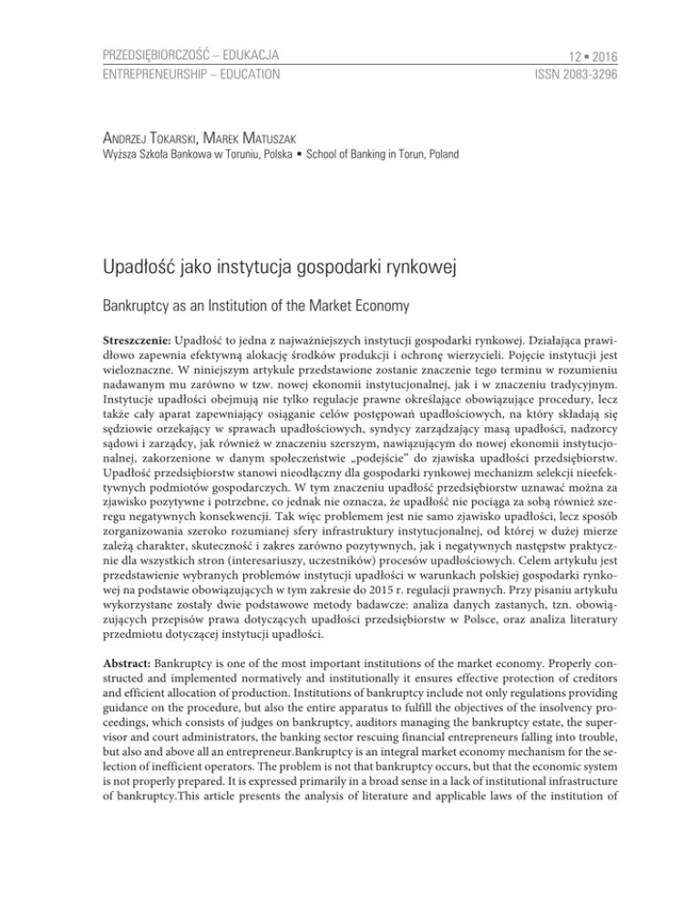PRZEDSIĘBIORCZOŚĆ – EDUKACJA ENTREPRENEURSHIP – EDUCATION 12 2016 ISSN 2083-3296 Andrzej Tokarski, Marek Matuszak Wyższa Szkoła Bankowa w Toruniu, Polska School of Banking in Torun, Poland Upadłość jako instytucja gospodarki rynkowej Bankruptcy as an Institution of the Market Economy Streszczenie: Upadłość to jedna z najważniejszych instytucji gospodarki rynkowej. Działająca prawidłowo zapewnia efektywną alokację środków produkcji i ochronę wierzycieli. Pojęcie instytucji jest wieloznaczne. W niniejszym artykule przedstawione zostanie znaczenie tego terminu w rozumieniu nadawanym mu zarówno w tzw. nowej ekonomii instytucjonalnej, jak i w znaczeniu tradycyjnym. Instytucje upadłości obejmują nie tylko regulacje prawne określające obowiązujące procedury, lecz także cały aparat zapewniający osiąganie celów postępowań upadłościowych, na który składają się sędziowie orzekający w sprawach upadłościowych, syndycy zarządzający masą upadłości, nadzorcy sądowi i zarządcy, jak również w znaczeniu szerszym, nawiązującym do nowej ekonomii instytucjonalnej, zakorzenione w danym społeczeństwie „podejście” do zjawiska upadłości przedsiębiorstw. Upadłość przedsiębiorstw stanowi nieodłączny dla gospodarki rynkowej mechanizm selekcji nieefektywnych podmiotów gospodarczych. W tym znaczeniu upadłość przedsiębiorstw uznawać można za zjawisko pozytywne i potrzebne, co jednak nie oznacza, że upadłość nie pociąga za sobą również szeregu negatywnych konsekwencji. Tak więc problemem jest nie samo zjawisko upadłości, lecz sposób zorganizowania szeroko rozumianej sfery infrastruktury instytucjonalnej, od której w dużej mierze zależą charakter, skuteczność i zakres zarówno pozytywnych, jak i negatywnych następstw praktycznie dla wszystkich stron (interesariuszy, uczestników) procesów upadłościowych. Celem artykułu jest przedstawienie wybranych problemów instytucji upadłości w warunkach polskiej gospodarki rynkowej na podstawie obowiązujących w tym zakresie do 2015 r. regulacji prawnych. Przy pisaniu artykułu wykorzystane zostały dwie podstawowe metody badawcze: analiza danych zastanych, tzn. obowiązujących przepisów prawa dotyczących upadłości przedsiębiorstw w Polsce, oraz analiza literatury przedmiotu dotyczącej instytucji upadłości. Abstract: Bankruptcy is one of the most important institutions of the market economy. Properly constructed and implemented normatively and institutionally it ensures effective protection of creditors and efficient allocation of production. Institutions of bankruptcy include not only regulations providing guidance on the procedure, but also the entire apparatus to fulfill the objectives of the insolvency proceedings, which consists of judges on bankruptcy, auditors managing the bankruptcy estate, the supervisor and court administrators, the banking sector rescuing financial entrepreneurs falling into trouble, but also and above all an entrepreneur.Bankruptcy is an integral market economy mechanism for the selection of inefficient operators. The problem is not that bankruptcy occurs, but that the economic system is not properly prepared. It is expressed primarily in a broad sense in a lack of institutional infrastructure of bankruptcy.This article presents the analysis of literature and applicable laws of the institution of 200 Andrzej Tokarski, Marek Matuszak bankruptcy and its components.The basic method used is the analysis of existing data − existing legislation relating to bankruptcy of enterprises in Poland, and analysis of the literature on bankruptcy as an institution functioning in the market economy, taking into account the Polish economy. Słowa klucze: infrastruktura upadłości; instytucja upadłości; modele upadłości; podmioty (interesariusze) postępowania upadłościowego; upadłość; upadłość w polskiej gospodarce Key words: bankruptcy; bankruptcy institution’s models; bodies of insolvency proceedings; infrastructure of bankruptcy; institution of bankruptcy; bankruptcy in the Polish economy Otrzymano: 5 listopada 2015 Received: 5 November 2015 Zaakceptowano: 18 marca 2016 Accepted: 18 March 2016 Sugerowana cytacja/Suggested citation: Tokarski, A., Matuszak, M. (2016). Upadłość jako instytucja gospodarki rynkowej, Przedsiębiorczość − Edukacja, 12, 199–216. Wstęp Upadłość to jedna z najważniejszych instytucji gospodarki rynkowej. W związku z burzliwymi przemianami, których obecnie doświadcza globalna gospodarka, co nie pozostaje bez wpływu na gospodarki narodowe i regionalne, waga problematyki bankructw i upadłości staje się trudna do przecenienia (Morawska, 2013a). Właściwe regulacje prawne oraz odpowiednie otoczenie instytucjonalne działalności gospodarczej, również w zakresie procesów upadłościowych przedsiębiorstw, wywierają pozytywny wpływ na wzrost gospodarczy oraz rozwój państw i społeczeństw (Lee i in., 2011; Morawska, 2011). Dzieje się tak dlatego, że instytucja upadłości, jeśli jest skonstruowana prawidłowo, tzn. adekwatnie do sytuacji istniejącej w danej przestrzeni gospodarczej, zapewnia zarówno efektywną alokację środków produkcji, jak i skuteczną ochronę wierzycieli (Bauer, 2009). Celowość stałego monitorowania zakresu i przyczyn upadłości przedsiębiorstw w danej gospodarce, jak również w coraz większym stopniu gospodarstw domowych (czyli upadłości konsumenckiej) wynika przede wszystkim z faktu, że sprawny przebieg tych procesów stanowi nieodłączny element efektywnie działającej gospodarki rynkowej. Nieprzypadkowo zatem sformułowane zostało stwierdzenie, iż kapitalizm, w którym nie zdarzają się bankructwa i upadłości, jest jak chrześcijaństwo bez piekła. Stwierdzenie to odnosi się obecnie w coraz większym stopniu również do państw (Adamska, Mączyńska, 2013). Celem artykułu jest określenie pojęcia i elementów upadłości jako instytucji 