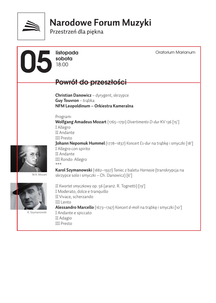 05 listopada sobota 18:00 Oratorium Marianum Powrót do przeszłości Christian Danowicz – dyrygent, skrzypce Guy Touvron – trąbka NFM Leopoldinum – Orkiestra Kameralna W.A. Mozart K. Szymanowski Program: Wolfgang Amadeus Mozart (1765–1791) Divertimento D-dur KV 136 [15'] I Allegro II Andante III Presto Johann Nepomuk Hummel (1778–1837) Koncert Es-dur na trąbkę i smyczki [18'] I Allegro con spirito II Andante III Rondo: Allegro *** Karol Szymanowski (1882–1937) Taniec z baletu Harnasie (transkrypcja na skrzypce solo i smyczki – Ch. Danowicz) [6'] II Kwartet smyczkowy op. 56 (aranż. R. Tognetti) [19'] I Moderato, dolce e tranquillo II Vivace, scherzando III Lento Alessandro Marcello (1673–1747) Koncert d-moll na trąbkę i smyczki [10'] I Andante e spiccato II Adagio III Presto Omówienie Piotr Matwiejczuk Wczesne kwartety smyczkowe Mozarta to utwory pełne wdzięku, ale typowo rozrywkowe, na pograniczu divertimenta i kwartetu „salonowego”. Trzy dziełka powstałe w 1772 r., po powrocie kompozytora z drugiej podróży po Italii, choć noszą nazwę „divertimenta”, nie mają typowej dla tego rodzaju utworów budowy. Jak zauważył Alfred Einstein, „divertimento powinno mieć dwa menuety, a w tych trzech dziełach w ogóle nie ma menuetów. Są to kompozycje trzyczęściowe [...]. Są po prostu symfoniami na same instrumenty smyczkowe, bez obojów i rogów”. Einstein sugeruje również, że Mozart napisał je „na zapas”, na ostatnią podróż do Włoch – gdyby zamówiono tam u niego symfonię, wystarczyłoby dopisać partie instrumentów dętych. W Kwartecie D-dur KV 136, który usłyszymy dziś w opracowaniu na orkiestrę smyczkową, szczególnie przykuwa uwagę otwierające Allegro z wirtuozowską partią skrzypcową. Druga część, Andante, przepełniona jest gracją włoskiego stylu. W swojej debiutanckiej powieści Ulubiona gra Leonard Cohen ustami bohatera stwierdza, że mosiądz wygląda tak, jak powinno wyglądać złoto. Lśniący stop miedzi i cynku od setek lat jest bezcennym budulcem instrumentów dętych. Nie tylko z powodu jego królewskiego blasku grający na mosiężnych trąbach muzycy od wieków wynosili się ponad innych instrumentalistów. John Eliot Gardiner tak pisał o czasach Johanna Sebastiana Bacha: „Włączenie członków Stadtpfeifer [trębaczy miejskich] do zespołu złożonego z młodych uczniów Bacha nie było proste: jak wszyscy grający na instrumentach dętych przed nimi i po nich, kierowali się oni odmiennymi zasadami niż pozostali muzycy, pracując według odrębnych reguł i podążając ścieżkami swych tajemnych praktyk”. Trudno się dziwić: aż do czasów klasycyzmu gra na trąbce naturalnej była wyjątkowo trudna technicznie, a zarazem bardzo efektowna – kompozytorzy baroku chętnie używali trąbek grających w popularnym wówczas stylu clarion, by nadać swoim utworom odświętność i królewski blask. W 1801 r. Anton Wieldiger skonstruował trąbkę z klapami (na wzór klarnetu) ułatwiającymi grę i pozwalającymi na wydobywanie szerszej skali dźwięków. Temu właśnie innowatorowi, trębaczowi i wirtuozowi zostały zadedykowane najsłynniejsze koncerty trąbkowe epoki: Koncert Es-dur Josepha Haydna oraz Koncert E-dur (częściej wykonywany jednak w tonacji Es-dur) Johanna Nepomuka Hummla. Skomponowany w 1803 r., a wykonany po raz pierwszy w dzień Nowego Roku 1804 utwór był pierwszym dziełem Hummla jako następcy Haydna na stanowisku kapelmistrza na dworze księcia Mikołaja II Esterházy’ego. Koncert Hummla wykorzystuje walory zmodernizowanego instrumentu w jeszcze większym stopniu niż ten napisany przez Haydna, a brzmienie trąbki dodatkowo wyróżnia się poprzez zawężenie obsady orkiestrowej. Otwierająca część ma formę klasycznego allegra sonatowego – trąbka powtarza wprowadzony przez orkiestrę pierwszy temat, otrzymuje jednak oryginalny temat drugi. Kolejną część, Andante, utrzymaną w tonacji a-moll, przepełnia operowa śpiewność. (Słychać tu motyw do złudzenia przypominający refren pieśni My, Pierwsza Brygada.) Zamykające utwór wirtuozowskie Rondo pozwala trębaczowi na ukazanie pełnego spektrum możliwości – własnych płuc oraz złocistego instrumentu. Najsłynniejszym koncertem obojowym pozostaje barokowe dzieło Alessandra Marcella. Można jednak pokusić się o stwierdzenie, że utwór ten zyskuje jeszcze w wersji na trąbkę. Barwa triumfalnego zazwyczaj instrumentu brzmi w tonacji minorowej wyjątkowo przejmująco. Utwór doczekał się licznych aranżacji i przeróbek: do najsłynniejszych należy ta dokonana przez Johanna Sebastiana Bacha, który zastąpił obój instrumentem klawiszowym i stworzył Koncert d-moll BWV 974. Autorstwo koncertu obojowego przez wiele lat przypisywano bratu Alessandra, Benedettowi, również kompozytorowi i mężowi kompozytorki Rosanny Scalfi Marcello. Obaj bracia wywodzili się z zamożnej weneckiej rodziny pochodzącej od dożów. Koncert obojowy bliższy jest stylistycznie dziełom Albinoniego niż Vivaldiego, z całą pewnością jednak jest bardzo wenecki w brzmieniu. Słynny amerykański oboista rosyjskiego pochodzenia, Eugene Izotov, darzy dzieło głębokim uczuciem: „Mimo że wiele utworów z epoki Marcella należało do muzyki sakralnej, ten koncert taki nie jest – jest bardzo ludzki, opowiada o nas. Czuję, że jest w nim zawarta głęboko humanistyczna, przejmująca historia, niemająca w sobie nic boskiego czy nawet królewskiego. Choć powstał wieki temu, jest bliski naszemu życiu. To jedno z tych ikonicznych dzieł, które mają moc porywania nas w inną przestrzeń”. Podobną mocą obdarzone są dzieła Karola Szymanowskiego. O ile jego I Kwartet smyczkowy zapowiada jedynie „folklorystyczny” okres twórczości kompozytora, o tyle późniejszy o dekadę II Kwartet op. 56 przeniknięty jest niemal w całości nawiązaniami do folkloru góralskiego. Tak samo trzyczęściowy, z allegrem 