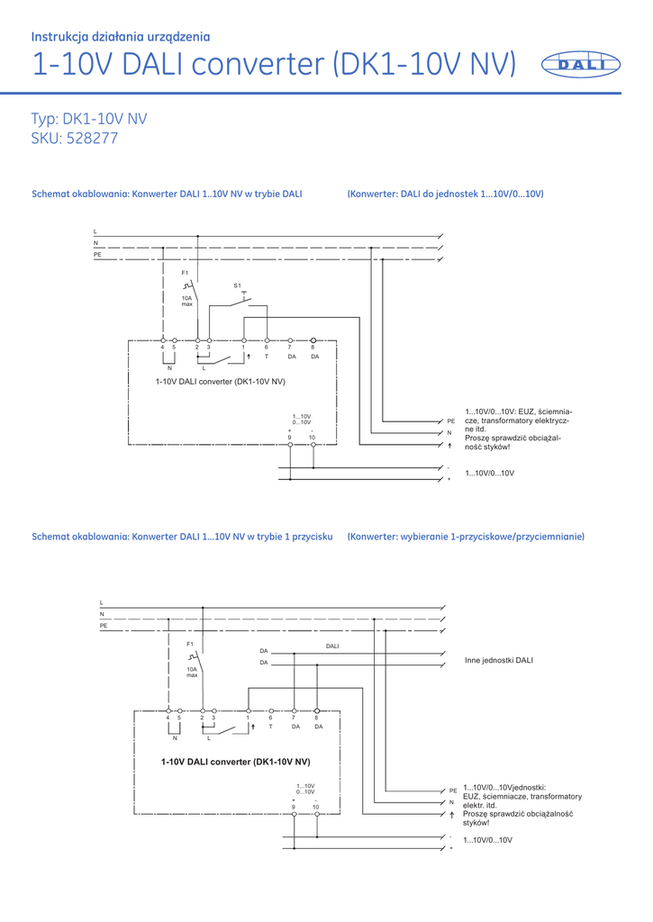 Instrukcja działania urządzenia 1-10V DALI converter (DK1-10V NV) Typ: DK1-10V NV SKU: 528277 Schemat okablowania: Konwerter DALI 1..10V NV w trybie DALI (Konwerter: DALI do jednostek 1...10V/0...10V) L N PE F1 S1 10A max 4 5 2 N 3 1 6 7 8 T DA DA L 1-10V DALI converter (DK1-10V NV) 1...10V/0...10V: EUZ, ściemnia- 1...10V 0...10V + 9 PE 10 N + Schemat okablowania: Konwerter DALI 1...10V NV w trybie 1 przycisku 1...10V/0...10V units:elektryczcze, transformatory ECGs, ne itd. dimmers, electr. ProszęTranssprawdzić obciążalformers, etc. ność styków! Check contact rating! 1...10V/0...10V 1...10V/0...10V (Konwerter: wybieranie 1-przyciskowe/przyciemnianie) L N PE F1 DALI DA Other DALI units Inne jednostki DALI DA 10A max 4 5 N 2 3 1 6 7 8 T DA DA L 1-10V DALI converter (DK1-10V NV) 1...10V 0...10V + 9 10 PE N + 1...10V/0...10Vjednostki: 1...10V/0...10V units: EUZ, ściemniacze, ECGs, dimmers, transformatory elektr. itd. electr. TransProszę sprawdzić obciążalność formers, etc. styków!contact rating! Check 1...10V/0...10V 1...10V/0...10V Zastosowania i funkcje Konwerter DALI DK1...10V NV to jednostka wielofunkcyjna. Z jednej strony z konwertera (proszę zapoznać się z trybem DALI), korzystać można cyfrowo, podobnie jak z EUZ DALI a z drugiej strony jest on samodzielnym kontrolerem oświetlenia (proszę zapoznać się z trybem 1 przycisku). Dzięki wyjściu sterującemu (stanowiącemu część interfejsu 1-10V/0-10V) oraz wejściu, EUZ i transformator elektryczny mogą być przyciemniane i włączane przy użyciu 1-10V oraz ściemniaczy przy użyciu 0-10V. Charakterystyka napięcia sterującego może zostać ustawiona logarytmicznie na 1-10V (w przypadku EUZ i transformatorów elektronicznych) lub liniowo na 0-10V (w przypadku ściemniaczy zasilania) w zależności od zastosowania. DK1...10V NV to zatrzaskiwana jednostka z obudową izolowaną przeznaczona do standardowego montażu dystrybutora. Dostępna jest również identyczna jeżeli chodzi o funkcje jednostka z metalową obudową przeznaczona do montażu oświetleniowego (KDK1...10V). W związku z tym, możliwe jest podłączenie DALI przy użyciu istniejących systemów 1-10V/0-10V, połączenie obu systemów lub ustawienie niezależnych systemów kontrolowania oświetlenia. lin. oznacza: charakterystykę linearną 0-10V log. oznacza: charakterystykę logarytmiczną 1-10V Tryb DALI (funkcja konwertera) Konwerter komunikuje się z kontrolerem (np. DALIC CB Typ 2) poprzez interfejs DALI. Za jego pośrednictwem otrzymuje polecenia DALI oraz zasilanie. Komunikaty DALI są konwertowane na komunikaty w formacie 1-10V/0-10V włącznie z włączaniem/wyłączaniem poprzez wej¬ście. W tym celu do kontrolera podłączane są linie DALI (DA/DA). Dodatkowe wejście włączające (T) nie jest podłączane. Kon¬werter znajduje się pod kontrolą kontrolera podobnie jak EUZ DALI. Wszystkie jednostki 1-10V/0-10V podłączone do konwertera¬ są uważane za część grupy znajdującą się pod kontrolą konwertera. Funkcja wykrycia usterek lampy oraz „fizyczny wybór” (dezaktywacja i reaktywacja lamp podczas uruchamiania systemu) nie jest obsługiwana przez system 1-10V/0-10V. Funkcje dostępne w trybie DALI po podłączeniu DALI CD Typu 2: włącznik/wyłącznik, rozjaśnianie/przyciemnianie, komutacja sceny, grupowanie, stałe oświetlenie, wykrywacz obecności itd. Działanie przy powrocie do głównego zasilania: Bez kontrolera wejście jest zamknięte a napięcie wyjściowe wynosi 10 V (100%). W przypadku korzystania z kontrolera działanie jest pod jego kontrolą. Tryb 1 przycisku (funkcja kontrolera) W tym trybie konwerter działa jako niezależny kontroler oświetlenia z 1 przyciskiem odpowiadającym za funkcję włącznika-wyłącznika/przyciemniania niezależnie od DALI. Funkcja kontrolowana jest przy użyciu włącznika (zestyk zwierny/230Vac), który przełącza wejście T na fazę L. W celu skorzystania z trybu należy przytrzymać przycisk (włączając tym samym tryb 1 przycisku). Interfejs DALI nie został podłączony. Konwerter pozostaje aktywny w tym trybie do czasu zresetowania do trybu DALI po otrzymaniu polecenia z interfejsu DALI. Tryb I: Krótkie naciśnięcie: Włączanie/wyłącznie, długie naciśnięcie: Włącznik-jaśniej/jaśniej/ciemniej. Włącznik poziomu oświetlenia jest równy ostatniemu poziomowi przed wyłączeniem (funkcja pamięci automatycznej). Tryb II: Krótkie naciśnięcie: Włączanie/wyłącznie, długie naciśnięcie: Włącznik-jaśniej/jaśniej/ciemniej. Włącznik poziomu oświetlenia zapisywany jest po podwójnym kliknięciu (dwukrotne szybkie naciśnięcie) podczas, gdy jest włączony. Zapis potwierdzany jest poprzez migające oświetlenie. Zmiana na tryb I: Proszę wyłączyć oświetlenie poprzez krótkie naciśnięcie a następnie dwukrotne kliknięcie przycisku. Konwerter włączy się ze 100% oświetleniem w trybie I. Zmiana na tryb II: Proszę dwukrotnie kliknąć przycisk w czasie gdy oświetlenie jest włączone. Oświetlenie zamiga i bieżący poziom oświetlenia zostanie zapisany jako poziom oświetlenia w momencie włączenia. Konwerter przejdzie w tryb II pozostanie w trybie II. Działanie po powrocie do głównego zasilania w trybie 1 przycisku: Zmiana stanu lub poziomu przyciemnienia są ładowane automatycznie. Interfejs DALI Interfejs zgodny z definicją DALI. Prąd pobierany>2mA DC. Izolacja elektryczna od sieci zasilającej oraz wyjścia poprzez transoptor: podstawowa izolacja (brak zabezpieczeń w zakresie dodatkowego niskiego napięcia). Konwerter nie posiada zintegrowanego zasilacza dla interfejsu DALI. Zasilacz interfejsu DALI jest zintegrowanym elementem DALI CB Typu 2. Wyjście (połączone z interfejsem) 1-10V/0-10V Interfejs kontrolujący jednostki 1-10V (maks.-100 mA źródło prądowe np. w przypadku EUZ, transformatorów elektronicznych itd.) oraz/lub jednostek 0-10V (maks. +5 mA aktywne np. ściemniaczy mocy). Izolacja elektryczna od sieci zasila