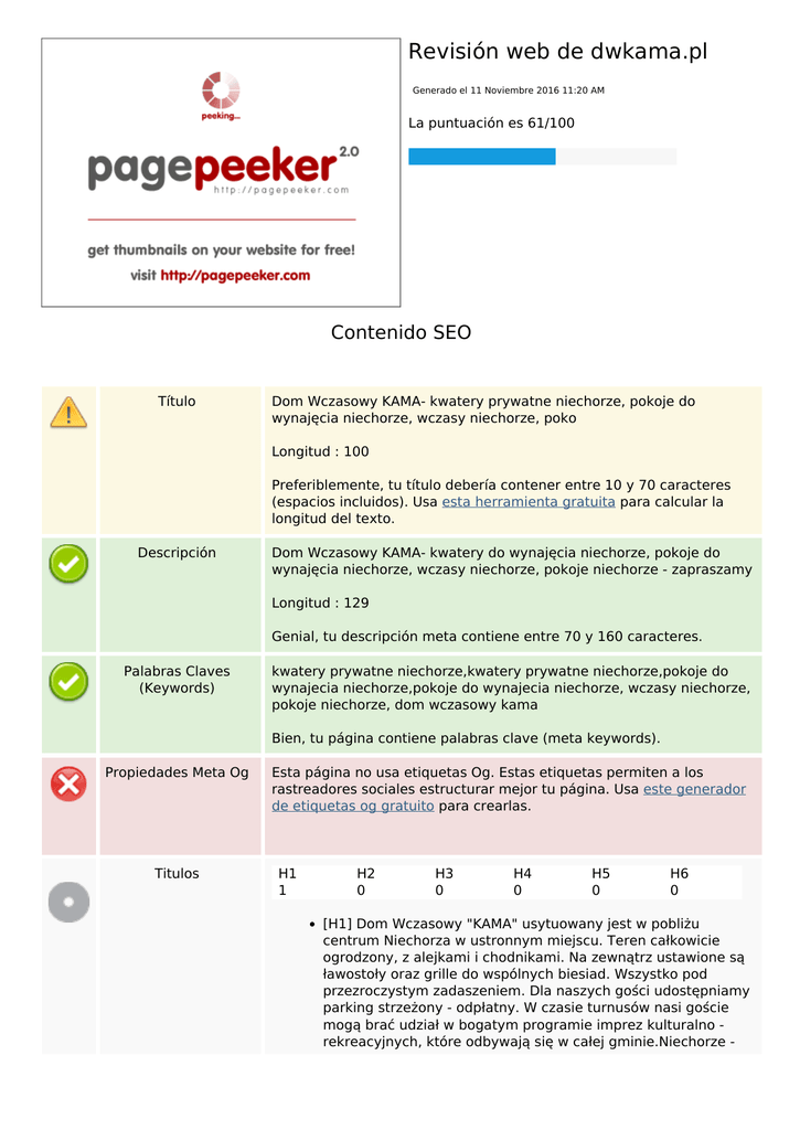 Revisión web de dwkama.pl Generado el 11 Noviembre 2016 11:20 AM La puntuación es 61/100 Contenido SEO Título Dom Wczasowy KAMA- kwatery prywatne niechorze, pokoje do wynajęcia niechorze, wczasy niechorze, poko Longitud : 100 Preferiblemente, tu título debería contener entre 10 y 70 caracteres (espacios incluidos). Usa esta herramienta gratuita para calcular la longitud del texto. Descripción Dom Wczasowy KAMA- kwatery do wynajęcia niechorze, pokoje do wynajęcia niechorze, wczasy niechorze, pokoje niechorze - zapraszamy Longitud : 129 Genial, tu descripción meta contiene entre 70 y 160 caracteres. Palabras Claves (Keywords) kwatery prywatne niechorze,kwatery prywatne niechorze,pokoje do wynajecia niechorze,pokoje do wynajecia niechorze, wczasy niechorze, pokoje niechorze, dom wczasowy kama Bien, tu página contiene palabras clave (meta keywords). Propiedades Meta Og Titulos Esta página no usa etiquetas Og. Estas etiquetas permiten a los rastreadores sociales estructurar mejor tu página. Usa este generador de etiquetas og gratuito para crearlas. H1 1 H2 0 H3 0 H4 0 H5 0 H6 0 [H1] Dom Wczasowy "KAMA" usytuowany jest w pobliżu centrum Niechorza w ustronnym miejscu. Teren całkowicie ogrodzony, z alejkami i chodnikami. Na zewnątrz ustawione są ławostoły oraz grille do wspólnych biesiad. Wszystko pod przezroczystym zadaszeniem. Dla naszych gości udostępniamy parking strzeżony - odpłatny. W czasie turnusów nasi goście mogą brać udział w bogatym programie imprez kulturalno rekreacyjnych, które odbywają się w całej gminie.Niechorze - Contenido SEO przepiękna nadmorska miejscowość w Gminie Rewal. Posiada szerokie plaże z wysokim brzegiem klifowym przy latarni. W bezpośrednim otoczeniu lasów sosnowych. Wspaniały mikroklimat, przyroda i krajobrazy. Dużą atrakcją jest latarnia morska, muzeum rybołówstwa oraz kolej wąskotorowa.SERDECZNIE ZAPRASZAMY Imagenes Hemos encontrado 1 imágenes en esta web. 1 atributos alt están vacios o no existen. Agrega texto alternativo para que los motores de búsqueda puedan entender las imágenes. Ratio Texto/HTML Ratio : 43% Ideal! El ratio entre texto y código HTML de esta página está entre 25 y 70 por ciento. Flash Iframe Perfecto, no se ha detectado contenido Flash en la página. Genial, no se han detectado Iframes en la página. Enlaces SEO Reescritura URL Bien. Tus enlaces parecen amigables Guiones bajos en las URLs Perfecto! No hemos detectado guiones bajos en tus URLs Enlaces en página Hemos encontrado un total de 3 enlaces incluyendo 0 enlace(s) a ficheros Statistics Enlaces Externos : noFollow 0% Enlaces Externos : Pasando Jugo 0% Enlaces Internos 100% Enlaces en página Ancla Tipo Jugo OFERTA Interna Pasando Jugo GALERIA Interna Pasando Jugo Enlaces en página KONTAKT Interna Pasando Jugo Palabras Clave SEO Nube de Palabras Clave niechorze wysokim oraz wczasowy dom szerokie pokoje kama jest gminie Consistencia de las Palabras Clave Palabra Clave (Keyword) Contenido niechorze 6 wczasowy 3 dom 3 pokoje 2 gminie 2 Título Palabras Claves (Keywords) Descripció n Titulos Usabilidad Url Dominio : dwkama.pl Longitud : 9 Favicon Muy mal, no hemos encontrado un favicon. Los favicon son una forma de atraer a los visitantes a tu sitio de forma más a menudo. Imprimibilidad No hemos encontrado una hoja de estilos CSS para impresión. Idioma Genial. Has declarado el idioma pl. Dublin Core Esta página no usa Dublin Core. Documento Tipo de documento (Doctype) XHTML 1.0 Transitional Codificación Perfecto. Has declarado como codificación ISO-8859-2. Validez W3C Errores : 9 Avisos : 1 Privacidad de los Emails Atención! Hemos encontrado por lo menos una dirección de correo electrónico en texto plano. Usa este protector antispam gratuito para ocultarla de los spammers. HTML obsoleto Etiquetas obsoletas Ocurrencias <center> 2 Hemos detectado etiquetas HTML obsoletas que ya no se usa. Es recomendable que cambies esas etiquetas por otras similares. Consejos de Velocidad Excelente, esta web no usa tablas. Muy mal, tu web está usando estilos embenidos (inline CSS). Genial, tu página web usa muy pocos ficheros CSS. Perfecto, tu web usa pocos ficheros JavaScript. Su sitio web no se beneficia de gzip. Intente implementarlo en su sitio web. Movil Optimización Móvil Icono para Apple Etiqueta Meta Viewport Contenido Flash Optimización Mapa del sitio XML No disponible Su sitio web no tiene un mapa del sitio XML. Esto puede traerle problemas. Un mapa del sitio enumera las URL que pueden rastrearse y puede Optimización incluir información adicional, como las últimas actualizaciones de su sitio web, la frecuencia de cambios y la importancia de las URL. Esto permite a los motores de búsqueda rastrear el sitio web de una forma más exhaustiva. Robots.txt No disponible Su página web no tiene un archivo robots.txt. Esto puede traerle problemas. Un fichero robots.txt permite restringir el acceso a los robots de los motores de búsqueda que rastrean la web y puede evitar que accedan a directorios y páginas determinadas. También especifica especifica la ubicación del archivo del mapa del sitio XML. Herramientas de Analítica No disponible No hemos encontrado ninguna herramienta de analítica en esta web. La analítica Web le permite medir la actividad de los visitantes de su sitio web. Debería tener instalada al menos una herramienta de analítica y se recomienda instalar otra más para obtener una confirmación de los resultados. Powered by TCPDF (www.tcpdf.org)