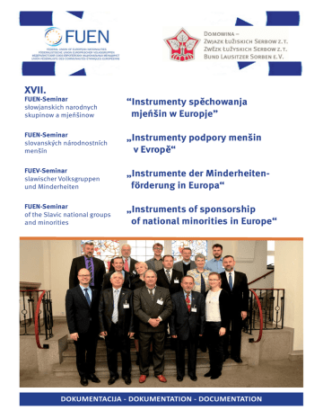 XVII. FUEN-Seminar słowjanskich narodnych skupinow a mjeńšinow “Instrumenty spěchowanja mjeńšin w Europje” FUEN-Seminar slovanských národnostních menšín „Instrumenty podpory menšin v Evropě“ FUEV-Seminar slawischer Volksgruppen und Minderheiten „Instrumente der Minderheitenförderung in Europa“ FUEN-Seminar of the Slavic national groups and minorities „Instruments of sponsorship of national minorities in Europe“ 6. - 9. 11. 2012 w Budyšinje - pola Łužiskich Serbow w Němskej in Bautzen - bei den Lausitzer Sorben in Deutschland DOKUMENTACIJA - DOKUMENTATION - DOCUMENTATION 1 Program štwórtk, 06.11.2014 wot 12.00 hodź. přijězd 18.00 hodź. wječer 19:30 kulturny program balet „Kupa zabytych“ w NSLDź pjatk, 07.11.2014 8.00 hodź. 9.00 hodź. 12.30-13.30 hodź. 13.30 hodź. 18.30 hodź. 20:00 hodź. snědań wotewrjenje seminara diskusija wobjed wodźenje po měsće pokročowanje seminara wječer kulturny program - dźiwadło „Wódny muž“ w Serbskim domje sobota, 08.11.2014 7.30 hodź. snědań 9.30 hodź. pokročowanje seminara w Krabatowym młynje w Čornym Chołmcu 12.00 hodź. wobjed w serbskim hosćencu „Wjelbik“ w Budyšinje 14.00-16.30 hodź. pokročowanje seminara generalny konsul dr. Kuděla - „Aktualna hodźina“ diskusija 18.00 hodź. 19.00 hodź. zakónčacy wječor w Serbskim domje kulturny program njedźelu, 09.11.2014 8.00 hodź. snědań wotjězd 2 Programm Donnerstag, 06.11.2014 ab 12.00 Uhr Anreise ab 18.00 Uhr Abendessen im Best Western 19:30 Kulturprogramm: Ballett „Kupa zabytych“ im Deutsch-Sorbischen Volkstheater Bautzen Freitag, 07.11.2014 ab 8.00 Uhr Frühstück 9.00 Uhr Eröffnung des Seminars im Serbski dom (Kulturprogram Marta und Hanka) Dawid Statnik, Vorsitzender der Domowina – Begrüßung Marko Schieman (Mitglied des Sächsischen Landtages) Perušić, Jelka (Minderheitenförderung des BKA für Bgld. Kroaten) Damir Malina (Financing of national minorities in Croatia) Diskussion 12.30-13.30 Uhr Mittagessen 13.30 Uhr Stadtführung (in sorbischer, tschechischer und deutscher Sprache) danach Fortsetzung des Seminars 18.30 Uhr Abendessen 20:00 Uhr Kulturprogramm - Aufführung des dreisprachigen Theaterstücks „Wódny muž“ im Haus der Sorben Bautzen Sonnabend, 08.11.2014 7.30 Uhr Frühstück 9.30 Uhr Fortsetzung des Seminars in der Krabatmühle Schwarzkollm, danach Führung 12.00 Uhr Mittagessen im Sorbischen Restaurant „Wjelbik“ (traditionellen sorbischen Speisen) 14.00-16.30 Uhr Fortsetzung des Seminars Generalkonsul, Dr. Kuděla („Aktuelle Stunde“) Diskussion 18.00 Uhr 19.00 Uhr Abschlussabend mit Verpflegung im Serbski Dom Kulturbeiträge: Fabian Kaulfürst Domowina Ortsgruppe Bautzen Sonntag, 09.11.2014 8.00 Uhr Frühstück danach Abreise 3 4 Bernhard Ziesch, Vizepräsident der FUEV Bericht über die Durchführung des XVII. Seminars der Arbeitsgruppe slawischer Minderheiten der FUEV in Bautzen/Budyšin zum Umgang und Einsatz von EU-Fördermi eln in verschiedensten sächsischen Programmen. Mit Hilfe einer PowerPoint-Präsenta on informierte der Abgeordnete auch über die gesamtwirtscha liche Situa on und die Verflechtung der Koopera onsbeziehungen, vor allem in der Wirtscha und im kulturellen Bereich mit unseren slawischen Nachbarländern. In einer anschließenden regen Diskussion gab es zahlreiche konkrete Anfragen der Teilnehmer zum Umgang und der Beantragung von Fördermi eln aus EU-Förderfonds. Ein zweiter Vortrag von Madlena Kowar stand unter dem Thema „EU-Förderung von Minderheiten“. Grundlage für diesen Vortrag waren die Chartas der FUEV zum Erasmus-Plus-Programm sowie der Förderung der zivilgesellscha lichen Projekte durch das Programm „Europa für Bürger“. Im Anschluss haben weitere Teilnehmer des Seminars Kurzberichte über die Förderung ihrer Minderheit und die Möglichkeit einer Inanspruchnahme aus EU-Fördertöpfen berichtet. In der Zeit vom 6. bis zum 9. November 2014 wurde das diesjährige Seminar der Arbeitsgruppe slawischer Minderheiten der FUEV in Bautzen bei den Lausitzer Sorben durchgeführt. Thema des Seminars war „Instrumente der Minderheitenförderung in Europa“. Der vorgesehene Programmablauf des Seminars wurde an allen Tagen in seiner bestä gten Form umgesetzt. Als erstes informierte Jelka Perušić über die Situaon der Kroaten im Burgenland in Österreich. Hierbei viel auf, dass die Grundversorgung und Förderung der kroa schen Minderheit durch Österreich sehr bescheiden und schwierig ist. Eine Förderung ausschließlich auf Projektbasis bewirkt, dass nachhal ge langfris ge Projekte in aller Regel nicht angegangen werden können. Die Verschuldung durch Kreditaufnahme ist für Minderheitenverbände keine grei are Lösung auf Dauer. Auch wiederspiegelt sich erneut das Erfordernis poli schen Druck aufzubauen, damit Österreich die Minderheiten ins tu onell fördert und so Grundvoraussetzung für weitere Projek örderanträge erfüllt. Am Anreisetag, am Donnerstag, den 06.11.2014 nutzten einige Gäste die Möglichkeit des Besuches der Balle aufführung des Sorbischen Na onal-Ensembles im Deutsch-Sorbischen Volkstheater unter dem Titel „Die Insel der Vergessenen“. Am Freitagmorgen zur Eröffnung des Seminars begrüßten wir unter anderem den Abgeordneten Marko Schiemann, Mitglied des Sächsischen Landtages. Der Vizepräsident der FUEV, Bernhard Ziesch und der Vorsitzende der Domowina, David Statnik, begrüßten die Delegierten und Gäste des Seminars in Bautzen. Der Vertreter der Tschechischen Minderheit in Kroa en, Herr Damir Malina, informierte die Teilnehmer über deren Situa on im Bereich der finanziellen Förderung ihrer Projektarbeiten und Vorhaben. Auch hier widerspiegelte sich eine mangelha e Unterstützung seitens der Kroa schen Regierung. Bilaterale Vertragsbeziehungen zu Tschechien gibt es in dieser Form nicht, so dass auch eine Unterstützung des „Mu erlandes“ bei Projektvorhaben Im Einführungsvortrag von Marko Schiemann erhielten 