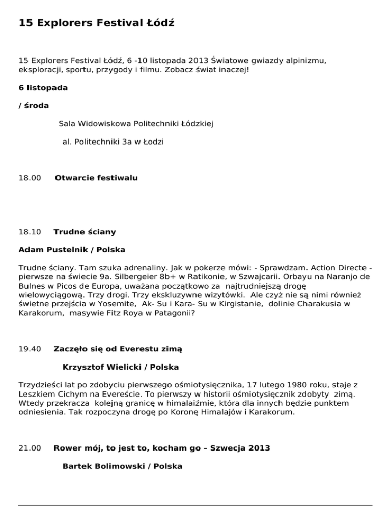 15 Explorers Festival Łódź 15 Explorers Festival Łódź, 6 -10 listopada 2013 Światowe gwiazdy alpinizmu, eksploracji, sportu, przygody i filmu. Zobacz świat inaczej! 6 listopada / środa Sala Widowiskowa Politechniki Łódzkiej al. Politechniki 3a w Łodzi 18.00 Otwarcie festiwalu 18.10 Trudne ściany Adam Pustelnik / Polska Trudne ściany. Tam szuka adrenaliny. Jak w pokerze mówi: - Sprawdzam. Action Directe pierwsze na świecie 9a. Silbergeier 8b+ w Ratikonie, w Szwajcarii. Orbayu na Naranjo de Bulnes w Picos de Europa, uważana początkowo za najtrudniejszą drogę wielowyciągową. Trzy drogi. Trzy ekskluzywne wizytówki. Ale czyż nie są nimi również świetne przejścia w Yosemite, Ak- Su i Kara- Su w Kirgistanie, dolinie Charakusia w Karakorum, masywie Fitz Roya w Patagonii? 19.40 Zaczęło się od Everestu zimą Krzysztof Wielicki / Polska Trzydzieści lat po zdobyciu pierwszego ośmiotysięcznika, 17 lutego 1980 roku, staje z Leszkiem Cichym na Evereście. To pierwszy w historii ośmiotysięcznik zdobyty zimą. Wtedy przekracza kolejną granicę w himalaiźmie, która dla innych będzie punktem odniesienia. Tak rozpoczyna drogę po Koronę Himalajów i Karakorum. 21.00 Rower mój, to jest to, kocham go – Szwecja 2013 Bartek Bolimowski / Polska Julianna Twardowska / Polska Od początku mieli ważne argumenty, żeby wyruszyć rowerem przez Szwecję. Byli nowicjuszami rowerowymi. W nogach mieli tylko po jakieś dwieście przejechanych kilometrów. Żadnego spójnego planu i nic ich nie przerażało. A do tego wyobraźnia eliminowała ze świadomości jakieś kaprysy aury, deszcze, awarie, trudności w drodze. No, ale to właśnie jest piękne. Entuzjazm młodości. Nie kalkulowali. Po prostu pojechali. Pokonali ponad dwa tysiące ciężkich kilometrów. Okrzepli i mogą zostać prawdziwymi podróżnikami na rowerach. 22.00 zakończenie wieczoru 7 listopada / czwartek Sala Widowiskowa Politechniki Łódzkiej al. Politechniki 3a w Łodzi 18.00 Bliskość Kaukazu Rafał Kowalczyk / Polska Wyniosłe, potężne góry, oplecione niskimi pasmami. Doliny zamieszkałe przez różne nacje. Mozaika państewek.Wojenny tygiel. To Kaukaz. Mimo skomplikowanej sytuacji, niezwykle interesujące miejsce do odkrywania przez wszystkich. Tych, którzy szukają adrenaliny w górach, wyciszenia w przysiółkach i miasteczkach, gdzie codzienne życie ujmuje prostotą i zwolnionym rytmem, i tych stroskanych powtarzającymi się wojnami, których skutki widoczne są niestety w wielu miejscach. 19.25 Señora Puna w białej sukience… Wojtek Lewandowski / Polska Jacek Sidlarewicz / Polska Pozornie uśpiony płaskowyż Puna de Atacama, w Andach. Bezkres i nieskończoność wolnej przestrzeni. Potężne wulkany, dziwaczne formy skalne, mozaika barw. Naga, posępna, milcząca kraina. Szokującą jednak zmiennością i gwałtownością zjawisk ośmioosobową, polską wyprawę, wytrwale podążającą śladami II Polskiej Wyprawy Andyjskiej 1936/37. 20.45 Dookoła świata z pomocą Słońca Raphaël Domján / Szwajcaria Słońce. Gwiazda, od której całkowicie zależymy i zaczynamy to rozumieć coraz lepiej. Nauczyliśmy się również korzystać z jej energii. Ale jesteśmy na początku drogi. Projekt opłynięcia naszego globu wielką łodzią napędzaną wyłącznie energią słoneczną, oprócz świetnej przygody, był swoistym doświadczeniem. 27 września 2010 roku, dokładnie o 14. 00, Planet Solar opuściła port w Monaco. Rozpoczął się pierwszy rejs dookoła Ziemi z pomocą Słońca. Pomysły rodzą się i najczęściej umierają. Tym razem entuzjazm zapaleńców okazał się siłą, która uporała się ze wszystkimi problemami. Czteroosobowa załoga przez pięćset osiemdziesiąt cztery dni, dwadzieścia trzy godziny i trzydzieści jeden minut, miała świadomość udziału w wydarzeniu szczególnym. Pokonując kolejne mile morskie tworzyli historię eksploracji i jak prawdziwi pionierzy wskazali drogę, którą zapewne ludzkość będzie podążać. 21.45 zakończenie wieczoru 8 listopada / piątek 9.20 Wielka Lekcja Geografii Aula Czerwona Wydziału Prawa i Administracji Uniwersytetu Łódzkiego ul. Kopcińskiego 8/12 w Łodzi współorganizator: Wydział Nauk Geograficznych Uniwersytetu Łódzkiego 9.20 Laboratorium Przygody Sala Widowiskowa Politechniki Łódzkiej al. Politechniki 3a w Łodzi współorganizator: Politechnika Łódzka 11.30 Ekstremalny dokument Warsztaty fotograficzne i filmowe PWSFTviT w Łodzi ul. Targowa 61/63 w Łodzi współpraca: Państwowa Wyższa Szkoła Filmowa, Telewizyjna i Teatralna w Łodzi Pascal Tournaire / Francja Rick Deppe / Wlk. Brytania Sala Widowiskowa Politechniki Łódzkiej al. Politechniki 3a w Łodzi 18.00 Jak to u Hucułów jest Piotr Kłapyta i Justyna Cząstka - Kłapyta / Polska Co jest takiego na Huculszczyźnie, że budzi ona tak wyjątkowe zainteresowanie? Góry? Ludzie? Kultura? Obrzędy? Tradycja? Poszukiwanie własnej odpowiedzi wymaga czasu i zrozumienia, bo im bardziej wnika się w ten magiczny, huculski świat, tym trudniej pozostać wobec niego obojętnym. Huculszczyzna nie jest krzykliwa. Nie epatuje. Może właśnie dlatego ciągnie tam ludzi. 19.20 Z Rakaposhi do K2 Dalibor Carbol / Czechy Superekstremalny wyczyn w powietrzu. Lot paralotnią nad Karakorum. Pośród ośmiotysięczników, aż pod majestatyczne K2. Pod nogami górski horror. Potężne urwiska, przepaściste ściany i ciemne czeluści lodowcowych szczelin w milczeniu obserwują intruzów. Każdy ruch musi być całkowicie kontrolowany, bo i tak mało zależy tu od człowieka. 20.45 Himalaje na 4 łapach Przemek Bucharowski / Polska Agata Włodarczyk / Polska Diuna / wilczak czechosłowacki Niczego nie planowali. Jakiś impuls i sytuacja powodują, że pakują plecaki, przekręcają klucz i z Diuną ruszają przez dwanaście dolin Himalajów Garhwalu. Ponad pięćset kilometrów, w pięćdziesiąt pięć dni. Od Munsiari, aż do źródeł Gangesu. Codziennie w gó