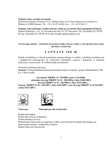 Podmiot, który uzyskał zezwolenie: Du Pont de Nemours (France) S.A.S., Défense Plaza 23/25, Rue Delariviere Lefoullon La Défense 9, 92800 Puteaux, Tel.: +33-1-41-97-44-00, Fax.: +33-1-41-97-44-11 Podmiot, wprowadzający środek ochrony roślin na terytorium Rzeczypospolitej Polskiej: DuPont Poland Sp. z o.o., ul. Powązkowska 44c, 01-797 Warszawa, Tel.: (0-prefiks-22) 320 09 00, fax: (0-prefiks-22) 320 09 50, e-mail: [email protected] Przestrzegaj etykiety – instrukcji stosowania środka ochrony roślin w celu ograniczenia ryzyka dla ludzi i środowiska L A N N A T E 2 0 0 SL Środek owadobójczy w formie koncentratu rozpuszczalnego w wodzie, o działaniu kontaktowym i żołądkowym przeznaczony do zwalczania szkodników ssących i gryzących w roślinach rolniczych i warzywnych. W roślinie działa systemicznie. Zawartość substancji aktywnej: metomyl /N-(metylokarbamoiloksy)acetoimidan metylu/ (związek z grupy karbaminianów) 200 g w 1 litrze środka. Zezwolenie MRiRW Nr 778/2000 z dnia 12.10.2000r. zmienione decyzją MRiRW Nr R - 386/2003p z dnia 18.08.2003r. decyzją MRiRW Nr R - 146/2004o z dnia 25.03.2004 r., decyzją MRiRW Nr R - 164/2007 z dnia 24.04.2007r. oraz decyzją MRiRW Nr R-342/2007 z dnia 18.07.2007 r. Toksyczny Niebezpieczny dla środowiska Produkt łatwopalny. Działa toksycznie po połknięciu. Działa drażniąco na oczy. Działa bardzo toksycznie na organizmy wodne, może powodować długo utrzymujące się niekorzystne zmiany w środowisku wodnym. Bardzo toksyczny dla pszczół. 1 Uwaga! 1. Zabrania się stosowania środka w strefie bezpośredniej ochrony ujęć wody oraz na terenie uzdrowisk, otulin parków narodowych i rezerwatów 2. Nie zanieczyszczać wód środkiem ochrony roślin i jego opakowaniem. ZAKRES STOSOWANIA, TERMINY I DAWKI Rośliny rolnicze burak cukrowy, burak pastewny -mszyca trzmielinowo-burakowa. Zalecana dawka: 0,7 l/ha. Stosować przed wystąpieniem kolonii mszyc. -pchełka burakowa. Zalecana dawka: 0,7 l/ha. Zabieg wykonać po pojawieniu się chrząszczy na młodych roślinach lub po zauważeniu pierwszych uszkodzeń. -śmietka ćwiklanka. Zalecana dawka: 0,7 l/ha. Opryskiwać w okresie wylęgania się larw pierwszego pokolenia, zgodnie z sygnalizacją. -płaszczyniec burakowy. Zalecana dawka: 0,7 l/ha. Zabieg wykonać zgodnie z sygnalizacją. Zalecana ilość wody: 150-400 l/ha. Zalecane opryskiwanie: średniokropliste. chmiel. -mszyca śliwowo-chmielowa. Zalecane stężenie: 0,12%.(120 ml środka w 100 litrach wody). Zalecana ilość cieczy użytkowej: 1500-3000 l/ha w zależności od wysokości i zagęszczenia roślin na plantacji. Zabieg przed kwitnieniem wykonać, gdy średnia liczba mszyc bezskrzydłych na 1 liściu 2 wynosi 50-100, a po kwitnieniu 5-10. Rośliny warzywne (w gruncie) kapusta późna, kapusta brukselska -mszyca kapuściana. Zalecana dawka: 0,9 l/ha. Opryskiwać po pojawieniu się pierwszych kolonii mszyc. -gąsienice tantnisia krzyżowiaczka, piętnówki kapustnicy. Zalecana dawka: 0,9 l/ha. Opryskiwać w okresie masowego wylęgania się gąsienic. pomidor -mszyce. Zalecana dawka: 0,9 l/ha. Zalecana ilość wody 200-600 l/ha. Zalecane opryskiwanie: średniokropliste. Rośliny warzywne (pod osłonami) pomidor, ogórek, papryka -mączlik szklarniowy, mszyce. Zalecane stężenie: 0,1%. (100 ml środka w 100 litrach wody). Zalecana ilość cieczy użytkowej: 1000-2000 l/ha w zależności od wysokości i zagęszczenia roślin. UWAGI: 1. Środek działa najskuteczniej w temperaturze powyżej 150 C. 2. Środek trujący dla ludzi - podczas pracy zachować szczególne środki ostrożności. 3. Środka nie stosować w ogrodach działkowych i przydomowych, 4. W celu ochrony pszczół i innych owadów zapylających nie stosować: a. na rośliny uprawne w czasie kwitnienia b. kiedy na uprawie chronionej występują kwitnące chwasty 3 c. w miejscach, gdzie pszczoły mają pożytek, a także na roślinach, których kwitnienie może rozpocząć się przed upływem okresu prewencji, 5. Przed zastosowaniem środka w ogórku na każdej uprawianej po raz pierwszy odmianie wykonać próbny zabieg w celu sprawdzenia czy w ciągu 7 dni nie wystąpiły objawy uszkodzenia roślin. OKRES KARENCJI (okres od dnia ostatniego zabiegu do dnia zbioru roślin przeznaczonych do konsumpcji): burak cukrowy i pastewny - 14 dni chmiel, kapusta późna, kapusta brukselska - 7 dni pomidor, ogórek, papryka - 3 dni. OKRES PREWENCJI DLA PSZCZÓŁ (okres zapobiegający zatruciu): 30 dni. OKRES PREWENCJI DLA LUDZI (okres zapobiegający zatruciu): 24 godziny OKRES PREWENCJI DLA ZWIERZĄT (okres zapobiegający zatruciu): NIE DOTYCZY SPORZĄDZANIE CIECZY UŻYTKOWEJ Przed przystąpieniem do sporządzenia cieczy użytkowej dokładnie ustalić potrzebną jej ilość. Odmierzoną ilość środka wlać do zbiornika opryskiwacza napełnionego częściowo wodą (z włączonym mieszadłem) i uzupełnić wodą do potrzebnej ilości. Po wlaniu środka do zbiornika opryskiwacza nie wyposażonego w mieszadło hydrauliczne ciecz mechanicznie wymieszać. Opróżnione opakowania przepłukać trzykrotnie wodą, a popłuczyny wlać do zbiornika opryskiwacza z cieczą użytkową. Ciecz użytkową zużyć bezpośrednio po sporządzeniu. Po pracy aparaturę dokładnie wymyć. 4 PRZECHOWYWANIE Przechowywać z dala od źródeł ciepła. Przechowywać pojemnik szczelnie zamknięty w miejscu dobrze wentylowanym. Przechowywać pod zamknięciem i chronić przed dziećmi. Nie przechowywać razem z żywnością, napojami i paszami dla zwierząt. WARUNKI BEZPIECZNEGO STOSOWANIA ŚRODKA OCHRONY ROŚLIN Nie jeść i nie pić oraz nie palić tytoniu podczas stosowania produktu. Zanieczyszczone oczy przemyć natychmiast dużą ilością wody i zasięgnąć porady lekarza. Nosić odpowiednią odzież ochronną, odpowiednie rękawice ochronne i okulary lub ochronę twarzy. Unikać zanieczyszczenia oczu W przypadku awarii lub jeżeli źle się poczujesz, niezwłocznie zasięgnij porady lekarz