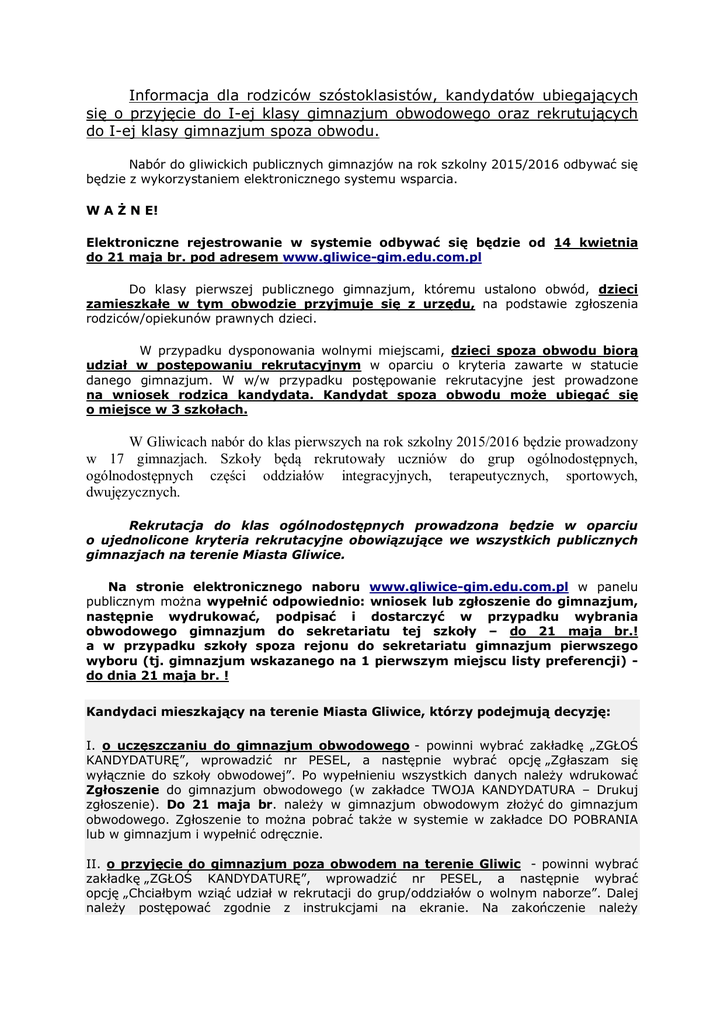 Informacja dla rodziców szóstoklasistów, kandydatów ubiegających się o przyjęcie do I-ej klasy gimnazjum obwodowego oraz rekrutujących do I-ej klasy gimnazjum spoza obwodu. Nabór do gliwickich publicznych gimnazjów na rok szkolny 2015/2016 odbywać się będzie z wykorzystaniem elektronicznego systemu wsparcia. W A Ż N E! Elektroniczne rejestrowanie w systemie odbywać się będzie od 14 kwietnia do 21 maja br. pod adresem www.gliwice-gim.edu.com.pl Do klasy pierwszej publicznego gimnazjum, któremu ustalono obwód, dzieci zamieszkałe w tym obwodzie przyjmuje się z urzędu, na podstawie zgłoszenia rodziców/opiekunów prawnych dzieci. W przypadku dysponowania wolnymi miejscami, dzieci spoza obwodu biorą udział w postępowaniu rekrutacyjnym w oparciu o kryteria zawarte w statucie danego gimnazjum. W w/w przypadku postępowanie rekrutacyjne jest prowadzone na wniosek rodzica kandydata. Kandydat spoza obwodu może ubiegać się o miejsce w 3 szkołach. W Gliwicach nabór do klas pierwszych na rok szkolny 2015/2016 będzie prowadzony w 17 gimnazjach. Szkoły będą rekrutowały uczniów do grup ogólnodostępnych, ogólnodostępnych części oddziałów integracyjnych, terapeutycznych, sportowych, dwujęzycznych. Rekrutacja do klas ogólnodostępnych prowadzona będzie w oparciu o ujednolicone kryteria rekrutacyjne obowiązujące we wszystkich publicznych gimnazjach na terenie Miasta Gliwice. Na stronie elektronicznego naboru www.gliwice-gim.edu.com.pl w panelu publicznym można wypełnić odpowiednio: wniosek lub zgłoszenie do gimnazjum, następnie wydrukować, podpisać i dostarczyć w przypadku wybrania obwodowego gimnazjum do sekretariatu tej szkoły – do 21 maja br.! a w przypadku szkoły spoza rejonu do sekretariatu gimnazjum pierwszego wyboru (tj. gimnazjum wskazanego na 1 pierwszym miejscu listy preferencji) do dnia 21 maja br. ! Kandydaci mieszkający na terenie Miasta Gliwice, którzy podejmują decyzję: I. o uczęszczaniu do gimnazjum obwodowego - powinni wybrać zakładkę „ZGŁOŚ KANDYDATURĘ”, wprowadzić nr PESEL, a następnie wybrać opcję „Zgłaszam się wyłącznie do szkoły obwodowej”. Po wypełnieniu wszystkich danych należy wdrukować Zgłoszenie do gimnazjum obwodowego (w zakładce TWOJA KANDYDATURA – Drukuj zgłoszenie). Do 21 maja br. należy w gimnazjum obwodowym złożyć do gimnazjum obwodowego. Zgłoszenie to można pobrać także w systemie w zakładce DO POBRANIA lub w gimnazjum i wypełnić odręcznie. II. o przyjęcie do gimnazjum poza obwodem na terenie Gliwic - powinni wybrać zakładkę „ZGŁOŚ KANDYDATURĘ”, wprowadzić nr PESEL, a następnie wybrać opcję „Chciałbym wziąć udział w rekrutacji do grup/oddziałów o wolnym naborze”. Dalej należy postępować zgodnie z instrukcjami na ekranie. Na zakończenie należy wydrukować Wniosek. Do 21 maja br. należy w szkole pierwszego wyboru złożyć Wniosek o przyjęcie do gimnazjum wydrukowany z systemu, po założeniu konta. Wniosek można pobrać także w systemie w zakładce DO POBRANIA lub w gimnazjum i wypełnić odręcznie. III. o uczęszczaniu do gimnazjum poza terenem Gliwic - należy wybrać zakładkę „ZGŁOŚ KANDYDATURĘ”, wprowadzić nr PESEL, a następnie wybrać opcję „Nie chcę brać udziału w rekrutacji”, a także rezygnuję z miejsca w mojej szkole obwodowej. Należy wpisać nazwę i adres szkoły w której kandydat będzie realizował obowiązek szkolny i zgłosić ten fakt w gimnazjum obwodowym. IV. Kandydaci mieszkający poza terenem Miasta Gliwice starają się o przyjęcie na zasadach opisanych w pkt. 2 (tak, jak kandydaci do gimnazjum poza obwodem). Innym sposobem zapisania kandydata do gimnazjum jest wydrukowanie wniosku lub zgłoszenia z systemu, wypełnienie odręczne, podpisanie i dostarczenie do sekretariatu gimnazjum wskazanego na 1 pierwszym miejscu listy preferencji. Wniosek lub zgłoszenie do szkoły obwodowej można też pobrać i wypełnić w sekretariacie gimnazjum. Pracownicy gimnazjum pierwszego wyboru lub gimnazjum obwodowego, weryfikują uzupełnione dane we wniosku lub zgłoszeniu, następnie potwierdzają je w systemie. Potwierdzenie danych w systemie przez gimnazjum pierwszego wyboru powoduje zablokowanie możliwości wprowadzania zmian w formularzu. Aby wprowadzić zmiany należy zgłosić się do placówki pierwszego wyboru, w celu wycofania potwierdzenia wniosku/zgłoszenia w systemie ! Kandydat do gimnazjum, które objęte jest systemem rekrutacji elektronicznej, ma możliwość dokonania wyboru trzech szkół. Jeśli miejscem zamieszkania kandydata jest miejscowość Gliwice, wówczas należy również wskazać placówkę obwodową. W przypadku niezakwalifikowania się kandydata do żadnej ze wskazanych na liście preferencji gimnazjów, kandydat zostanie zakwalifikowany do gimnazjum obwodowego. Elektronicznym naborem nie są objęci uczniowie posiadający orzeczenie o potrzebie kształcenia specjalnego, którzy starają się o przyjęcie do gimnazjum specjalnego lub oddziału integracyjnego oraz uczniowie przedkładający świadectwo uzyskane za granicą. Na stronie naboru do gimnazjum, po lewej stronie w zakładce umieszczone zostały: „zasady naboru”, „informator o ofercie”, „terminarz”, „pliki do pobrania, instrukcja”. KRYTERIA REKRUTACJI: KRYTERIA NABORU DO GIMNAZJUM 2015 - GLIWICE Lp. Kryteria Sposób dokumentowania Liczba punktów 1. Oceny na świadectwie ukończenia szkoły podstawowej z następujących zajęć edukacyjnych: język polski, język obcy, matematyka, historia i kopia świadectwa ukończenia szkoły społeczeństwo, przyroda (oceny przeliczane sa wg. podstawowej (oryginał) punktacji: celujący – 10 pkt, bardzo dobry - 8 pkt, dobry - 6 pkt, dostateczny - 4 pkt, dopuszczający 2 pkt) 2. Wyniki sprawdzianu po klasie szóstej: cześć przedmiotowa - 1%=0,4 pkt, cześć językowa 1%=0,2 pkt kopia zaświadczenia OKE o szczegółowych wynikach sprawdzianu przeprowadzonego w