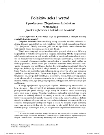 Polaków seks i wstyd Z profesorem Zbigniewem Izdebskim rozmawiaj¹ Jacek Grêbowiec i Arkadiusz Lewicki1 Jacek Grębowiec: Kiedy wstyd staje się problemem, z którym musimy zwrócić się do terapeuty? Zbigniew Izdebski: Wówczas kiedy mamy poczucie, że sobie z nim nie radzimy. Czasem jednak ktoś nie jest świadomy, że to wstyd go paraliżuje. Mówi: „Taki już jestem”. Wtedy otoczenie, jeśli jest mu życzliwie, może zakomunikować wprost, że coś niepokojącego się z nim dzieje. Wstyd może dotyczyć różnych osób w wielu grupach wiekowych. Mówimy na przykład o wstydzie związanym z inicjacją seksualną. Młody chłopak może mieć przeświadczenie, że coś mu nie wyjdzie w kontaktach seksualnych, wstydzi się podejmować bardziej zaawansowane relacje z dziewczyną. Jeżeli wstydzi się w granicach zdrowego rozsądku, wszystko jest w porządku, jeżeli zaś boi się dotknąć partnerki, mimo że ona jest otwarta na rozmaite formy bliskości: całowanie, pieszczoty czy współżycie, dorabia do swoich zahamowań jakąś filozofię dotyczącą kobiety, jej wartości, nietykalności, to możemy mieć wówczas problem. Nie chce go racjonalizować, pokazuje, że nie przeżywa lęku, lecz postępuje zgodnie z pewną koncepcją. Pytam więc kogoś, kto ma dwadzieścia osiem czy trzydzieści lat, czy podjął współżycie, a on mówi, że nie, tłumaczy się jednak, że się nie wstydzi, i szuka potwierdzenia, że przyjęta przez niego koncepcja jest słuszna. Wtedy samo jego przyjście po poradę jest sygnałem, że boryka się z tym problemem. W mojej specjalności łączę wstyd z lękiem. Możemy się zastanawiać, co było pierwsze — lęk czy wstyd, co jest czego przyczyną — ale efekt jest jeden: przeżywanie lęku przed relacją z drugą osobą. W ostatnich latach coraz więcej mówi się i pisze o seksie. Wzrasta świadomość seksualna kobiet, która zresztą nie bierze się z dobrej edukacji seksualnej w szkole, ale przede wszystkim z kolorowych czasopism kobiecych. Te gazety wzmocniły samoświadomość kobiet, również w zakresie ich praw. Ale to, że wzrosła świadomość seksualna kobiet, nie oznacza, że mężczyźni wiedzą dziś więcej o seksie. W związku z tym niektórzy zaczynają się wstydzić, bać się, że coś może im nie wyjść. Jeżeli więc kobieta dowiaduje się z kolorowych pism, że ma prawo do orgazmu (w sensie edukacyj1 Wywiad pierwotnie ukazał się w maju 2011 roku w piątym zeszycie czasopisma naukowo-publicystycznego „Znaczenia. Kultura — Komunikacja — Społeczeństwo” wydawanego przez Instytut Dziennikarstwa i Komunikacji Społecznej UWr. Przedruk za zgodą redakcji. Colloquia Anthropologica et Communicativa, Ciało cielesne, 2011 © for this edition by CNS Coll_Antropo_4_III_kor .indd 237 2011-09-12 14:34:05 238 Polaków seks i wstyd nym do osiągnięcia takiej świadomości sam się zresztą przez wiele lat przyczyniałem), pouczono ją w zakresie metodyki seksualnej: pieszczot, gry wstępnej, lubrykacji pochwy itd., a następnie zostawia to pismo na stole, otwarte na odpowiedniej stronie, to jej mąż czy partner zaczyna się zastanawiać, co takiego się wydarzyło, że żona mu to pismo podrzuca. Dochodzi więc do wniosku, że się nie sprawdza. To powoduje, że niektórzy mężczyźni zaczynają rezygnować z aktywności seksualnej, bo wstydzą się, że w ocenie partnerki mogli się nie sprawdzić. A jednocześnie wstydzą się wprost o to zapytać. Pojawia się więc następny problem — związany z komunikacją w relacjach. Coraz więcej mężczyzn, również młodych, przeżywa lęki przed podejmowaniem aktywności seksualnej. Żeby było jasne — dotyczy to tej grupy mężczyzn, którzy mają większy poziom wrażliwości, są lepiej wykształceni, analizują swoje życie seksualne i nie chcą go sprowadzać do tego, jak „wejść” i „wyjść”, do prostej mechaniki. Arkadiusz Lewicki: Oznacza to, że obecna dyskursywizacja erotyki w mediach, w Internecie nie przekłada się na otwartość mówienia o seksie, czy to w sytuacjach terapeutycznych, czy w relacjach partnerskich? Z.I.: To się przekłada na to, że ludzie myślą, że seks jest taki szalenie nas otaczający, że wokół seksu toczy się nasze życie, że robimy się coraz bardziej otwarci na relacje seksualne. Ja natomiast od bardzo wielu lat upowszechniam inną koncepcję — koncepcję zdrowia seksualnego. Według Światowej Organizacji Zdrowia zdrowie seksualne związane jest z naszą fizjologią i biologią, ale także z procesem rozwoju osobowości, komunikowaniem i miłością. Problem polega na tym, że to, co nam, Polakom, najlepiej wychodzi w seksie, to opowiadanie o nim dowcipów. Nie nauczyliśmy się natomiast mówić o naszej seksualności, o wzajemnych oczekiwaniach, pragnieniach. W czasopismach coraz częściej pisze się o seksie, Internet kapie informacjami o seksie, ale mają one na ogół charakter zwulgaryzowany lub wyraźnie sensacyjny. My tak naprawdę nie zawsze wiemy, co jest wiarygodne. Podstawowym źródłem wiedzy o seksie dla młodych, i nie tylko młodych, ludzi są dziś materiały przede wszystkim pornograficzne, nawet nie erotyczne. Gdy odbiorca widzi te długo trwające stosunki, wielokrotnie osiągane orgazmy i wytryski, nie myśli o filmowej fikcji, o montażu i aktorskiej obsadzie, dobranej nie za sprawą walorów intelektu, lecz na przykład długości penisa. Mimo wszystko zaczyna porównywać swoje doświadczenia z tym na ekranie. W pewnym momencie mówi sobie: „Jak długo!”, czasem spogląda na swojego penisa i przyrównuje do tego, który widzi na filmie, i już tu u niektórych pojawia się pewien niepokój, a za tym idzie, wstyd. Nawet jeśli partnerka mówi, że w ich współżyciu jest wszystko w porządku, mężczyzna zaczyna mieć wątpliwości. Dość często, gdy pytam pacjenta, czy partnerka przeżywa orgazm, on odpowiada: „Chyba przeżywa. Chyba”. Z tego, jak opisuje reakcje partne