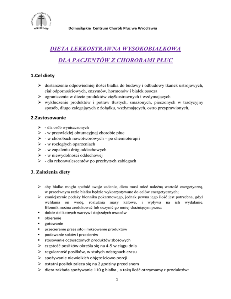 Dolnośląskie Centrum Chorób Płuc we Wrocławiu DIETA LEKKOSTRAWNA WYSOKOBIAŁKOWA DLA PACJENTÓW Z CHOROBAMI PŁUC 1.Cel diety  dostarczenie odpowiedniej ilości białka do budowy i odbudowy tkanek ustrojowych, ciał odpornościowych, enzymów, hormonów i białek osocza  ograniczenie w diecie produktów ciężkostrawnych i wzdymających  wykluczenie produktów i potraw tłustych, smażonych, pieczonych w tradycyjny sposób, długo zalegających z żołądku, wzdymających, ostro przyprawionych, 2.Zastosowanie  - dla osób wyniszczonych  - w przewlekłej obturacyjnej chorobie płuc      - w chorobach nowotworowych – po chemioterapii - w rozległych oparzeniach - w zapaleniu dróg oddechowych - w niewydolności oddechowej - dla rekonwalescentów po przebytych zabiegach 3. Założenia diety  aby białko mogło spełnić swoje zadanie, dieta musi mieć należną wartość energetyczną, w przeciwnym razie białko będzie wykorzystywane do celów energetycznych;  zmniejszenie podaży błonnika pokarmowego, jednak pewna jego ilość jest potrzebna, gdyż wchłania on wodę, rozluźnia masy kałowe, i wpływa na ich wydalanie. Błonnik można zredukować lub uczynić go mniej drażniącym przez:  dobór delikatnych warzyw i dojrzałych owoców  obieranie  gotowanie  przecieranie przez sito i miksowanie produktów  podawanie soków i przecierów  stosowanie oczyszczonych produktów zbożowych      częstość posiłków określa się na 4-5 w ciągu dnia regularność posiłków, w stałych odstępach czasu spożywanie niewielkich objętościowo porcji ostatni posiłek zaleca się na 2 godziny przed snem dieta zakłada spożywanie 110 g białka , a taką ilość otrzymamy z produktów: 1 Dolnośląskie Centrum Chorób Płuc we Wrocławiu 600 ml mleka, 100 g sera twarogowego, 160 g mięsa, ryb, drobiu bez kości, 50 g chudej wędliny, 25 g jaj oraz produktów zbożowych w ilości 280-310 g     aby zwiększyć ilość białka w potrawach można wykorzystać mleko w proszku jako dodatek do potraw (do zaprawiania zup, sosów, do deserów mlecznych, do różnych ciast, napojów), białko jaja kurzego wzbogaca również różne potrawy: takie jak: budynie, pulpety, rolady mięsne, omlety, surówki, desery, a nawet niektóre zupy i potrawy z mąki można wzbogacić w białko z serka homogenizowanego, Ze względu na fakt, występowania w diecie zwiększonej ilości produktów białkowych, zwłaszcza przetworzonych (z mięsa, drobiu, ryb) zwiększa się ilość sodu do ponad 2 g. W takim przypadku należy ograniczyć bądź całkowicie wykluczyć z diety sól kuchenną oraz produkty z dodatkiem NaCl (wędliny, konserwy, marynaty, pieczywo solone). 2