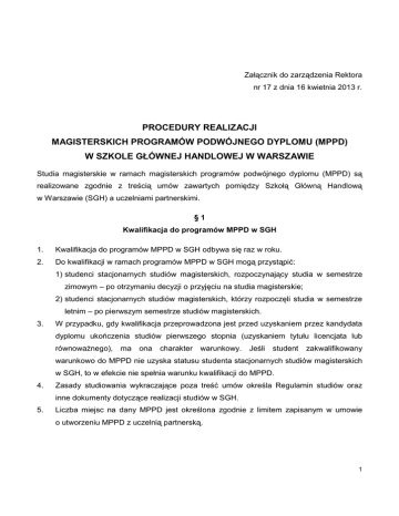 Załącznik do zarządzenia Rektora nr 17 z dnia 16 kwietnia 2013 r. PROCEDURY REALIZACJI MAGISTERSKICH PROGRAMÓW PODWÓJNEGO DYPLOMU (MPPD) W SZKOLE GŁÓWNEJ HANDLOWEJ W WARSZAWIE Studia magisterskie w ramach magisterskich programów podwójnego dyplomu (MPPD) są realizowane zgodnie z treścią umów zawartych pomiędzy Szkołą Główną Handlową w Warszawie (SGH) a uczelniami partnerskimi. §1 Kwalifikacja do programów MPPD w SGH 1. Kwalifikacja do programów MPPD w SGH odbywa się raz w roku. 2. Do kwalifikacji w ramach programów MPPD w SGH mogą przystąpić: 1) studenci stacjonarnych studiów magisterskich, rozpoczynający studia w semestrze zimowym – po otrzymaniu decyzji o przyjęciu na studia magisterskie; 2) studenci stacjonarnych studiów magisterskich, którzy rozpoczęli studia w semestrze letnim – po pierwszym semestrze studiów magisterskich. 3. W przypadku, gdy kwalifikacja przeprowadzona jest przed uzyskaniem przez kandydata dyplomu ukończenia studiów pierwszego stopnia (uzyskaniem tytułu licencjata lub równowaŜnego), ma ona charakter warunkowy. Jeśli student zakwalifikowany warunkowo do MPPD nie uzyska statusu studenta stacjonarnych studiów magisterskich w SGH, to w efekcie nie spełnia warunku kwalifikacji do MPPD. 4. Zasady studiowania wykraczające poza treść umów określa Regulamin studiów oraz inne dokumenty dotyczące realizacji studiów w SGH. 5. Liczba miejsc na dany MPPD jest określona zgodnie z limitem zapisanym w umowie o utworzeniu MPPD z uczelnią partnerską. 1 §2 Zasady kwalifikacji studentów do MPPD 1. Termin składania aplikacji i wykaz wymaganych dokumentów aplikacyjnych na dany MPPD są ogłaszane na stronie internetowej Centrum Programów Międzynarodowych (CPM) (aktualny adres – http://www.sgh.waw.pl/crpm_/so/ddp/). 2. Kwalifikację do MPPD przeprowadzają komisje kwalifikacyjne z udziałem przedstawicieli CPM i Dziekanatu Studium Magisterskiego (DSM) oraz zagranicznej uczelni partnerskiej (jeŜeli wynika to z podpisanej umowy o utworzeniu MPPD lub ustaleń dotyczących kwalifikacji w danym roku akademickim). 3. W procesie kwalifikacji do MPPD w SGH stosuje się uzgodnione przez partnerów MPPD podstawowe kryteria zapisane w umowach o realizacji programów. Szczegółowe informacje dotyczące kwalifikacji do MPPD dostępne są na stronie internetowej (aktualny adres – http://www.sgh.waw.pl/crpm_/so/ddp/). 4. Komisja kwalifikacyjna ma prawo ustalić dodatkowe kryteria kwalifikacyjne na dany MPPD, a takŜe obowiązek określenia i poinformowania o przyjętym systemie wag do uzgodnionych kryteriów oceny kandydatów przed rozpoczęciem rozmów kwalifikacyjnych. 5. Podpisane przez wszystkich członków komisji kwalifikacyjnej listy zakwalifikowanych do programu, komisja kwalifikacyjna przekazuje do DSM. 6. Potwierdzone za zgodność z oryginałem kopie list, o których mowa w § 2 ust. 5, CPM przesyła do uczelni partnerskiej. §3 Rejestracja studentów MPPD w dwóch uczelniach 1. Podstawą przyjęcia studenta MPPD z uczelni zagranicznej na studia w SGH jest podpisana przez koordynatora akademickiego uczelni partnerskiej i przekazana do SGH lista studentów zakwalifikowanych do MPPD. 2. Student zakwalifikowany do MPPD zobowiązany jest złoŜyć dokumenty określone w wewnętrznych aktach prawnych SGH. 3. Podstawą przyjęcia na okres studiów w SGH studentów z uczelni partnerskiej jest decyzja dziekana Studium Magisterskiego (dziekan SM) o przyjęciu studenta uczelni 2 partnerskiej na studia magisterskie w SGH, której wzór stanowi załącznik do procedur realizacji magisterskich programów podwójnego dyplomu (MPPD) w SGH. 4. Student SGH zobowiązany jest do dostarczenia dokumentów wymaganych przez zagraniczną uczelnię partnerską, niezbędnych do rejestracji na okres studiów w tej uczelni. Za uzgodnienie terminu i formy przekazania dokumentów odpowiada w CPM koordynator administracyjny właściwego MPPD w SGH. §4 Zapisy studentów MPPD na zajęcia w SGH 1. Studenci programów MPPD deklarują zapisy na przedmioty realizowane w SGH zgodnie z obowiązującymi w SGH zasadami; przy czym studenci z partnerskich uczelni mają prawo korzystać z pomocy technicznej CPM i DSM. 2. Plan zajęć na dany semestr dla studentów MPPD ustalany jest na podstawie Learning Agreement (LA) opracowanego w oparciu o zapisy umowy o MPPD. 3. Indywidualne kwestie dotyczące planu zajęć dla studentów MPPD wymagają akceptacji dziekana SM. §5 Zasady realizacji programów MPPD w SGH 1. Student MPPD zobowiązany jest do zaliczenia wszystkich przedmiotów i innych elementów planu studiów danego MPPD określonych w umowie o MPPD, np. obowiązkowej praktyki. 2. Student MPPD zwolniony jest w SGH z obowiązkowego uczestnictwa w lektoratach z języków obcych. Student moŜe, na takich samych zasadach jak wszyscy studenci SGH, podjąć naukę języka obcego w SGH realizowaną na studiach magisterskich, jednak na poziomie nie niŜszym niŜ B2. Zdany egzamin z języka obcego wykazywany jest w suplemencie do dyplomu. 3. Student MPPD zobowiązany jest na początku drugiego roku studiów dokonać wyboru jednej z dwóch uczelni w ramach danego MPPD, w której przygotowuje pracę magisterską lub jej odpowiednik. Student składa pisemną deklarację o wyborze seminarium magisterskiego zgodnie z zasadami ogólnie obowiązującymi w wybranej uczelni. 3 §6 Przygotowanie dyplomowej pracy magisterskiej 1. Praca magisterska powinna być napisana w języku studiów danego MPPD – zgodnie z zawartą umową. 2. Praca magisterska musi być przygotowana zgodnie z zasadami obowiązującymi w uczelni, w której powstaje. §7 ZłoŜenie dyplomowej pracy magisterskiej i egzamin dyplomowy 1. Student dokonuje wyboru promotora pracy magisterskiej spośród kadry dydaktycznej w wybranej uczelni zgodnie z zapisem § 5 ust. 3. Recenzent pracy wyznaczany jest z uczelni partnerskiej. Recenzent do opinii o pracy magisterskiej dołącza dwa pytania z zakresu problematyki pra