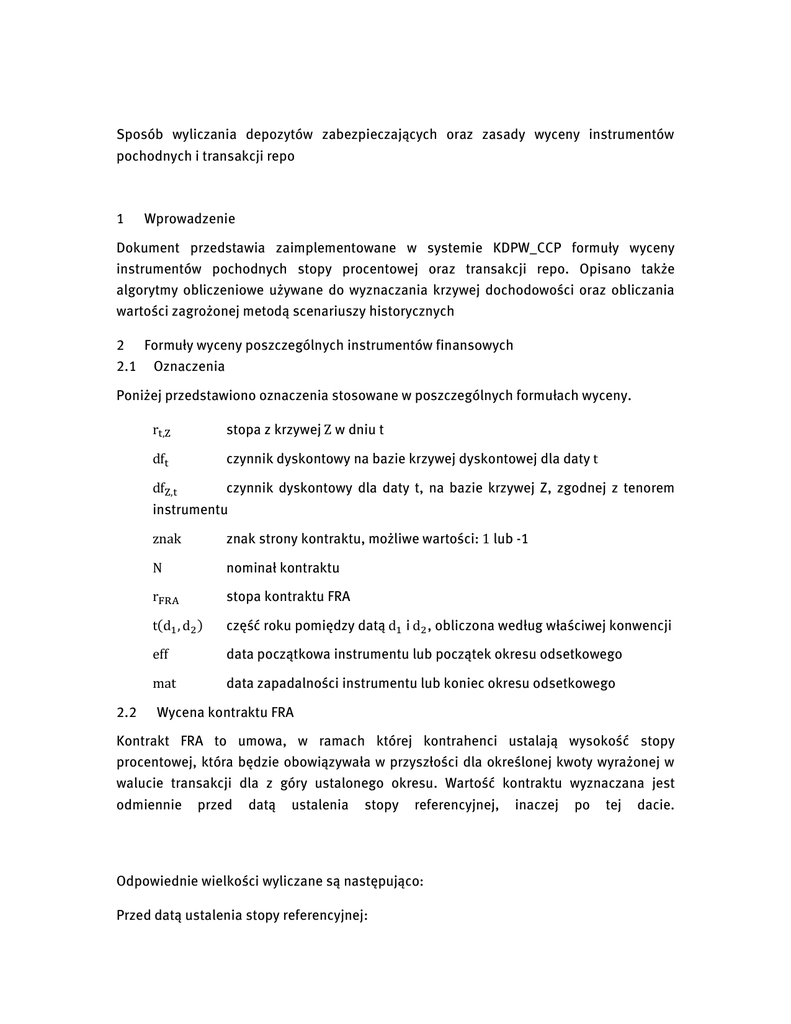 Sposób wyliczania depozytów zabezpieczających oraz zasady wyceny instrumentów pochodnych i transakcji repo 1 Wprowadzenie Dokument przedstawia zaimplementowane w systemie KDPW_CCP formuły wyceny instrumentów pochodnych stopy procentowej oraz transakcji repo. Opisano także algorytmy obliczeniowe używane do wyznaczania krzywej dochodowości oraz obliczania wartości zagrożonej metodą scenariuszy historycznych 2 Formuły wyceny poszczególnych instrumentów finansowych 2.1 Oznaczenia Poniżej przedstawiono oznaczenia stosowane w poszczególnych formułach wyceny. stopa z krzywej w dniu t czynnik dyskontowy na bazie krzywej dyskontowej dla daty czynnik dyskontowy dla daty t, na bazie krzywej Z, zgodnej z tenorem instrumentu znak strony kontraktu, możliwe wartości: lub -1 nominał kontraktu stopa kontraktu FRA część roku pomiędzy datą i , obliczona według właściwej konwencji data początkowa instrumentu lub początek okresu odsetkowego data zapadalności instrumentu lub koniec okresu odsetkowego 2.2 Wycena kontraktu FRA Kontrakt FRA to umowa, w ramach której kontrahenci ustalają wysokość stopy procentowej, która będzie obowiązywała w przyszłości dla określonej kwoty wyrażonej w walucie transakcji dla z góry ustalonego okresu. Wartość kontraktu wyznaczana jest odmiennie przed datą ustalenia stopy referencyjnej, inaczej po tej dacie. Odpowiednie wielkości wyliczane są następująco: Przed datą ustalenia stopy referencyjnej: Po dacie ustalenia stopy referencyjnej: 2.3 Wycena kontraktu IRS Kontrakt IRS jest umową na okresową wymianę płatności odsetkowych i składa się z dwóch strumieni pieniężnych. Jedna strona kontraktu płaci odsetki wyliczane według stałej stopy procentowej (noga stała), w zamian za to otrzymuje odsetki wyliczane według stopy zmiennej (noga zmienna), druga strona – odwrotnie. Wartość kontraktu jest różnicą pomiędzy wyceną nogi otrzymywanej i wyceną nogi płaconej. Wyceny poszczególnych nóg kontraktu przedstawiono poniżej. Wycena nogi stałej: gdzie: ilość okresów odsetkowych nogi stałej Wycena nogi zmiennej: gdzie: stawka w dniu j z krzywej α, dla j = 0 (pierwsza płatność kuponowa) stawka ta może być ustalona explicite bez odniesienia do stawki referencyjnej ilość okresów odsetkowych nogi zmiennej marża addytywna 2.4 Wycena kontraktu Basis Swap 2 Basis Swap to rodzaj kontraktu IRS wymiany płatności odsetkowych, gdzie obie strony płacą odsetki według różnej referencyjnej stopy zmiennej. Wartość kontraktu jest różnicą pomiędzy wyceną nogi otrzymywanej i wyceną nogi płaconej. Wyceny poszczególnych nóg kontraktu przedstawiono poniżej. gdzie: stawka w dniu j z krzywej αA, dla j = 0 to stawka według której wyliczana jest pierwsza płatność strony A stawka w dniu j z krzywej αB, dla j = 0 to stawka według której wyliczana jest pierwsza płatność strony B ilość okresów odsetkowych marża addytywna dla strony A marża addytywna dla strony B 2.5 Wycena kontraktu OIS Kontrakt OIS to swap stopy procentowej stałej do zmiennej, w którym część zmienna jest powiązana z dzienną referencyjną stawką jednodniową (w Polsce jest to stawka Polonia). Kontrakt polega na wymianie dwóch przepływów pieniężnych: nogi stałej, która jest jednorazową płatnością będącą odsetkami wyliczonymi według stałej, ustalonej w kontrakcie stopy od pewnego ustalonego nominału oraz nogi zmiennej, która jest jednorazową płatnością będącą dziennie składanymi odsetkami, wyliczonymi na bazie stopy ON od ustalonego nominału kontraktu. Kwota rozliczenia to wartość bezwzględna z różnicy dwóch powyższych wielkości. Wycena poszczególnych nóg kontraktu przedstawiona jest poniżej: gdzie: ustalona stawka stała kontraktu 3 gdzie: fixing stawki O/N kontraktu na koniec okresu 2.6 Wycena transakcji repo Wartość kontraktu przed rozrachunkiem pierwszej nogi wyliczana jest następująco: gdzie: wolumen transakcji data rozrachunku pierwszej nogi data rozrachunku drugiej nogi kwota rozrachunku pierwszej nogi kwota rozrachunku drugiej nogi cena brudna obligacji (uwzględniająca odsetki narosłe od daty ostatniej płatności kuponowej) Po dokonaniu rozrachunku pierwszej nogi wartość kontraktu repo wynosi: 3 Wyznaczanie krzywej dochodowości Generowanie krzywej dochodowości jest podstawowym krokiem w procesie wyceny instrumentów stopy procentowej. Krzywa ta przedstawia zależność stopy procentowej dla danej waluty od czasu. Krzywe dochodowości są konstruowane na podstawie obserwowanych na rynku cen instrumentów stopy procentowej (stawek referencyjnych). System KDPW_CCP oferuje elastyczne podejście do generowania krzywych dochodowości. 4 Krzywa dochodowości jest zbudowana na podstawie struktury terminowej referencyjnych stóp procentowych obserwowanych dla instrumentów o różnych terminach zapadalności, oraz zerokuponowych czynników dyskontujących określonych na podstawie stawek referencyjnych dla czasu t. Struktura terminowa grupuje stawki referencyjne dla danego instrumentu, tenoru i waluty dla różnych terminów zapadalności. Czynniki dyskontowe są wyznaczane ze stawek referencyjnych pochodzących z obserwowanych cen instrumentów CASH, FRA, IRS i OIS za pomocą metody bootstrapu. Pomiędzy określonymi węzłami czynniki są wyliczane metodą interpolacji. 3.1 Definicje czynnik dyskontowy dla czasu stawka referencyjna dla terminu zapadalności część roku pomiędzy 3.2 a Wyznaczanie krzywej metodą bootstrapu Czynniki dyskontowe wyznaczane są rekurencyjnie dla kolejnych terminów zapadalności na podstawie znanych stawek referencyjnych. Najpierw wyznaczany jest pierwszy czynnik (dla najkrótszego terminu zapadalności). Każdy kolejny czynnik wyznaczany jest na podstawie wcześniej wyliczonych wartości. 3.3 Wyznaczanie krzywej na podstawie instrumentów Cash i FRA 3.3.1 Wyznaczanie pierwszego czynnika dyskontowego Pierwszym krokiem do wyznaczenia krzywej jes