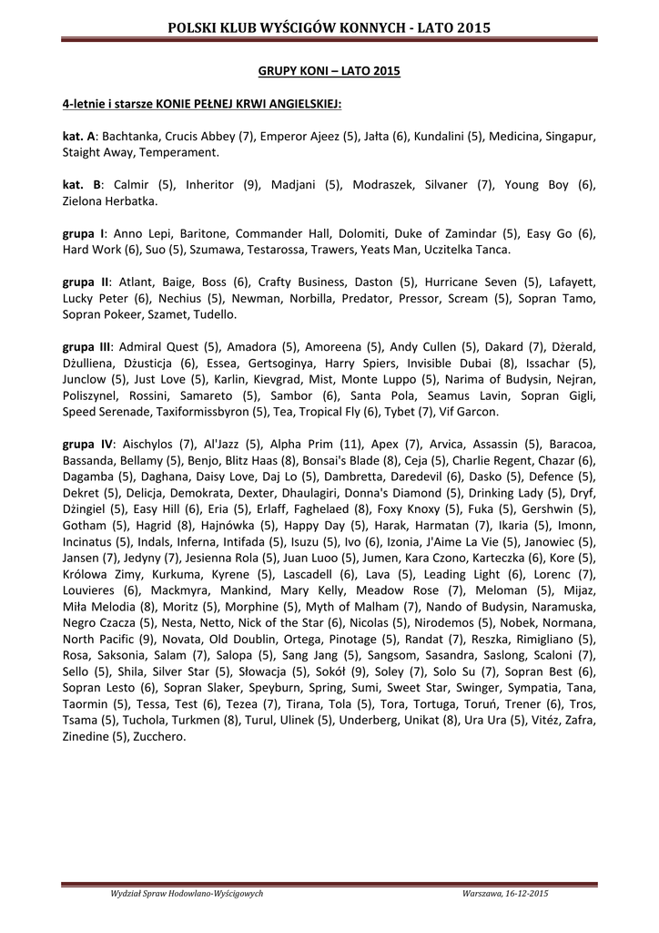 POLSKI KLUB WYŚCIGÓW KONNYCH - LATO 2015 GRUPY KONI – LATO 2015 4-letnie i starsze KONIE PEŁNEJ KRWI ANGIELSKIEJ: kat. A: Bachtanka, Crucis Abbey (7), Emperor Ajeez (5), Jałta (6), Kundalini (5), Medicina, Singapur, Staight Away, Temperament. kat. B: Calmir (5), Inheritor (9), Madjani (5), Modraszek, Silvaner (7), Young Boy (6), Zielona Herbatka. grupa I: Anno Lepi, Baritone, Commander Hall, Dolomiti, Duke of Zamindar (5), Easy Go (6), Hard Work (6), Suo (5), Szumawa, Testarossa, Trawers, Yeats Man, Uczitelka Tanca. grupa II: Atlant, Baige, Boss (6), Crafty Business, Daston (5), Hurricane Seven (5), Lafayett, Lucky Peter (6), Nechius (5), Newman, Norbilla, Predator, Pressor, Scream (5), Sopran Tamo, Sopran Pokeer, Szamet, Tudello. grupa III: Admiral Quest (5), Amadora (5), Amoreena (5), Andy Cullen (5), Dakard (7), Dżerald, Dżulliena, Dżusticja (6), Essea, Gertsoginya, Harry Spiers, Invisible Dubai (8), Issachar (5), Junclow (5), Just Love (5), Karlin, Kievgrad, Mist, Monte Luppo (5), Narima of Budysin, Nejran, Poliszynel, Rossini, Samareto (5), Sambor (6), Santa Pola, Seamus Lavin, Sopran Gigli, Speed Serenade, Taxiformissbyron (5), Tea, Tropical Fly (6), Tybet (7), Vif Garcon. grupa IV: Aischylos (7), Al'Jazz (5), Alpha Prim (11), Apex (7), Arvica, Assassin (5), Baracoa, Bassanda, Bellamy (5), Benjo, Blitz Haas (8), Bonsai's Blade (8), Ceja (5), Charlie Regent, Chazar (6), Dagamba (5), Daghana, Daisy Love, Daj Lo (5), Dambretta, Daredevil (6), Dasko (5), Defence (5), Dekret (5), Delicja, Demokrata, Dexter, Dhaulagiri, Donna's Diamond (5), Drinking Lady (5), Dryf, Dżingiel (5), Easy Hill (6), Eria (5), Erlaff, Faghelaed (8), Foxy Knoxy (5), Fuka (5), Gershwin (5), Gotham (5), Hagrid (8), Hajnówka (5), Happy Day (5), Harak, Harmatan (7), Ikaria (5), Imonn, Incinatus (5), Indals, Inferna, Intifada (5), Isuzu (5), Ivo (6), Izonia, J'Aime La Vie (5), Janowiec (5), Jansen (7), Jedyny (7), Jesienna Rola (5), Juan Luoo (5), Jumen, Kara Czono, Karteczka (6), Kore (5), Królowa Zimy, Kurkuma, Kyrene (5), Lascadell (6), Lava (5), Leading Light (6), Lorenc (7), Louvieres (6), Mackmyra, Mankind, Mary Kelly, Meadow Rose (7), Meloman (5), Mijaz, Miła Melodia (8), Moritz (5), Morphine (5), Myth of Malham (7), Nando of Budysin, Naramuska, Negro Czacza (5), Nesta, Netto, Nick of the Star (6), Nicolas (5), Nirodemos (5), Nobek, Normana, North Pacific (9), Novata, Old Doublin, Ortega, Pinotage (5), Randat (7), Reszka, Rimigliano (5), Rosa, Saksonia, Salam (7), Salopa (5), Sang Jang (5), Sangsom, Sasandra, Saslong, Scaloni (7), Sello (5), Shila, Silver Star (5), Słowacja (5), Sokół (9), Soley (7), Solo Su (7), Sopran Best (6), Sopran Lesto (6), Sopran Slaker, Speyburn, Spring, Sumi, Sweet Star, Swinger, Sympatia, Tana, Taormin (5), Tessa, Test (6), Tezea (7), Tirana, Tola (5), Tora, Tortuga, Toruń, Trener (6), Tros, Tsama (5), Tuchola, Turkmen (8), Turul, Ulinek (5), Underberg, Unikat (8), Ura Ura (5), Vitéz, Zafra, Zinedine (5), Zucchero. Wydział Spraw Hodowlano-Wyścigowych Warszawa, 16-12-2015 POLSKI KLUB WYŚCIGÓW KONNYCH - LATO 2015 3-letnie KONIE PEŁNEJ KRWI ANGIELSKIEJ: kat. A: Amfitrita, Hospitalite, Kokshe, Mushrae, Nadworna, Tantal, Tavriya, Va Bank. kat. B: Kolekcjoner, Milaneza, Newerly, Sorento. grupa I: Dogmat, Dynastia, Enter Emizar, Knyagynya, Masterpower, Novitor, Party Animal, Sosta. grupa II: Adanero, Algyr, Anna Ca, Artemida, Betti Gold, Bush Brother, Captain Aragorn, Charreria, Damir, Dorodna, Dżenita, Height of Beauty, Keep Cool, Legionary, Milioner, Monte Christo, Narol, Paradise Island, Pretty Valentine, Russian Caviar, Salamija, Salzburg, Santa Clara, Słowak, Sulivia, Szarotka, Tankredi, Tebiretta, Trim, Wiedzmin, Zabava. grupa III: Agatek, Bachata, Barnaba, Bee, Bella Tertullia, Bowie, Brego, Ceylon, Diagnoza, Double Mancer, Dragon Ball, Dubai Jin, Dunayka, Elips, Flirtation, Fredek, Herbata, Herbatka We Dwoje, Hulajka, Invicta Varsovia, Ironia, Jarmuż, Jusain Bolt, Kaledonia, Karim, Kinder Jape, Klioda, Le Arita, Lemont, Madrona, Mała Gwiazdka, Marinero, Meadows Kisses, Negri, Nimfa, Pereditta, Pirate Rebel, Pretor, Sauron, Sekret Ecosse, Shogun, Służewiec, Solin, Stefan, Tasmania, Thunder Thor, Two To Tango, Zryw. grupa IV: Accardi, Acqua Tofana, Ai Jin, Akolada, Alexi, Ameryka, Another Hill, Arachia, Argento Vivo, Arlekin, Aspire, Baby Love, Bajobongo, Baraka, Beautiful Twilight, Bogandra, Carevič, Chirpy, Chorwacja, Corrina Oct, Dais, Daydreamer, Debruca, Dimencii, Dizzney, Dżoson, Erwiszka, Esser, Esterlina, Galicja, Golden Belvia, Gordost, Green Tea, Guerra, Hilla, Holy Anna, Ice Loly, Iluminator, Indidzi, Infiniti, Internet, Ismaki, Ismina, Itamara, Itran, Iverson, Izolacja, Jagar, Jam Kmicic, Jarabe, Jarem, Jaszmira, Junak, Katedra, King October, Klaser, Kniaziewicz, Koko, Krobia, Książę Gaju, La Donna, Lago, Leticiya, Lirika, Little Romance, Lucky Thomas, Ma Cheri, Makedonets, Maltese, Masai Prince, Matrix, Miss Alexandra, Monda, Moneta, Monterey, Nannina, Nice Silver, Night Dance, Normandia, Nowy Świt, Rakhine Yoma, Rakisz, Ravis, Reebusz, Reglament, Rex, Risk, Royal River, Sabra, Saltarello, Sasha, Saturn, Saxum, Sceneria, Sobol, Stawona, Suena, Syberia, Sycylia, Syrena, Szeroka Droga, Szeroka Łąka, Sztof, Takara, Talk Me, Tarot, Tarsus, Tarwin, Tequila Rosa, Terapena, Tesja, Torsey, Tradycja, Tresura, Trzy Korony, Turbika, Turbina, Tyran. Wydział Spraw Hodowlano-Wyścigowych Warszawa, 16-12-2015 POLSKI KLUB WYŚCIGÓW KONNYCH - LATO 2015 2-letnie KONIE PEŁNEJ KRWI ANGIELSKIEJ: kat. A: Campo Di Fiori, Choupette, Cockney Blue, Jabella, Keep Smiling, Langfuhr, Tebinio. kat. B: Bronislav, Caccini, Carneau, Dacosse, Dżidżali, Harpagan, Neo, Paradise Bay. grupa I: Ailana, Best Line, Brela, Brisingr, Cheri-Cheri, Dark Vader, Defar, Dusigrosz, Francaise, Free-Lu, Ihaveadream, Infigenia, Invincible Red, Irada, Irga, Iron Belle, Isfalan, Kajlon, Kapryśna, Królowa Grodu, Lady Art, Mura, Novelina, Pianoforte, Realy Gold, Salien, Samael, Sant