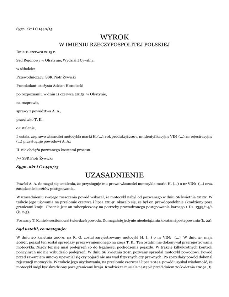 Sygn. akt I C 1440/15 WYROK W IMIENIU RZECZYPOSPOLITEJ POLSKIEJ Dnia 11 czerwca 2015 r. Sąd Rejonowy w Olsztynie, Wydział I Cywilny, w składzie: Przewodniczący: SSR Piotr Żywicki Protokolant: stażysta Adrian Horodecki po rozpoznaniu w dniu 11 czerwca 2015r. w Olsztynie, na rozprawie, sprawy z powództwa A. A., przeciwko T. K., o ustalenie, I ustala, że prawo własności motocykla marki H. (...), rok produkcji 2007, nr identyfikacyjny VIN (...), nr rejestracyjny (...) przysługuje powodowi A. A.; II nie obciąża pozwanego kosztami procesu. /-/ SSR Piotr Żywicki Sygn. akt I C 1440/15 UZASADNIENIE Powód A. A. domagał się ustalenia, że przysługuje mu prawo własności motocykla marki H. (...) o nr VIN: (...) oraz zasądzenie kosztów postępowania. W uzasadnieniu swojego roszczenia powód wskazał, że motocykl nabył od pozwanego w dniu 06 kwietnia 2012r. W trakcie jego używania na przełomie czerwca i lipca 2014r. okazało się, że był on prawdopodobnie skradziony poza granicami kraju. Obecnie jest on zabezpieczony na potrzeby prowadzonego postępowania karnego 1 Ds. 1359/14/s (k. 2-5). Pozwany T. K. nie kwestionował twierdzeń powoda. Domagał się jedynie nieobciążania kosztami postepowania (k. 22). Sąd ustalił, co następuje: W dniu 20 kwietnia 2009r. na R. G. został zarejestrowany motocykl H. (...) o nr VIN: (...). W dniu 25 maja 2009r. pojazd ten został sprzedaży przez wymienionego na rzecz T. K.. Ten ostatni nie dokonywał przerejestrowania motocykla. Nigdy tez nie miał podejrzeń co do legalności pochodzenia pojazdu. W trakcie kilkukrotnych kontroli policyjnych nic nie wzbudzało podejrzeń. W dniu 06 kwietnia 201r. pozwany sprzedał motocykl powodowi. Powód przed zawarciem umowy upewniał się czy pojazd nie ma wad fizycznych czy prawnych. Po sprzedaży powód dokonał rejestracji motocykla. W trakcie jego użytkowania, na przełomie czerwca i lipca 2014r. powód uzyskał wiadomość, że motocykl mógł być skradziony poza granicami kraju. Kradzież ta musiała nastąpić przed dniem 20 kwietnia 2009r., tj. przed dniem pierwszej rejestracji pojazdu w Polsce. Obecnie motocykl jest zabezpieczony na potrzeby prowadzonego postępowania karnego 1 Ds. 1359/14/S. (bezsporne, por. dokumenty k. 7-11, akta 1 Ds. 1359/14/S) Sąd zważył, co następuje: Powództwo było zasadne. Zgodnie z art. 189 kpc powód może żądać ustalenia przez sąd istnienia lub nieistnienia stosunku prawnego lub prawa, gdy ma w tym interes prawny. Z uwagi na zabezpieczenie motocykla przez organa prowadzące postępowanie przygotowawcze powód miał interes prawny w żądaniu ustalenia przysługującego mu prawa własności opisanego pojazdu. Nie budzi wątpliwości fakt, że motocykl – o ile w ogóle pochodził z kradzieży – to został skradziony przed dniem jego pierwszej rejestracji w Polsce (tj. przed dniem 25 kwietnia 2009r.) W świetle art. 169 §1 i §2 kc jeżeli osoba nieuprawniona do rozporządzania rzeczą ruchomą zbywa rzecz i wydaje ją nabywcy, nabywca uzyskuje własność z chwilą objęcia rzeczy w posiadanie, chyba że działa w złej wierze. Jednakże gdy rzecz zgubiona, skradziona lub w inny sposób utracona przez właściciela zostaje zbyta przed upływem lat trzech od chwili jej zgubienia, skradzenia lub utraty, nabywca może uzyskać własność dopiero z upływem powyższego trzyletniego terminu. Ponieważ powód nabył motocykl w dobrej wierze, zaś wiedzę dotyczącą prawdopodobnego pochodzenia pojazdu z czynu niedozwolonego (która ową dobrą wiarę mogłaby wykluczać) nabył dopiero na przełomie czerwca i lipca 2014r., to najpóźniej z dniem 21 kwietnia 2012r. (po upływie 3-letniego terminu od najpóźniejszej możliwej daty kradzieży, tj. od 20 kwietnia 2009r.) stał się właścicielem pojazdu. Z uwagi na powyższe, na podstawie ww. przepisów należało orzec, jak w pkt I wyroku. O kosztach procesu, mając na uwadze nie kwestionowaną przez powoda sytuację materialną pozwanego (k. 22) oraz fakt, że pozwany nie zaprzeczał twierdzeniom powoda zaś wytoczenie przeciwko niemu powództwa było jedyna możliwością uzyskania wyroku ustalającego, orzeczono po myśli art. 102 kpc (pkt II wyroku). /-/ SSR Piotr Żywicki