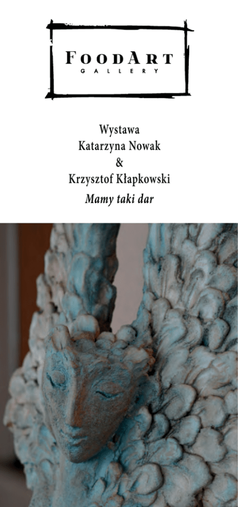Wystawa Katarzyna Nowak & Krzysztof Kłapkowski Mamy taki dar Katarzyna Nowak ukończyła wrocławską ASP na wydziale Ceramiki i Szkła. Dyplom w pracowni prof. Krystyny Cybińskiej. Po studiach szybko odeszła od realizacji abstrakcyjnych do przedstawień figuratywnych, często odwołujących się do rzeczywistości. Efektem tych poszukiwań były rzeźby zdeformowane i ekspresyjne, mocne w wyrazie. Z czasem prace stały się subtelniejsze i doskonalsze w proporcjach. Tematem tych wszystkich przedstawień stał się człowiek. Artystka poszukuje sposobu na to, żeby po przez swoje prace opowiedzieć o sile i pięknie ludzkiego ciała. Jest też autorką scenografii do kilku etiud filmowych. Krzysztof Kłapkowski jest absolwentem wrocławskiej ASP na wydziale Malarstwa, Grafiki i Rzeźby. Już podczas studiów tworzył instalacje przestrzenne. Prezentowany aneks do Dyplomu pt. Proste Maszyny latające, został dobrze przyjęty. Początkowo swoje obiekty tworzył z metalu, papieru i szkła. Prezentowane prace były umieszczone w przestrzeni. Zawieszone między niebem, a ziemią. W pewnym momencie powstały rzeźby z gliny, uskrzydlone postacie wzbijające się do lotu. Ten motyw pojawia się też w malarstwie artysty. Jego płótna są pełne symboli znaków, które tworzą niepowtarzalną strukturę obrazów. Artyści tworzą i wystawiają razem. Mają w swoim dorobku wiele wystaw krajowych i zagranicznych. Prace ich są w zbiorach prywatnych kolekcjonerów na całym świecie. WYSTAWA - MAMY TAKI DAR To cykl prac malarskich oraz rzeźb artystycznego duetu. W obrazach Krzysztofa Kłapkowskiego prezentowanych na wystawie pojawiają się różne wątki od poetyckich sennych wizji po proste przedstawienia abstrakcyjne. Z jednej strony artysta dąży do uproszczenia modelunku, z drugiej zaś poszukuje rozwiązań znaczeniowych. Dzięki temu powstają obrazy abstrakcyjne, które są pełne realistycznych odniesień. Rzeźby artysty to fragment cyklu „Istoty latające„ - delikatne, zastygłe w ruchu postacie kobiet ze skrzydłami, przywodzące na myśl mitologiczne postacie. Impulsem do stworzenia pracach Katarzyny Nowak, najczęściej są spotkania z ludźmi, ponieważ interesuje ją człowiek, jego fizyczność, zmysłowość, cienka granica pomiędzy młodością, a dojrzałością. Stara się, aby powstające przedstawienia były uniwersalne, pokazywały to co w nas jest najlepsze. Malarstwo i rzeźba – Krzysztof Kłapkowski technika olejna ,na płótnie, glina rzeźbiarska: Akt 2, 80/100 cm cena 4200zł Czuwanie dusz wymiary 100/100 cm cena 4500 zł Modelka 92/177 cm cena 7000 zł Akt wymiary 32/120 cm cena autorska 5800 zł Poranek na plaży 70/90 cm cena 3400 zł Pani Anielska 30/90 cm cena 3600 zł Miejsce nienazwane 70/90 cm cena 3400 zł Przebudzenie 40/120 cm cena 4200 zł Pejzaż z Aniołem 100/80 cena 4200 zł Rzeźba – Katarzyna Nowak glina rzeźbiarska: 1akt wymiary 50/100 cm cena 4700 zł Głowa dziewczyny 34/75 cm cena 3600 zł Lawendowa Pani 32/72 cm cena 3600 zł Food Art Gallery to pasjonujące doświadczenie dla osób poszukujących piękna w każdej dziedzinie życia. To połączenie wysublimowanej restauracji z galerią sztuki współczesnej. Restauracja, w której sztuka ma wiele imion, a kulinarne dzieła funkcjonują tu w estetycznej symbiozie z nowoczesnym malarstwem, grafiką i rzeźbą.