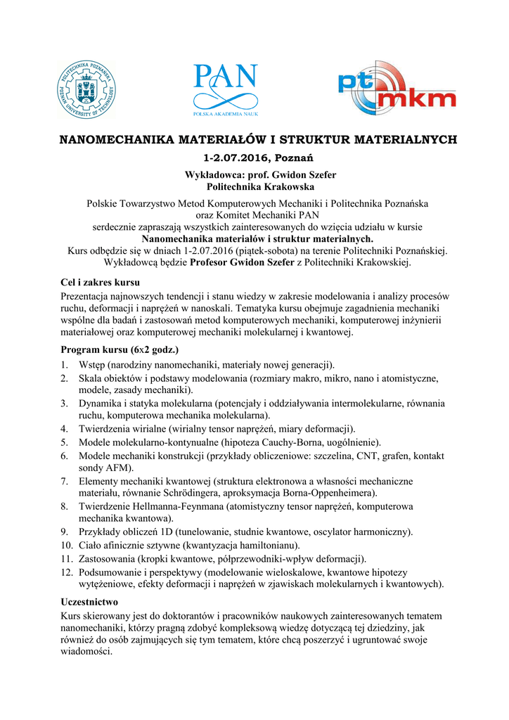 NANOMECHANIKA MATERIAŁÓW MATER I STRUKTUR MATERIALNYCH 1-2.07.2016, Poznań Wykładowca: prof. Gwidon Szefer Politechnika Krakowska Polskie Towarzystwo Metod Komputerowych Mechaniki i Politechnika Poznańska Pozna oraz Komitet Mechaniki PAN serdecznie zapraszająą wszystkich zainteresowanych do wzięcia wzięcia udziału w kursie Nanomechanika omechanika materiałów i struktur materialnych. Kurs odbędzie się w dniach 1-2.07.2016 1 (piątek-sobota) na terenie Politechniki Poznańskiej. Pozna Wykładowcąą będzie ędzie Profesor Gwidon Szefer z Politechniki Krakowskiej. Krakowskiej Cel i zakres kursu Prezentacja najnowszych tendencji i stanu wiedzy w zakresie modelowania i analizy procesów ruchu, deformacji i naprężeń ęż ń w nanoskali. Tematyka kursu obejmuje zagadnienia mechaniki wspólne dla badań i zastosowań metod komputerowych mechaniki, komputerowej inżynierii in materiałowej oraz komputerowej mechaniki molekularnej i kwantowej. Program kursu (6x2 godz.) 1. Wstęp (narodziny nanomechaniki, materiały nowej generacji). 2. Skala obiektów i podstawy modelowania (rozmiary makro, mikro, nano i atomistyczne, modele, zasady mechaniki). mechaniki) 3. Dynamika i statyka molekularna (potencjały i oddziaływania intermolekularne, równania ruchu, komputerowa mechanika molekularna). molekularna) 4. Twierdzenia wirialne (wirialny wirialny tensor naprężeń, miary deformacji). 5. Modele molekularno-kontynualne kontynualne (hipoteza Cauchy-Borna, Cauchy uogólnienie) uogólnienie). 6. Modele mechaniki konstrukcji (przykłady obliczeniowe: szczelina, CNT, grafen, kontakt sondy AFM). 7. Elementy mechaniki kwantowej (struktura ( elektronowa a własności ści mechaniczne materiału, równanie Schröödingera, aproksymacja Borna-Oppenheimera Oppenheimera). 8. Twierdzenie Hellmanna-Feynmana Feynmana (atomistyczny tensor naprężeń, napr komputerowa mechanika kwantowa). 9. Przykłady obliczeńń 1D (tunelowanie, studnie kwantowe, oscylator harmoniczny). harmoniczny 10. Ciało afinicznie sztywne ywne (kwantyzacja hamiltonianu). hamiltonianu 11. Zastosowania (kropki kwantowe, półprzewodniki-wpływ deformacji). 12. Podsumowanie i perspektywy (modelowanie wieloskalowe, kwantowe hipotezy wytężeniowe, eniowe, efekty deformacji i naprężeń napr w zjawiskach molekularnych i kwantowych). kwantowych) Uczestnictwo Kurs skierowany jest do doktorantów i pracowników naukowych zainteresowanych tematem nanomechaniki, którzy pragną zdobyć kompleksową wiedzę dotyczącą tej dziedziny, dziedziny jak również do osób zajmujących ących się tym tematem, które chcą poszerzyćć i ugruntować ugruntowa swoje wiadomości. Opłaty: - opłata regularna 800 zł (bez uroczystej kolacji 650 zł), - opłata dla doktorantów 700 zł (bez uroczystej kolacji 550 zł). Członkowie PTMKM ponoszą opłatę zredukowaną o 100 zł. Opłata zawiera: poczęstunek powitalny, obiady, przerwy kawowe, uroczystą kolację i certyfikat. Szczegóły dotyczące płatności na stronie: http://www.ptmkm.pl/nanokurs/node/105 Ważne terminy: - do 15 maja 2016 - do 30 maja 2016 rejestracja uczestnictwa, wniesienie opłaty za kurs. Nota biograficzna Profesor Gwidon Szefer jest wybitnym, uznanym w kraju i zagranicą specjalistą w dziedzinie mechaniki materiałów i konstrukcji. W swojej działalności naukowej skupia się na tematyce związanej z mechaniką kontaktu, nanomechaniką, ośrodkach porowatych, optymalizacji konstrukcji i konstrukcjach inteligentnych. Spośród wielu pełnionych funkcji należy wymienić następujące: członek PAU, członek honorowy PTMTS, długoletni członek Centralnej Komisji do Spraw Stopni i Tytułów, przewodniczący Komitetu Mechaniki PAN przez dwie kadencje oraz wieloletni przewodniczący Sekcji Mechaniki Materiałów Komitetu Mechaniki PAN. Pełnił także funkcję prorektora Politechniki Krakowskiej i przez wiele lat był kierownikiem Katedry Mechaniki Ośrodków Ciągłych. Z aktywności i organizacji międzynarodowych można wymienić działalność w GAMM, w ramach której zorganizował między innymi Konferencję GAMM w Krakowie. Jest członkiem Narodowego Komitetu IUTAM i byłym wieloletnim członkiem “Board of Directors” międzynarodowego centrum nauk mechanicznych CISM w Udine (Włochy). Zakwaterowanie Lista akademików (0.2 km, cena za pokój: 50-160 PLN): DS1 DS2 DS3 ul. Jana Pawła II 28 61-139 Poznań tel.:+48 61 6652536 email: [email protected] ul. Kórnicka 5 61-132 Poznań tel.: +48 61 6652626 email: [email protected] ul. Jana Pawła II 26 61-139 Poznań tel.: +48 61 6652513 email: [email protected] Lista hoteli: Hotel Ibis Poznań Centrum (0.5 km) Novotel Poznań Malta (2 km) ul. Kazimierza Wielkiego 23, 61-863 Poznań tel.: +48 61 8584400, fax: +48 61 8584444 email: [email protected] ul. Termalna 5, 61-028 Poznań tel: +48 61 6543114, fax: +48 61 6543195 email: [email protected] Hotel Park Poznań (1.7 km) IBB Andersia Hotel (1.7 km) abpa A.Baraniaka 77, 61-131 Poznań tel.: +48 61 8741153,fax: +48 61 87 41 200 email: [email protected] plac Andersa 3, 61-894 Poznań tel.: +48 61 6678100, -110 email: [email protected] W celu rezerwacji pokoju prosimy o bezpośredni kontakt z hotelem. Kontakt Polskie Towarzystwo Metod Komputerowych Mechaniki ul. Piotrowo 5, 61-138 Poznań tel.: +48 61 6652454, 6652457 email: [email protected] fax: +48 61 8766116, 6652059 www: www.ptmkm.pl/nanokurs