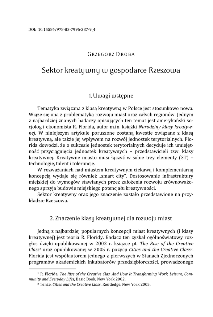 DOI: 10.15584/978-83-7996-337-9_4 Tematyka związana z klasą kreatywną w Polsce jest stosunkowo nowa. Wiąże się ona z problematyką rozwoju miast oraz całych regionów. Jednym z najbardziej znanych badaczy opisujących ten temat jest amerykański socjolog i ekonomista R. Florida, autor m.in. książki Narodziny klasy kreatywnej. W niniejszym artykule poruszone zostaną kwestie związane z klasą kreatywną, ale także jej wpływem na rozwój jednostek terytorialnych. Florida dowodzi, że o sukcesie jednostek terytorialnych decyduje ich umiejętność przyciągnięcia jednostek kreatywnych – przedstawicieli tzw. klasy kreatywnej. Kreatywne miasto musi łączyć w sobie trzy elementy (3T) – technologię, talent i tolerancję. W rozważaniach nad miastem kreatywnym ciekawą i komplementarną koncepcją wydaje się również „smart city”. Dostosowanie infrastruktury miejskiej do wymogów stawianych przez założenia rozwoju zrównoważonego sprzyja budowie miejskiego potencjału kreatywności. Sektor kreatywny oraz jego znaczenie zostało przedstawione na przykładzie Rzeszowa. Jedną z najbardziej popularnych koncepcji miast kreatywnych (i klasy kreatywnej) jest teoria R. Floridy. Badacz ten zyskał ogólnoświatowy rozgłos dzięki opublikowanej w 2002 r. książce pt. The Rise of the Creative Class1 oraz opublikowanej w 2005 r. pozycji Cities and the Creative Class2. Florida jest współautorem jednego z pierwszych w Stanach Zjednoczonych programów akademickich inkubatorów przedsiębiorczości, prowadzonego 1 R. Florida, The Rise of the Creative Clas. And How It Transforming Work, Leisure, Community and Everyday Lifes, Basic Book, New York 2002. 2 Tenże, Cities and the Creative Class, Routledge, New York 2005. przez miasto Pittsburgh i Carnegie Mellon Uniwersity. Program ten miał na celu pobudzenie przedsiębiorczości studentów, ale przede wszystkim rozwinięcie współpracy pomiędzy przedsiębiorstwami zlokalizowanymi w mieście i regionie a jednostkami badawczymi uczelni. Chociaż program okazał się wielkim sukcesem, Florida zauważył, że mimo licznych ulg podatkowych, doskonałej infrastruktury i potencjału naukowo-rozwojowego, jaki zapewniała współpraca z uniwersytetem, przedsiębiorstwa nadal przenosiły swoje siedziby (jak również produkcję) do innych regionów kraju. Zrodziło się oczywiste pytanie: dlaczego tak się działo? Podejmując ten temat badawczy, R. Florida doszedł do wniosku, że przedsiębiorstwa high-tech wybierają lokalizację do prowadzenia swojej działalności, kierując się głównie potencjałem kreatywności mieszkańców danego miejsca. To rewolucyjne spostrzeżenie zaowocowało stworzeniem, a następnie rozwinięciem koncepcji miast kreatywnych i klasy kreatywnej. Teoria R. Floridy zakłada, że czynnikiem decydującym o tempie i kierunku rozwoju miast czy też całych regionów jest potencjał twórczy ich mieszkańców. Co prawda, R. Florida za jednostki kreatywne uznaje wszystkich ludzi (niezależnie od wykonywanego zawodu, otrzymanego wykształcenia itd.), jednak w swoich badaniach skupił się jedynie na tych, którzy stale wykorzystują potencjał twórczy (stanowiący podstawę ich pracy). Analizując strukturę amerykańskiej gospodarki, oszacował, że jedna trzecia wszystkich pracowników, do których zaliczył m.in. naukowców, inżynierów, wynalazców, artystów, designerów, finansistów, była zatrudniona w sektorach kreatywnych. Chociaż pracownicy kreatywni stanowili jedynie jedną trzecią wszystkich zatrudnionych (ok. 38,3 mln osób), to przypisano im wypracowanie ponad dwóch trzecich amerykańskiego PKB. Co więcej, pracownicy kreatywni w dużej mierze zapewniali również miejsca pracy dla pozostałych jednostek, gdyż ich działalność stymulowała produkcję i pozwalała na utrzymanie zatrudnienia w sektorach niekreatywnych. Analizując terytorialne rozmieszczenie przedstawicieli wyróżnionej klasy, można zaobserwować, że koncentruje się ona w konkretnych miejscach – zazwyczaj dużych ośrodkach miejskich. Powstała w ten sposób koncepcja geografii kreatywności została poddana dalszym badaniom, na skutek czego zaobserwowano następujące trendy: 1. Przedstawiciele klasy kreatywnej wykazują tendencję do opuszczania tradycyjnych ośrodków korporacyjnych oraz miejsc zamieszkanych przez pracowników fizycznych, kierując się w stronę centrów kreatywnych (Creative Centers). 2. Centra kreatywne dominują gospodarczo nad innymi obszarami dzięki wysokiej koncentracji potencjału twórczego – twórczych jednostek i przed- siębiorstw high-tech. Centra te dominują również pod względem wzrostu populacji oraz zatrudnienia. 3. Centra kreatywności zawdzięczają dynamikę swojego wzrostu kreatywnym ludziom, którzy je zamieszkują. Ludzie ci tworzą specyficzny klimat otwartości i innowacyjności ułatwiający wszelką działalność kreatywną, w tym działalność artystyczną, kulturalną i innowacyjną. Zasoby kluczowe dla rozwoju tradycyjnej gospodarki (np. dostępność surowców) są w tym przypadku drugorzędne. 4. Jednostki kreatywne, decydując o wyborze miejsca zamieszkania, kierują się przede wszystkim kulturą społeczności danego miejsca. Cenią sobie otwartość, różnorodność i tolerancję. Tradycyjne determinanty, takie jak podaż miejsc pracy, infrastruktura rekreacyjna czy komunikacyjna, są o wiele mniej istotne niż w przypadku wyborów dokonywanych przez przedstawicieli innych klas. R. Florida istotę miast kreatywnych sprowadził do zasady 3T – technologia, talent, tolerancja. Wszystkie te elementy są ze sobą wzajemnie powiązane, a potencjał kreatywny jednostki miejskiej zależy od ich równomiernej implikacji praktycznej. Rozwój nowoczesnych technologii jest jedną z podstaw wzrostu gospodarczego; B + R (badanie + rozwój) zależy od jakości kapitału ludzkiego, dlatego miejsca, w którym jest on najwyższy (a zarazem najbardziej skoncentrowany), rozw