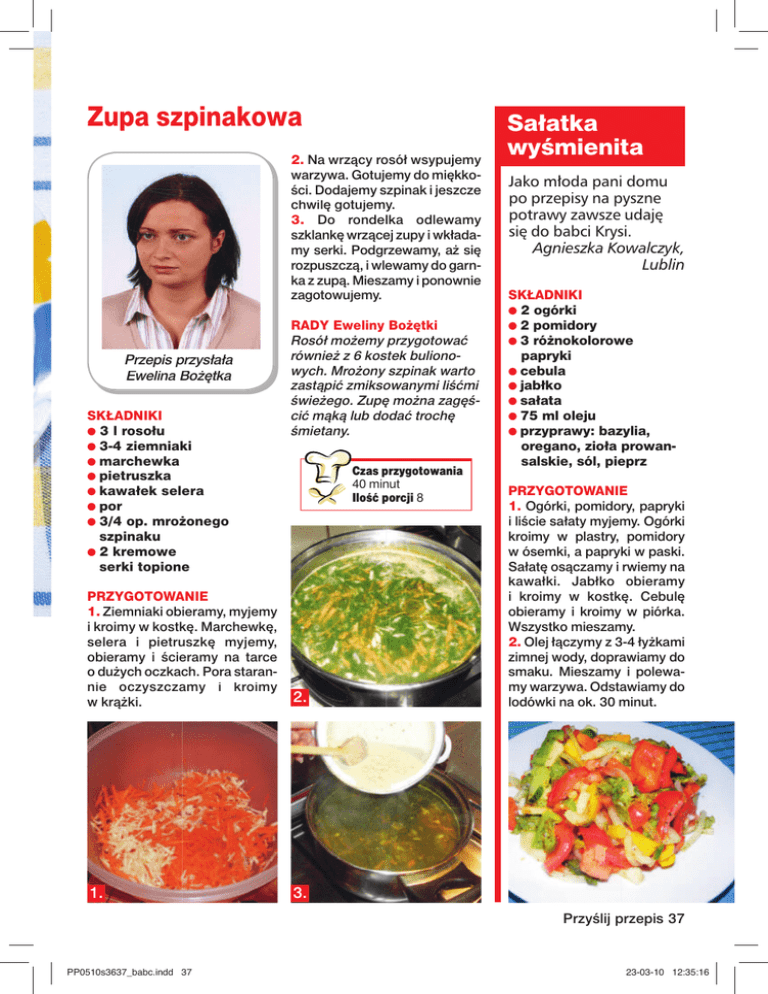 Zupa szpinakowa 2. Na wrzący rosół wsypujemy warzywa. Gotujemy do miękkości. Dodajemy szpinak i jeszcze chwilę gotujemy. 3. Do rondelka odlewamy szklankę wrzącej zupy i wkładamy serki. Podgrzewamy, aż się rozpuszczą, i wlewamy do garnka z zupą. Mieszamy i ponownie zagotowujemy. Przepis przysłała Ewelina Bożętka SKŁADNIKI ● 3 l rosołu ● 3-4 ziemniaki ● marchewka ● pietruszka ● kawałek selera ● por ● 3/4 op. mrożonego szpinaku ● 2 kremowe serki topione RADY Eweliny Bożętki Rosół możemy przygotować również z 6 kostek bulionowych. Mrożony szpinak warto zastąpić zmiksowanymi liśćmi świeżego. Zupę można zagęścić mąką lub dodać trochę śmietany. Czas przygotowania 40 minut Ilość porcji 8 PRZYGOTOWANIE 1. Ziemniaki obieramy, myjemy i kroimy y w kostkę. Marchewkę, selera i pietruszkę myjemy, obieram my i ścieramy na tarce o dużych oczkach. Pora starannie oc czyszczamy i kroimy w krążk ki. 2. 1. 3. Sałatka wyśmienita Jako młoda pani domu po przepisy na pyszne potrawy zawsze udaję się do babci Krysi. Agnieszka Kowalczyk, Lublin SKŁADNIKI ● 2 ogórki ● 2 pomidory ● 3 różnokolorowe papryki ● cebula ● jabłko ● sałata ● 75 ml oleju ● przyprawy: bazylia, oregano, zioła prowansalskie, sól, pieprz PRZYGOTOWANIE 1. Ogórki, pomidory, papryki i liście sałaty myjemy. Ogórki kroimy w plastry, pomidory w ósemki, a papryki w paski. Sałatę osączamy i rwiemy na kawałki. Jabłko obieramy i kroimy w kostkę. Cebulę obieramy i kroimy w piórka. Wszystko mieszamy. 2. Olej łączymy z 3-4 łyżkami zimnej wody, doprawiamy do smaku. Mieszamy i polewamy warzywa. Odstawiamy do lodówki na ok. 30 minut. Przyślij przepis 37 PP0510s3637_babc.indd 37 23-03-10 12:35:16