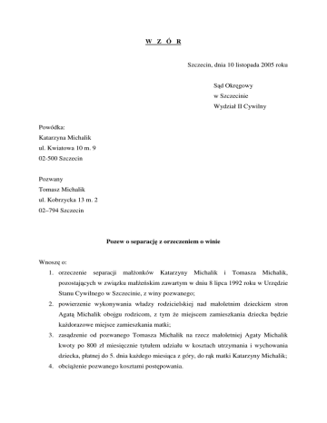 W Z Ó R Szczecin, dnia 10 listopada 2005 roku Sąd Okręgowy w Szczecinie Wydział II Cywilny Powódka: Katarzyna Michalik ul. Kwiatowa 10 m. 9 02-500 Szczecin Pozwany Tomasz Michalik ul. Kobrzycka 13 m. 2 02–794 Szczecin Pozew o separację z orzeczeniem o winie Wnoszę o: 1. orzeczenie separacji małżonków Katarzyny Michalik i Tomasza Michalik, pozostających w związku małżeńskim zawartym w dniu 8 lipca 1992 roku w Urzędzie Stanu Cywilnego w Szczecinie, z winy pozwanego; 2. powierzenie wykonywania władzy rodzicielskiej nad małoletnim dzieckiem stron Agatą Michalik obojgu rodzicom, z tym że miejscem zamieszkania dziecka będzie każdorazowe miejsce zamieszkania matki; 3. zasądzenie od pozwanego Tomasza Michalik na rzecz małoletniej Agaty Michalik kwoty po 800 zł miesięcznie tytułem udziału w kosztach utrzymania i wychowania dziecka, płatnej do 5. dnia każdego miesiąca z góry, do rąk matki Katarzyny Michalik; 4. obciążenie pozwanego kosztami postępowania. Ponadto wnoszę o: 5. zobowiązanie pozwanego Tomasza Michalik do łożenia przez czas trwania postępowania na rzecz małoletniej córki Agaty Michalik kwoty 500 zł miesięcznie, płatnej do 5. dnia każdego miesiąca do rąk matki; 6. dopuszczenie dowodu z zeznań świadka Barbary Skoczylas, zam. ul. Dolna 6 m. 7, 02– 341 Szczecin, na okoliczności podane w uzasadnieniu pozwu. Uzasadnienie Zawarliśmy związek małżeński w dniu 8 lipca 1992 roku w Urzędzie Stanu Cywilnego w Szczecinie. Z tego małżeństwa w dniu 17 listopada 1999 roku w Szczecinie urodziło się dziecko Agata Michalik. Dowód: odpis skrócony aktu małżeństwa. odpis skrócony aktu urodzenia dziecka. Do roku 2004 nasze pożycie układało się dobrze. W marcu 2004 roku pozwany wyjechał w podróż służbową, podczas której poznał Anitę Kujawiak, z którą zaczął się spotykać, a w sierpniu 2004 roku zamieszkał. Od tego czasu nie mieszkamy razem, spotykamy się tylko przypadkowo. Dowód: zeznania świadka Barbary Skoczylas. Pozwany pracuje w prywatnej firmie, osiąga dochód około 3000 zł brutto miesięcznie. Dodatkowo osiąga dochód w wysokości około 1000 zł. Miesięcznie pracując na umowyzlecenia. Ja pracuje jako księgowa, zarabiam 2000 zł miesięcznie brutto. Dowód: zaświadczenie o zarobkach powódki kserokopie umów zlecenia pozwanego. Na miesięczne usprawiedliwione potrzeby dziecka przeznaczam z reguły około 1000 zł miesięcznie. Córka uczęszcza na lekcje angielskiego oraz niemieckiego. Chodzi też na basen, co jest wskazane ze względu na wadę postawy jaką u niej stwierdzono. Na te dodatkowe zajęcia przeznaczam około 500 zł miesięcznie. Resztę pieniędzy przeznaczam na zwykłe codzienne wydatki na dziecko (ubrania, jedzenie). Dowód: kserokopie rachunków. Z uwagi na to, że możliwości zarobkowe pozwanego są o wiele większe niż powódki, natomiast usprawiedliwione potrzeby dziecka to około 1000 zł miesięcznie żądanie alimentów w kwocie 800 zł jest uzasadnione. Powódka wnosi o separację z winy pozwanego, jako że w żadnym stopniu nie przyczyniła się do rozkładu pożycia małżeńskiego. Z tych powodów wnoszę jak na wstępie. Katarzyna Michalik Załączniki: 1. odpis skrócony aktu małżeństwa 2. odpis skrócony aktu urodzenia dziecka 3. zaświadczenie o zarobkach powódki 4. kserokopie umów zleceń pozwanego 5. kserokopie rachunków