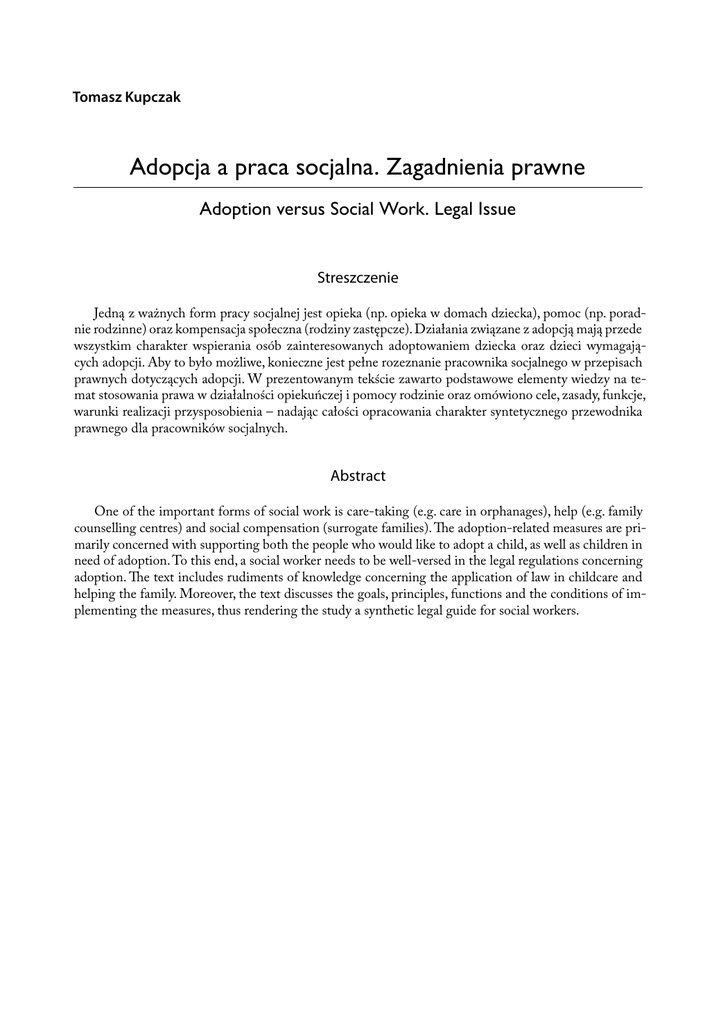 Tomasz Kupczak Adopcja a praca socjalna. Zagadnienia prawne Adoption versus Social Work. Legal Issue Streszczenie Jedną z ważnych form pracy socjalnej jest opieka (np. opieka w domach dziecka), pomoc (np. poradnie rodzinne) oraz kompensacja społeczna (rodziny zastępcze). Działania związane z adopcją mają przede wszystkim charakter wspierania osób zainteresowanych adoptowaniem dziecka oraz dzieci wymagających adopcji. Aby to było możliwe, konieczne jest pełne rozeznanie pracownika socjalnego w przepisach prawnych dotyczących adopcji. W prezentowanym tekście zawarto podstawowe elementy wiedzy na temat stosowania prawa w działalności opiekuńczej i pomocy rodzinie oraz omówiono cele, zasady, funkcje, warunki realizacji przysposobienia – nadając całości opracowania charakter syntetycznego przewodnika prawnego dla pracowników socjalnych. Abstract One of the important forms of social work is care-taking (e.g. care in orphanages), help (e.g. family counselling centres) and social compensation (surrogate families). The adoption-related measures are primarily concerned with supporting both the people who would like to adopt a child, as well as children in need of adoption. To this end, a social worker needs to be well-versed in the legal regulations concerning adoption. The text includes rudiments of knowledge concerning the application of law in childcare and helping the family. Moreover, the text discusses the goals, principles, functions and the conditions of implementing the measures, thus rendering the study a synthetic legal guide for social workers.