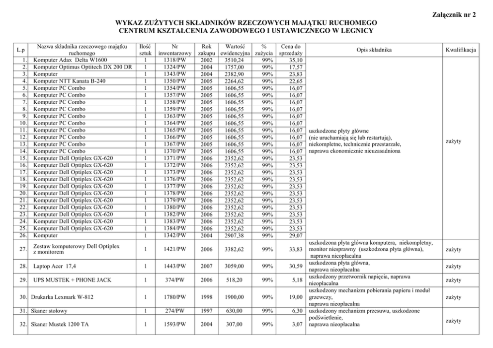 Załącznik nr 2 WYKAZ ZUŻYTYCH SKŁADNIKÓW RZECZOWYCH MAJĄTKU RUCHOMEGO CENTRUM KSZTAŁCENIA ZAWODOWEGO I USTAWICZNEGO W LEGNICY Ilość sztuk 1 1 1 1 1 1 1 1 1 1 1 1 1 1 1 1 1 1 1 1 1 1 1 1 1 1 Nr inwentarzowy 1318/PW 1324/PW 1343/PW 1350/PW 1354/PW 1357/PW 1358/PW 1359/PW 1363/PW 1364/PW 1365/PW 1366/PW 1367/PW 1370/PW 1371/PW 1372/PW 1373/PW 1376/PW 1377/PW 1378/PW 1379/PW 1380/PW 1382/PW 1383/PW 1384/PW 1342/PW % Rok Wartość zakupu ewidencyjna zużycia 2002 3510,24 99% 2004 1757,00 99% 2004 2382,90 99% 2005 2264,62 99% 2005 1606,55 99% 2005 1606,55 99% 2005 1606,55 99% 2005 1606,55 99% 2005 1606,55 99% 2005 1606,55 99% 2005 1606,55 99% 2005 1606,55 99% 2005 1606,55 99% 2005 1606,55 99% 2006 2352,62 99% 2006 2352,62 99% 2006 2352,62 99% 2006 2352,62 99% 2006 2352,62 99% 2006 2352,62 99% 2006 2352,62 99% 2006 2352,62 99% 2006 2352,62 99% 2006 2352,62 99% 2006 2352,62 99% 2004 2907,38 99% Cena do sprzedaży 35,10 17,57 23,83 22,65 16,07 16,07 16,07 16,07 16,07 16,07 16,07 16,07 16,07 16,07 23,53 23,53 23,53 23,53 23,53 23,53 23,53 23,53 23,53 23,53 23,53 29,07 1. 2. 3. 4. 5. 6. 7. 8. 9. 10. 11. 12. 13. 14. 15. 16. 17. 18. 19. 20. 21. 22. 23. 24. 25. 26. Nazwa składnika rzeczowego majątku ruchomego Komputer Adax Delta W1600 Komputer Optimus Optitech DX 200 DR Komputer Komputer NTT Kanata B-240 Komputer PC Combo Komputer PC Combo Komputer PC Combo Komputer PC Combo Komputer PC Combo Komputer PC Combo Komputer PC Combo Komputer PC Combo Komputer PC Combo Komputer PC Combo Komputer Dell Optiplex GX-620 Komputer Dell Optiplex GX-620 Komputer Dell Optiplex GX-620 Komputer Dell Optiplex GX-620 Komputer Dell Optiplex GX-620 Komputer Dell Optiplex GX-620 Komputer Dell Optiplex GX-620 Komputer Dell Optiplex GX-620 Komputer Dell Optiplex GX-620 Komputer Dell Optiplex GX-620 Komputer Dell Optiplex GX-620 Komputer 27. Zestaw komputerowy Dell Optiplex z monitorem 1 1421/PW 2006 3382,62 99% 33,83 28. Laptop Acer 17,4 1 1443/PW 2007 3059,00 99% 30,59 29. UPS MUSTEK + PHONE JACK 1 374/PW 2006 518,20 99% 5,18 30. Drukarka Lexmark W-812 1 1780/PW 1998 1900,00 99% 19,00 31. Skaner stołowy 1 274/PW 1997 630,00 99% 6,30 32. Skaner Mustek 1200 TA 1 1593/PW 2004 307,00 99% 3,07 L.p Opis składnika uszkodzone płyty główne (nie uruchamiają się lub restartują), niekompletne, technicznie przestarzałe, naprawa ekonomicznie nieuzasadniona uszkodzona płyta główna komputera, niekompletny, monitor niesprawny (uszkodzona płyta główna), naprawa nieopłacalna uszkodzona płyta główna, naprawa nieopłacalna uszkodzony przetwornik napięcia, naprawa nieopłacalna uszkodzony mechanizm pobierania papieru i moduł grzewczy, naprawa nieopłacalna uszkodzony mechanizm przesuwu, uszkodzone podświetlenie, naprawa nieopłacalna Kwalifikacja zużyty zużyty zużyty zużyty zużyty zużyty 33. Skaner Mustek 1200 UB Plus 1 1591/PW 2003 173,05 99% 1,73 34. Router D-link D-604 1 445/PW 2001 710,30 99% 7,10 35. Monitor Samsung 1 2449/PW 2008 540,00 99% 5,40 36. Monitor kolor 1 273/PW 2003 364,31 99% 3,64 37. Dysk HDD SCSI Segate ST37330 LW 38. Dysk WD 740 39. Dysk WD 740 1 1 1 1580/PW 1581/PW 1582/PW 2004 2006 2006 1620,00 599,99 599,99 100% 100% 100% 1,00 1,00 1,00 40. Drukarka Oki B 4300 laser 1 1779/PW 1998 400,00 99% 4,00 41. Skrzynia 1 2303/PI 1982 100 % 1,00 42. Skrzynia 1 2308/PI 1982 100 % 1,00 43. Kozioł gimnastyczny 1 2307/PI 1969 100 % 1,00 44. Kozioł gimnastyczny 1 2599/PI 1982 ewidencja ilościowa 100 % 1,00 45. Odskocznia 2 2322-2323/PI 1980 ewidencja ilościowa 100 % 1,00 46. Stół do tenisa stołowego „Joola” 1 800/PW 2007 951,28 100 % 1,00 47. Materac gimnastyczny 3 2338-2340/PI 2004 ewidencja ilościowa 100 % 1,00 48. Stół rehabilitacyjny z regulacją ręczną 1 1171/PW 1995 1255,00 100 % 1,00 49. Patelnia elektryczna 1 1054/PW 1998 3281,80 93% 229,73 50. Piekarnik elektryczny 1 1056/PW 1998 2867,00 97% 86,01 51. Destylarka DEM-11 elektryczna 1 1014/PW 2002 2642,52 99% 26,43 52. Krzesło tapicerowane zielone 3 1205/PI1207/PI 1994 100% 1,00 53. Krzesło tapicerowane zielone 1 1197/PI 1994 100% 1,00 54. Krzesło tapicerowane zielone 1 1423/PI 1994 100% 1,00 ewidencja ilościowa ewidencja ilościowa ewidencja ilościowa ewidencja ilościowa ewidencja ilościowa ewidencja ilościowa uszkodzona głowica czytająca i mechanizm przesuwu, naprawa nieopłacalna niesprawny, nie włącza się, całkowicie utracił wartość użytkową uszkodzona płyta główna i matryca, naprawa nieopłacalna uszkodzona matryca (przebarwienia na ekranie), naprawa nieopłacalna dyski uszkodzone, nie uruchamiają się, całkowicie utraciły wartość użytkową uszkodzony mechanizm pobierania papieru i moduł grzewczy, naprawa nieopłacalna porwane pokrycie skrzyń (sztuczna skóra), znaczne ubytki drewna obudowy, niestabilna konstrukcja skrzyń zagrażająca bezpieczeństwu ćwiczących uczniów, całkowicie utraciły wartość użytkową porwane pokrycie kozłów (sztuczna skóra), ubytki w pokryciu, powyginane metalowe nogi, niestabilna konstrukcja kozłów zagrażająca bezpieczeństwu ćwiczących uczniów, całkowicie utraciły wartość użytkową pęknięta część wierzchnia, zepsuty mechanizm odskoku, całkowicie utraciły wartość użytkową uszkodzony blat, powyginane stalowe nogi, oderwany system regulacji napięcia siatki oraz system otwierania i zamykania stołu, całkowicie utracił wartość użytkową porwane, znaczne ubytki w pokryciu materacy i wypełnieniu, całkowicie utraciły wartość użytkową część zagłówkowa oderwana, porwane pokrycie stołu (sztuczna skóra), ubytki, powyginane metalowe nogi, niestabilna konstrukcja, całkowicie utracił wartość użytkową sprawna, nie jest i nie będzie wykorzystana w realizacji zadań związanych z działalnością jednostki spalone grzałki, uszkodzone zawiasy, brak uchwytu w drzwiczkach i włącznika, naprawa nieopłacalna spalona grzałka, skorodowana obudowa wewnątrz, naprawa nieopłacalna oderwane siedzisko, połamane nogi, całkowicie