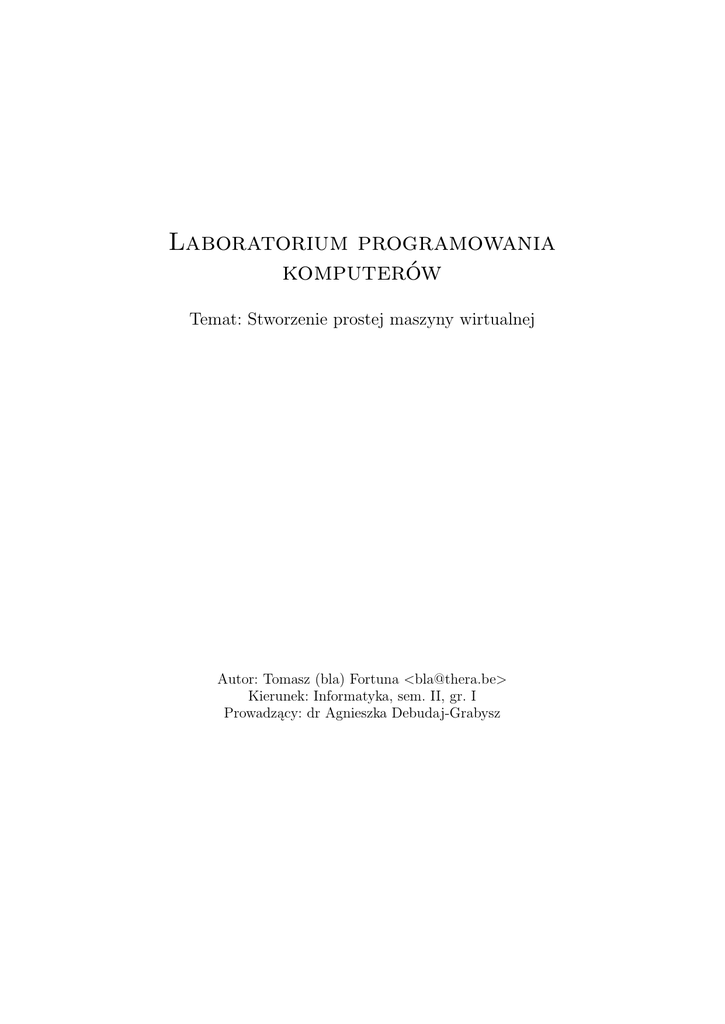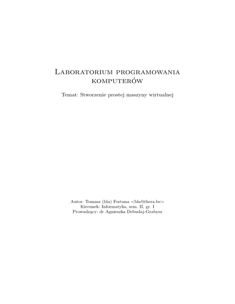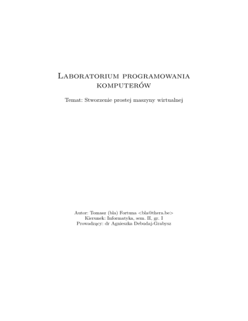Laboratorium programowania komputerów Temat: Stworzenie prostej maszyny wirtualnej Autor: Tomasz (bla) Fortuna <[email protected]> Kierunek: Informatyka, sem. II, gr. I Prowadzący: dr Agnieszka Debudaj-Grabysz Spis treści Spis treści 1 Wstęp i analiza zadania 1.1 Struktury danych . . . . . . . . . . . . . . . . . . . . . . . . . . . . . . . . 1.2 Algorytmy . . . . . . . . . . . . . . . . . . . . . . . . . . . . . . . . . . . . 2 3 3 2 Specyfikacja zewnętrzna 2.1 Programy wchodzące w skład projektu NVM . . . . . . . . . . . . . . . . 2.2 Formaty plików i danych . . . . . . . . . . . . . . . . . . . . . . . . . . . . 2.3 Nagłówek nvmo . . . . . . . . . . . . . . . . . . . . . . . . . . . . . . . . . 4 4 5 6 3 Specyfikacja wewnętrzna 3.1 Kod wspólny . . . . 3.2 NVMasm . . . . . . 3.3 NVM . . . . . . . . . 3.4 NVMcompile . . . . . . . . . . . . . . . . . . . . . . . . . . . . . . . . . . . . . . . . . . . . . . . . . . . . . . . . . . . . . . . . . . . . . . . . . . . . . . . . . . . . . . . . . . . . . . . . . . . . . . . . 4 Podsumowanie . . . . . . . . . . . . . . . . 6 . 6 . 8 . 9 . 10 11 1 Wstęp i analiza zadania Celem projektu jest stworzenie prostej maszyny wirtualnej, składającej się z następujących programów: 1. Środowiska uruchomieniowego. 2. Kompilatora języka niskiego poziomu (zwanego dalej „asemblerem”). 3. Dekompilatora/disasemblera. 4. Kompilatora języka wyższego poziomu (Mimo braku ostatecznej nazwy będę nazywał go albo „Językiem”, albo „bLang”). Projekt, jako całość, otrzymał nazwę NVM (będącą oczywiście rekursywnym akronimem), natomiast poszczególne w/w programy otrzymały kolejno nazwy: NVM, NVMasm, NVMdump, NVMcompile. Trzy pierwsze z nich zostały napisane w języku C, natomiast do napisania NVMcompile posłużył mi yacc i lex w wersji stworzonej dla języka OCaml. Dlatego też ten program jest jak gdyby dodatkiem, a nie samym sednem zadania i nie poświęcę mu wiele uwagi w tym opracowaniu. Z założeń, jakie podjąłem przy tworzeniu projektu warto wymienić przenośność, szybkość i skalowalność. • NVM, NVMasm, NVMdump i NVMcompile powinny być przenośne przynajmniej między platformami x86, x86 64 oraz x86 Cygwin. Natomiast same środowisko uruchomieniowe chciałem ostatecznie przenieść na mikroprocesory AVR. 2 1 Wstęp i analiza zadania • Poświęciłem trochę czasu na optymalizację procesu odczytywania opcodów1 oraz starałem się tak dobrać algorytmy pracy programu, aby wykonywanie instrukcji było jak najszybsze. W przykładach załączony jest prosty program Testcases.nvm, który służył mi do badania czasu potrzebnego na wykonanie kodu bajtowego. • Maszynę można skompilować w paru trybach pracy: w trybie standardowym ustawiającym wielkość słowa maszyny na 32 bity, oraz w pozostałych: 8,16,64 bitach. Ilość bitów ma tu wpływ głównie na: zakres pamięci możliwej do zaadresowania, szerokość danych czytanych/zapisywanych do pamięci, wielkość rejestrów NVM, oraz wielkość plików wykonywalnych. W bardzo prosty sposób można dodawać do NVM nowe operacje. 1.1 Struktury danych Ze względu na chęć osiągnięcia dobrych wyników w prędkości działania maszyny w samym NVM większość struktur jest statyczna. Na przykład struktura będąca sercem wszystkich 3 programów, przechowująca nazwy mnemoników, typy ich parametrów oraz kody operacji. Pamięć jest alokowana tylko w konieczności — podczas operacji na ciągach znaków, gdy wcześniej zarezerwowana pamięć przestaje wystarczać. Jednak sam stan maszyny wirtualnej jest przechowywany w pojedynczej strukturze, która jest alokowana i zwalniana przy pomocy odpowiednich funkcji. O wiele bardziej wyrafinowanych struktur musiałem użyć w NVMasm, gdzie podczas działania budowana jest lista etykiet o znanej wartości, oraz tych o wartości nieznanej wraz z podlistą zawierającą miejsca ich wystąpień. Dzięki tej liście, po przejrzeniu całego pliku źródłowego i ustaleniu adresów/wartości wszystkich etykiet, możliwe jest uzupełnienie operacji, które korzystały z jeszcze nie odnalezionych adresów. Także w przypadku istnienia nie odnalezionej etykiety można użytkownikowi wyświetlić wiadomość informującą go w której linijce wystąpiło odwołanie. NVMcompile ponadto używa tablic adresowanych za pomocą funkcji mieszających2 do trzymania listy zmiennych, a także automatów skończonych. Wszystkie te struktury są jednak zaimplementowane natywnie w języku. 1.2 Algorytmy NVM, trzeba przyznać, nie zawiera żadnych złożonych algorytmicznie problemów. Chciałem natomiast opisać przebieg wykonywania kodu bajtowego przez środowisko uruchomieniowe oraz sposób wczytywania plików przez parser3 i lekser4 . Jest to jedynie opis najważniejszych czynności i całego przebiegu. Algorytmy zastosowane w niektórych z użytych tutaj funkcji są bardziej szczegółowo opisane w specyfikacji wewnętrznej. Wykonywanie kodu bajtowego: 1 liczba kodująca operacje w kodzie bajtowym lub kodzie skompilowanym natywnie ang. hashtable 3 analizator składniowy 4 analizator leksykalny 2 3 2 Specyfikacja zewnętrzna 1. W aktualnej wersji uruchamianie programu zaczyna się od wczytania całego kodu do pamięci. W przyszłości będzie to oparte o funkcje zwrotne5 podające kolejne bajty lub bajty o konkretnym adresie (które np. będą odczytywać program z pamięci SD/MMC) 2. VMExecute(); (VM/Execute.c) wykonuje w pętli następujące dwa kroki: 3. Code2OP(); (VM/OP.c) Przeprowadza konwersję kodu bajtowego na strukturę OP (VM/OP.h). 4. VMExecuteOP(); (VM/Execute.c) Wykonuje operację opisaną strukturą OP. Proces kompilacji kodu asemblera: 1. main() z NVMasm.c; Otwiera pliki wejściowy i wyjściowy; Następnie w pętli wywołuje ParseLine(), aż do zakończenia pliku wejściowego. 2. ParseLine(); Za pomocą danych ze statycznej tabeli operacji buduje struktury opisujące kolejne operacje i zapisuje w tabeli dynam