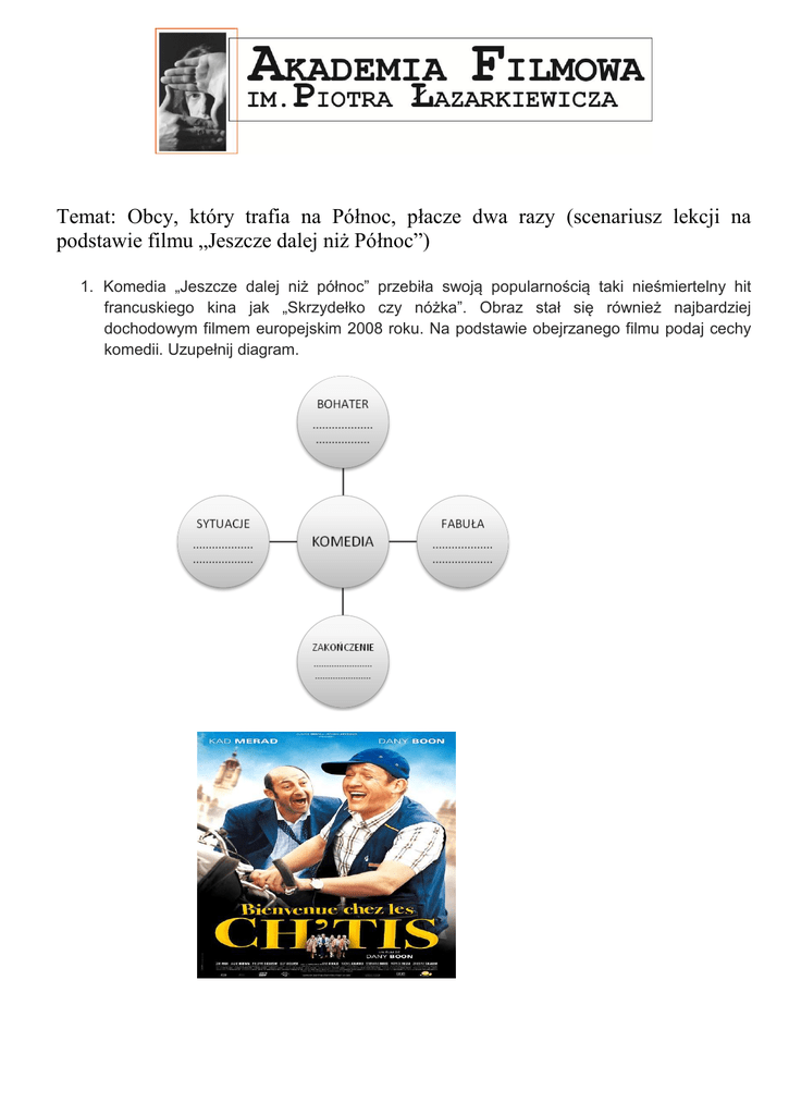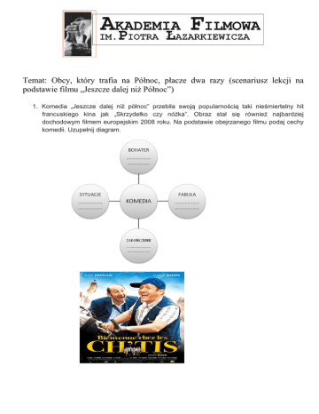 Temat: Obcy, który trafia na Północ, płacze dwa razy (scenariusz lekcji na podstawie filmu „Jeszcze dalej niż Północ”) 1. Komedia „Jeszcze dalej niż północ” przebiła swoją popularnością taki nieśmiertelny hit francuskiego kina jak „Skrzydełko czy nóżka”. Obraz stał się również najbardziej dochodowym filmem europejskim 2008 roku. Na podstawie obejrzanego filmu podaj cechy komedii. Uzupełnij diagram. 2. Przeczytaj fragment rozmowy z reżyserem, scenarzystą i aktorem „Jeszcze dalej niż Północ” w jednej osobie Danym Boonem, następnie wykonaj polecania. Jak narodził się pomysł filmu? Wpadłem na niego jeszcze zanim zrealizowałem swój pierwszy film, "La maison du bonheur". Jednak, ponieważ jest to temat bliski memu sercu, postanowiłem najpierw sprawdzić się jako reżyser. Nie chciałem zepsuć tak ważnego dla mnie tematu. Oczywiście, każdy temat jest ważny, ale ten ma dla mnie wyjątkowe znaczenie: Północ to mój region, moje dzieciństwo… To moi ziomkowie. Liczą na mnie! Chciałem się rozprawić ze stereotypowym, negatywnym spojrzeniem na region Nord-pas-de-Calais. Francuzi, którzy nigdy tam nie byli, postrzegają Północ jako ubogą krainę, gdzie nie ma nic oprócz gnuśnych ludzi, bezrobocia i nieczynnych kopalń. Stąd pomysł, by głównym bohaterem mojej komedii uczynić "obcego", który odkrywa, jacy naprawdę są mieszkańcy francuskiej Północy (którzy sami siebie nazywają "Ch’tis"), odkrywa ich język, kulturę, ich gościnność i dobroć… Wszystko, co podsumować można porzekadłem: obcy, który trafia na Północ, płacze dwa razy: tuż po przyjeździe i tuż przed odjazdem. Wiedziałem, że taki film mogę nakręcić tylko raz, że nie mam prawa do błędu. Jak wyglądało tworzenie scenariusza? Najpierw, przez rok, pisałem sam. Wymyśliłem intrygę, postaci i sporą liczbę scen, które weszły do filmu. Poczułem jednak, że dobrze będzie, gdy zaproszę kogoś do współpracy. Wybrałem Francka Magniera i Alexandre’a Charlota. Franck’a znam od dawna. Kiedyś pisał skecze i pamiętam, że jeździłem do niego do domu, gdzie je przede mną odgrywał. Wszyscy zastanawiali się, czemu proponuję współpracę skromnemu, nikomu nieznanemu facetowi! A ja uważam, że jest sympatyczny i pomysłowy. Poza tym pochodzi z Północy. To on przedstawił mi Alexandre’a Charlota, który wprawdzie nie jest nie jest z Północy, za to jego żona – tak. Obaj są zdolnymi scenarzystami, świetnie się z nimi współpracuje. W ciągu trzech miesięcy powstał scenariusz, który poprawialiśmy praktycznie do ostatniej chwili. Czy podczas pracy przytrafiały się trudności, kłopoty? Naszym celem było stworzenie komedii. Sam nieźle się namęczyłem przez rok! Gdy w teatrze gram postaci z Północy, jest mi łatwiej, ponieważ kpię sam z siebie. Wielu bohaterów moich skeczy to postaci karykaturalne, przerysowane, ale taka jest konwencja, to jest śmieszne. W kinie wygląda to nieco inaczej, postaci muszą być nakreślone dużo subtelniej, w sposób realistyczny i wiarygodny. Główny bohater mojego filmu ma apokaliptyczną wizję Północy: dokładnie taką, jaką mieli ludzie, których przez piętnaście lat spotykałem, występując na południe od Paryża! Wyjaśnij użyte w wywiadzie pojęcia: - region - ………………………………………………………………………………………………………………. - ziomkowie - ………………………………………………………………………………………………………… - stereotyp - …………………………………………………………………………………………………………. - gnuśny - ……………………………………………………………………………………………………………… - skecze - ………………………………………………………………………………………………………………. - karykatura - ………………………………………………………………………………………………………… - subtelny - …………………………………………………………………………………………………………… - apokaliptyczny - …………………………………………………………………………………………………. Napisz, dlaczego temat francuskiej Północy był tak bliski autorowi filmu? …………………………………………………………………………………………………………………………………………………… …………………………………………………………………………………………………………………………………………………… …………………………………………………………………………………………………………………………………………………… ……………………………………………………………… W jaki sposób autor filmu walczy ze stereotypowym widzeniem Północy? …………………………………………………………………………………………………………………………………………………… …………………………………………………………………………………………………………………………………………………… …………………………………………………………………………………… Dlaczego autor filmu chce walczyć ze stereotypami? …………………………………………………………………………………………………………………………………………………… ………………………………………………………………………………………………………… 3. Zastanów się i powiedz, jakie stereotypy krążą wśród w