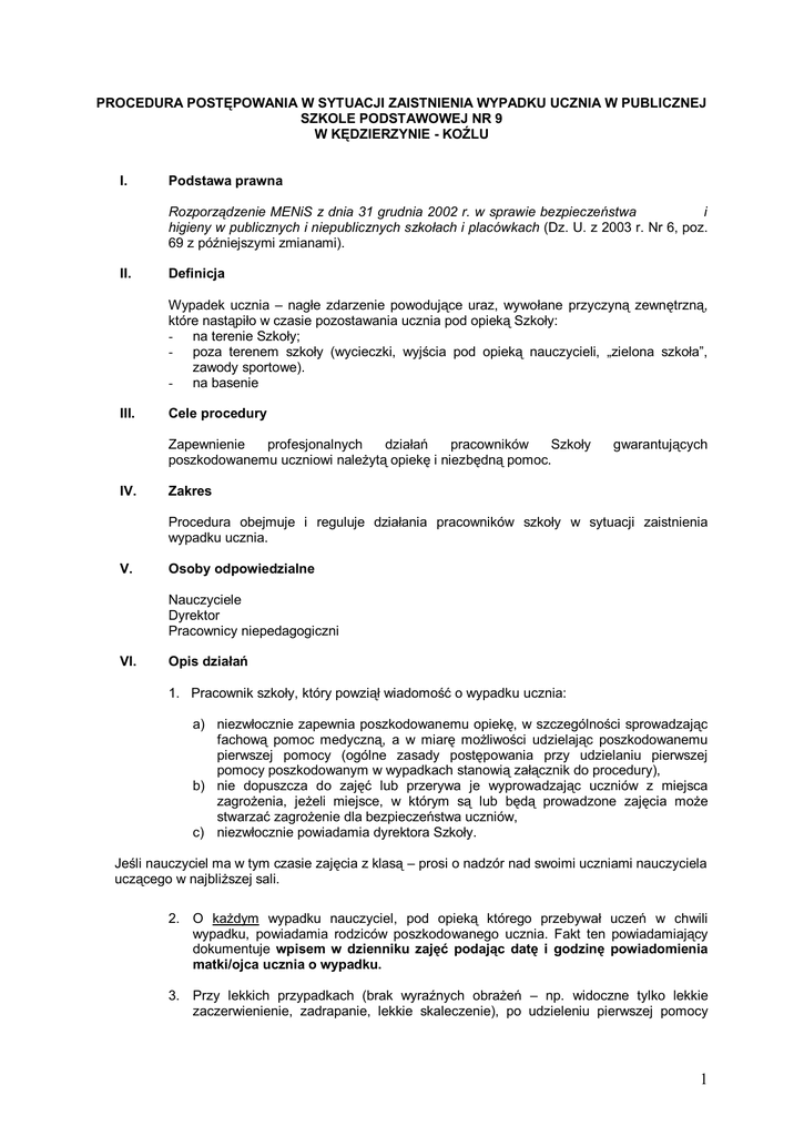 PROCEDURA POSTĘPOWANIA W SYTUACJI ZAISTNIENIA WYPADKU UCZNIA W PUBLICZNEJ SZKOLE PODSTAWOWEJ NR 9 W KĘDZIERZYNIE - KOŹLU I. Podstawa prawna Rozporządzenie MENiS z dnia 31 grudnia 2002 r. w sprawie bezpieczeństwa i higieny w publicznych i niepublicznych szkołach i placówkach (Dz. U. z 2003 r. Nr 6, poz. 69 z późniejszymi zmianami). II. Definicja Wypadek ucznia – nagłe zdarzenie powodujące uraz, wywołane przyczyną zewnętrzną, które nastąpiło w czasie pozostawania ucznia pod opieką Szkoły: - na terenie Szkoły; - poza terenem szkoły (wycieczki, wyjścia pod opieką nauczycieli, „zielona szkoła”, zawody sportowe). - na basenie III. Cele procedury Zapewnienie profesjonalnych działań pracowników Szkoły poszkodowanemu uczniowi należytą opiekę i niezbędną pomoc. IV. gwarantujących Zakres Procedura obejmuje i reguluje działania pracowników szkoły w sytuacji zaistnienia wypadku ucznia. V. Osoby odpowiedzialne Nauczyciele Dyrektor Pracownicy niepedagogiczni VI. Opis działań 1. Pracownik szkoły, który powziął wiadomość o wypadku ucznia: a) niezwłocznie zapewnia poszkodowanemu opiekę, w szczególności sprowadzając fachową pomoc medyczną, a w miarę możliwości udzielając poszkodowanemu pierwszej pomocy (ogólne zasady postępowania przy udzielaniu pierwszej pomocy poszkodowanym w wypadkach stanowią załącznik do procedury), b) nie dopuszcza do zajęć lub przerywa je wyprowadzając uczniów z miejsca zagrożenia, jeżeli miejsce, w którym są lub będą prowadzone zajęcia może stwarzać zagrożenie dla bezpieczeństwa uczniów, c) niezwłocznie powiadamia dyrektora Szkoły. Jeśli nauczyciel ma w tym czasie zajęcia z klasą – prosi o nadzór nad swoimi uczniami nauczyciela uczącego w najbliższej sali. 2. O każdym wypadku nauczyciel, pod opieką którego przebywał uczeń w chwili wypadku, powiadamia rodziców poszkodowanego ucznia. Fakt ten powiadamiający dokumentuje wpisem w dzienniku zajęć podając datę i godzinę powiadomienia matki/ojca ucznia o wypadku. 3. Przy lekkich przypadkach (brak wyraźnych obrażeń – np. widoczne tylko lekkie zaczerwienienie, zadrapanie, lekkie skaleczenie), po udzieleniu pierwszej pomocy 1 poszkodowanemu uczniowi, nauczyciel lub dyrektor powiadamiając rodzica o zdarzeniu ustala z nim: a) potrzebę wezwania pogotowia, b) potrzebę wcześniejszego przyjścia rodzica, c) godzinę odbioru dziecka ze szkoły w dniu zdarzenia Informację o powyższych ustaleniach powiadamiający zamieszcza również dzienniku zajęć. w 4. W każdym trudniejszym przypadku (widoczne obrażenia, urazy, niepokojące objawy) nauczyciel, pedagog, psycholog, sekretarz szkoły lub dyrektor wzywa pogotowie ratunkowe. 5. O każdym wypadku dyrektor szkoły zawiadamia niezwłocznie organ prowadzący i współpracującego ze szkołą pracownika służby bhp. 6. O wypadku śmiertelnym, ciężkim i zbiorowym dyrektor szkoły zawiadamia niezwłocznie prokuratora i kuratora oświaty. 7. O wypadku, do którego doszło w wyniku zatrucia, dyrektor szkoły zawiadamia niezwłocznie państwowego inspektora sanitarnego. 8. Jeżeli wypadek został spowodowany niesprawnością techniczną pomieszczenia lub urządzeń, miejsce wypadku pozostawia się nienaruszone. Dyrektor zabezpiecza je do czasu dokonania oględzin lub wykonania szkicu przez zespół powypadkowy. 9. Jeżeli wypadek zdarzył się w czasie wyjścia, imprezy organizowanej poza terenem szkoły, wszystkie stosowne decyzje podejmuje opiekun grupy/kierownik wycieczki i odpowiada za nie. 10. Dyrektor Szkoły powołuje członków zespołu powypadkowego: a) w skład zespołu wchodzi współpracujący ze Szkołą pracownik służby bezpieczeństwa i higieny pracy oraz pracownik Szkoły przeszkolony w zakresie bhp, b) jeżeli w składzie zespołu nie może uczestniczyć pracownik służby bhp, w skład zespołu wchodzi dyrektor szkoły oraz pracownik szkoły przeszkolony w zakresie bhp, c) w składzie zespołu może uczestniczyć przedstawiciel organu prowadzącego, kuratora oświaty, d) przewodniczącym zespołu jest pracownik służby bhp, a jeżeli nie ma go w składzie zespołu – przewodniczącego zespołu spośród pracowników szkoły wyznacza dyrektor, e) zespół przeprowadza postępowanie powypadkowe i sporządza dokumentację powypadkową; - przesłuchuje poszkodowanego ucznia (w obecności rodzica lub wychowawcy/pedagoga/psychologa szkolnego) sporządza protokół przesłuchania - przesłuchuje świadków wypadku i sporządza protokoły przesłuchania; jeżeli świadkami są uczniowie – przesłuchanie odbywa się w obecności wychowawcy lub pedagoga/psychologa szkolnego, a protokół przesłuchania odczytuje się w obecności ucznia – świadka i jego rodziców - sporządza szkic lub fotografię miejsca wypadku (dotyczy sytuacji określonej w pkt 8) - uzyskuje pisemne oświadczenie nauczyciela, pod opieką którego uczeń przebywał w czasie, gdy zdarzył się wypadek - uzyskuje opinię lekarską z opisem doznanych obrażeń i określeniem rodzaju wypadku sporządza protokół powypadkowy 2 - protokół powypadkowy podpisują członkowie zespołu oraz dyrektor Szkoły w sprawach spornych rozstrzygające jest stanowisko przewodniczącego zespołu; członek zespołu, który nie zgadza się ze stanowiskiem przewodniczącego, może złożyć zdanie odrębne, które odnotowuje się w protokole powypadkowym, g) przewodniczący zespołu poucza osoby reprezentujące poszkodowanego o przysługujących im prawach w toku postępowania powypadkowego. h) z treścią protokołu powypadkowego i innymi materiałami postępowania powypadkowego zaznajamia się rodziców (opiekunów prawnych) poszkodowanego ucznia, którzy potwierdzają ten fakt podpisem w protokole - protokół doręcza się rodzicom (opiekunom prawnym) poszkodowanego ucznia, którzy potwierdzają to podpisem w protokole, - organowi prowadzącemu i kuratorowi oświaty protokół powypadkowy doręcza się na ich wniosek, - 