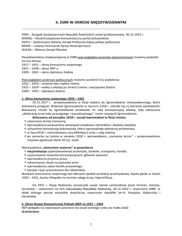 4. ZSRR W OKRESIE MIĘDZYWOJENNYM ________________________________________________________________ ZSRR – Związek Socjalistycznych Republik Radzieckich został proklamowany 30.12.1922 r. WKP(b) – Wszechzwiązkowa Komunistyczna partia bolszewików OGPU – Zjednoczony Główny Zarząd Polityczny (tajna policja polityczna) NKWD – Ludowy Komisariat Spraw Wewnętrznych GUŁAG – Główny Zarząd Obozów Dwudziestolecie międzywojenne w ZSRR pod względem przemian ekonomicznych możemy podzielid na trzy okresy: 1917 – 1921 – okres komunizmu wojennego 1921 – 1928 – okres NEP-u 1929 – 1941 – okres dyktatury Stalina Pod względem przemian politycznych możemy wyróżnid trzy podokresy: 1922 – 1924 – ostatnie lata rządów Lenina 1925 – 1929 – walka o władzę po śmierci Lenina i zwycięstwo Stalina 1930 – 1953 – dyktatura Stalina 1. Okres komunizmu wojennego 1918 – 1921 25.11.1917 r. przeprowadzono w Rosji wybory do Zgromadzenia Ustawodawczego, które bolszewicy przegrali. Wybrane Zgromadzenie w styczniu 1918 r. zebrało się na pierwsze posiedzenie. Bolszewicy chcieli by Zgromadzenie przekazało im całą konstytucyjną władzę. Gdy odrzucono „deklarację praw ludu pracującego i wyzyskiwanego”, Lenin rozwiązał Zgromadzenie. Bolszewicy od początku 1918 r. zaczęli wprowadzad w Rosji zmiany: utworzono Armię Czerwoną wprowadzono powszechny obowiązek wojskowy robotników i biedoty wiejskiej uchwalono konstytucję bolszewicką, która wprowadzała dyktaturę proletariatu w lipcu1918 r. zamordowano cara Mikołaja II wraz z całą rodziną po zamachu na Lenina w sierpniu 1918 r. wprowadzono „czerwony terror” – przeprowadzono masowe egzekucje około 50 tys. osób. Wprowadzono „komunizm wojenny” w gospodarce nacjonalizacja (upaostwowienie) przemysłu, banków, transportu, handlu racjonowanie towarów konsumpcyjnych, głównie żywności wprowadzono przymus pracy rekwirowano zboże na potrzeby armii wprowadzono zakaz handlu prywatnego obcięto racje żywnościowe dla robotników Skutkiem komunizmu wojennego był olbrzymi spadek produkcji przemysłowej, klęska głodu w latach 1920 – 1921, bunty chłopskie na terenie całego kraju, hiperinflacja. Do 1921 r. Rosja Radziecka rozszerzyła swoje ziemie zamieszkane przez Ormian, Azerów, Gruzinów – utworzono na nich Zakaukaską Republikę Radziecką. 30.12.1922 r. utworzono ZSRR w skład którego weszły wszystkie dotychczas utworzone republiki (m.in. Rosyjska, Białoruska i Ukraioska) 2. Okres Nowej Ekonomicznej Polityki (NEP-u) 1921 – 1928 NEP polegała na częściowym powrocie do zasad wolnego rynku (w małej skali) a) przyczyny: 1 całkowite zniszczenie kraju po I wojnie światowej i wojnie domowej brak dostatecznej ilości żywności mimo zasad komunizmu wojennego i związany z tym głód 1920 – 1921 bunt przeciwko polityce gospodarczej paostwa chęd przywrócenia zaufania do paostwa tak obywateli jak i paostw obcych (aby zniesiono blokadę Rosji Radzieckiej) b) założenia: zniesienie komunizmu wojennego oraz centralnego rozdzielnictwa towarów zlikwidowano obowiązkowe dostawy żywności, przywrócenie zasad wolnego rynku – pozwolono na sprzedaż nadwyżek żywności (rozwój drobnego handlu prywatnego) rozwój drobnej własności prywatnej w przemyśle, rzemiośle, rolnictwie, handlu z wyłączeniem głównych gałęzi przemysłu, które nadal stanowiły monopol paostwowy c) skutki: wzrost produkcji przemysłowej i rolniczej przyczynił się do odrodzenia rynku wewnętrznego i odbudowy kraju ze zniszczeo wojennych, umocniła się pozycja rubla, który stał się monetą wymienialną, zaspokojono potrzeby rynku jeżeli chodzi o dostawy żywności, nastąpiło rozwarstwienie społeczeostwa pod względem majątkowym co najsilniej widad było na wsi rozpoczęto GOERLO – powszechną elektryfikację w 1924 r. przeprowadzono reformę monetarną – ujednolicono walutę 3. Walka o władzę po śmierci Włodzimierza Ilicza Lenina 1924 – 1929 a) główni konkurenci polityczni: Lew Trocki - organizator Armii Czerwonej, dowódca puczu październikowego, komisarz obrony do 1924 r., zwolennik permanentnej rewolucji, Lew Kamieniew – sekretarz moskiewskiej organizacji partyjnej, pierwszy przewodniczący Komitetu Wykonawczego WKP(b), od 1922 r. członek Rady Komisarzy Ludowych (rządu), reprezentował lewicowe skrzydło partii. Grigorij Zinowiew – sekretarz leningradzkiej organizacji partyjnej, pierwszy przewodniczący Kominternu, reprezentował prawicowe skrzydło partii. Nikołaj Bucharin – drugi po Leninie teoretyk partii, redaktor „Prawdy”, reprezentował prawicowe skrzydło partii. Józef Wisarionowicz Stalin – od 1922 r. Sekretarz Generalny WKP(b) – oficjalnie neutralny. b) przejęcie władzy przez Stalina – etapy : 1922 – 1925 – triumwirat Zinowiew – Kamieniew – Stalin. Sojusz Stalina z lewicą w celu usunięcia Trockiego. 1925 – 1929 – rządy Stalina w oparciu o prawicę Bucharina. Wyeliminowanie Zinowiewa i Kamieniewa. koniec 1929 – 1934 r. – przejęcie pełnej władzy przez Stalina i jego współpracowników, wyeliminowanie Bucharina i przygotowanie się do przejęcia niepodzielnej władzy poprzez całkowite usunięcie opozycji i możliwych konkurentów. 1934 – początek niepodzielnej dyktatury Stalina. 4. Polityka gospodarcza 1929 – 1941 r. Cechy charakterystyczne: gwałtowny rozwój przemysłu ciężkiego kosztem innych dziedzin gospodarki, centralne planowanie, powszechne wykorzystywanie więźniów. a) rolnictwo – kolektywizacja – likwidacja prywatnych gospodarstw chłopskich na rzecz kołchozów (gospodarstwa spółdzielcze) i sowchozów (gospodarstwa paostwowe). 2 trwała od kooca 1929 r. do 1933 r.; największy rozmach styczeo – marzec 1930 r. Skierowana przeciwko „kułakom”. Zostało nią objęte około 130 milionów chłopów – około 10 mln zostało deportowanych (Azja Środkowa, północna Syberia, europejska częśd ZSRR). Kułak