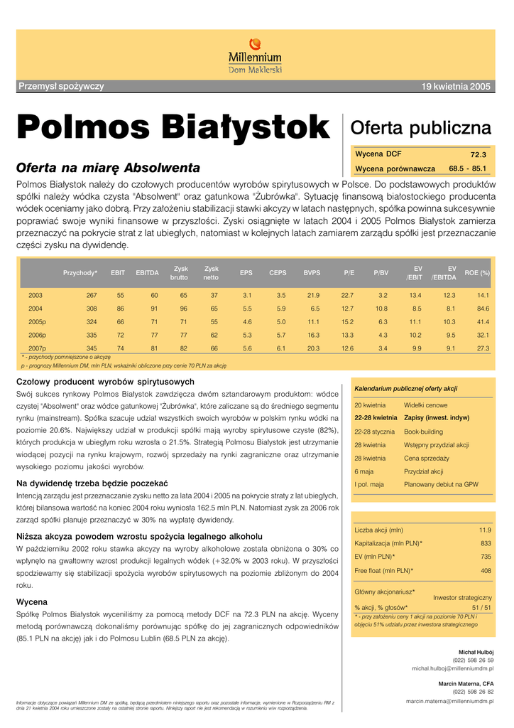 Przemysł spożywczy 19 kwietnia 2005 Polmos Białystok Oferta publiczna Wycena DCF Oferta na miarę Absolwenta 72.3 68.5 - 85.1 Wycena porównawcza Polmos Białystok należy do czołowych producentów wyrobów spirytusowych w Polsce. Do podstawowych produktów spółki należy wódka czysta "Absolwent" oraz gatunkowa "Żubrówka". Sytuację finansową białostockiego producenta wódek oceniamy jako dobrą. Przy założeniu stabilizacji stawki akcyzy w latach następnych, spółka powinna sukcesywnie poprawiać swoje wyniki finansowe w przyszłości. Zyski osiągnięte w latach 2004 i 2005 Polmos Białystok zamierza przeznaczyć na pokrycie strat z lat ubiegłych, natomiast w kolejnych latach zamiarem zarządu spółki jest przeznaczanie części zysku na dywidendę. Przychody* EBIT EBITDA Zysk brutto Zysk netto EPS CEPS BVPS P/E 2003 267 55 60 65 37 3.1 3.5 21.9 2004 308 86 91 96 65 5.5 5.9 6.5 2005p 324 66 71 71 55 4.6 5.0 2006p 335 72 77 77 62 5.3 2007p 345 74 81 82 66 5.6 P/BV EV /EBIT EV /EBITDA ROE (%) 22.7 3.2 13.4 12.3 14.1 12.7 10.8 8.5 8.1 84.6 11.1 15.2 6.3 11.1 10.3 41.4 5.7 16.3 13.3 4.3 10.2 9.5 32.1 6.1 20.3 12.6 3.4 9.9 9.1 27.3 * - przychody pomniejszone o akcyzê p - prognozy Millennium DM, mln PLN, wska¿niki obliczone przy cenie 70 PLN za akcjê Czołowy producent wyrobów spirytusowych Swój sukces rynkowy Polmos Białystok zawdzięcza dwóm sztandarowym produktom: wódce Kalendarium publicznej oferty akcji czystej "Absolwent" oraz wódce gatunkowej "Żubrówka", które zaliczane są do średniego segmentu 20 kwietnia Wide³ki cenowe rynku (mainstream). Spółka szacuje udział wszystkich swoich wyrobów w polskim rynku wódki na 22-28 kwietnia Zapisy (inwest. indyw) poziomie 20.6%. Największy udział w produkcji spółki mają wyroby spirytusowe czyste (82%), 22-28 stycznia Book-building których produkcja w ubiegłym roku wzrosła o 21.5%. Strategią Polmosu Białystok jest utrzymanie 28 kwietnia Wstêpny przydzia³ akcji wiodącej pozycji na rynku krajowym, rozwój sprzedaży na rynki zagraniczne oraz utrzymanie 28 kwietnia Cena sprzeda¿y 6 maja Przydzia³ akcji I po³. maja Planowany debiut na GPW wysokiego poziomu jakości wyrobów. Na dywidendę trzeba będzie poczekać Intencją zarządu jest przeznaczanie zysku netto za lata 2004 i 2005 na pokrycie straty z lat ubiegłych, której bilansowa wartość na koniec 2004 roku wyniosła 162.5 mln PLN. Natomiast zysk za 2006 rok zarząd spółki planuje przeznaczyć w 30% na wypłatę dywidendy. Niższa akcyza powodem wzrostu spożycia legalnego alkoholu W październiku 2002 roku stawka akcyzy na wyroby alkoholowe została obniżona o 30% co wpłynęło na gwałtowny wzrost produkcji legalnych wódek (+32.0% w 2003 roku). W przyszłości spodziewamy się stabilizacji spożycia wyrobów spirytusowych na poziomie zbliżonym do 2004 roku. Wycena Spółkę Polmos Białystok wyceniliśmy za pomocą metody DCF na 72.3 PLN na akcję. Wyceny metodą porównawczą dokonaliśmy porównując spółkę do jej zagranicznych odpowiedników Liczba akcji (mln) 11.9 Kapitalizacja (mln PLN)* 833 EV (mln PLN)* 735 Free float (mln PLN)* 408 G³ówny akcjonariusz* % akcji, % g³osów* Inwestor strategiczny 51 / 51 * - przy za³o¿eniu ceny 1 akcji na poziomie 70 PLN i objêciu 51% udzia³u przez inwestora strategicznego (85.1 PLN na akcję) jak i do Polmosu Lublin (68.5 PLN za akcję). Michał Hulbój (022) 598 26 59 [email protected] Marcin Materna, CFA (022) 598 26 82 Informacje dotyczące powiązań Millennium DM ze spółką, będącą przedmiotem niniejszego raportu oraz pozostałe informacje, wymienione w Rozporządzeniu RM z dnia 21 kwietnia 2004 roku umieszczone zostały na ostatniej stronie raportu. Niniejszy raport nie jest rekomendacją w rozumieniu w/w rozporządzenia. [email protected] SPIS TREŚCI Czynniki ryzyka...................................................................................3 Oferta Publiczna................................................................................... 4 Wycena.................................................................................................4 Podsumowanie wycen ..................................................................... 4 Wycena metodą DCF .............................................................................. 5 Wycena metodą porównawczą ..................................................... 6 Działalność spółki..................................................................................... 7 Produkcja.....................................................................................8 Strategia......................................................................................9 Akcjonariat...................................................................................... 10 Sytuacja finansowa...................................................................................... 10 Prognozy wyników finansowych............................................................................. 14 Sprzedaż oraz rentowność........................................... ............................................ 14 Dywidenda.................................................................................... 15 Analiza SWOT......................................................................................1 5 Rynek produkcji alkoholi w Polsce...................................................................................... 16 Akcyza.................................................................................... 17 Sprawozdania finansowe............................................................... 1 9 2 Polmos Białystok Czynniki ryzyka Spośród wielu ryzyk inwestycyjnych, jakie związane są z zakupem akcji spółki Polmos Białystok, chcielibyśmy zwrócić szczególną uwagę na następujące czynniki: q Akcyza. Wartość akcyzy płaconej od wyrobów alkoholowych jest szczególnie ważna dla producentów wyrobów spirytusowych