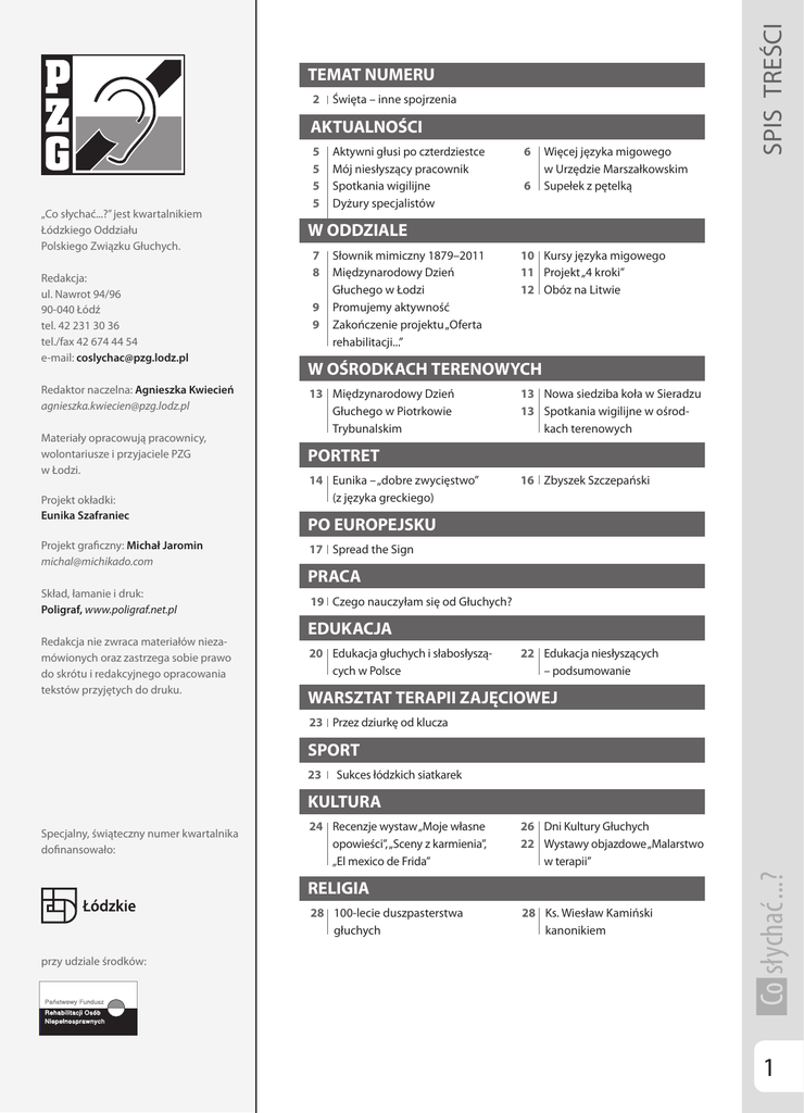 2 Święta – inne spojrzenia AKTUALNOŚCI „Co słychać...?” jest kwartalnikiem Łódzkiego Oddziału Polskiego Związku Głuchych. Redakcja: ul. Nawrot 94/96 90-040 Łódź tel. 42 231 30 36 tel./fax 42 674 44 54 e-mail: [email protected] Redaktor naczelna: Agnieszka Kwiecień [email protected] Materiały opracowują pracownicy, wolontariusze i przyjaciele PZG w Łodzi. Projekt okładki: Eunika Szafraniec 5Aktywni głusi po czterdziestce 5 Mój niesłyszący pracownik 5 Spotkania wigilijne 5 Dyżury specjalistów 6 Więcej języka migowego w Urzędzie Marszałkowskim 6Supełek z pętelką W ODDZIALE 7 Słownik mimiczny 1879–2011 8 Międzynarodowy Dzień Głuchego w Łodzi 9 Promujemy aktywność 9 Zakończenie projektu „Oferta rehabilitacji...” 10 Kursy języka migowego 11 Projekt „4 kroki” 12 Obóz na Litwie W OŚRODKACH TERENOWYCH 13 Międzynarodowy Dzień Głuchego w Piotrkowie Trybunalskim 13 Nowa siedziba koła w Sieradzu 13 Spotkania wigilijne w ośrodkach terenowych PORTRET 14 Eunika – „dobre zwycięstwo” (z języka greckiego) 16 Zbyszek Szczepański PO EUROPEJSKU Projekt graficzny: Michał Jaromin [email protected] 17 Spread the Sign Skład, łamanie i druk: Poligraf, www.poligraf.net.pl 19 Czego nauczyłam się od Głuchych? Redakcja nie zwraca materiałów niezamówionych oraz zastrzega sobie prawo do skrótu i redakcyjnego opracowania tekstów przyjętych do druku. SPIS TREŚCI TEMAT NUMERU PRACA EDUKACJA 20 Edukacja głuchych i słabosłyszących w Polsce 22 Edukacja niesłyszących – podsumowanie WARSZTAT TERAPII ZAJĘCIOWEJ 23 Przez dziurkę od klucza SPORT 23 Sukces łódzkich siatkarek KULTURA 24 Recenzje wystaw „Moje własne opowieści”, „Sceny z karmienia”, „El mexico de Frida” 26 Dni Kultury Głuchych 22 Wystawy objazdowe „Malarstwo w terapii” RELIGIA 28 100-lecie duszpasterstwa głuchych przy udziale środków: 28 Ks. Wiesław Kamiński kanonikiem Co słychać...? Specjalny, świąteczny numer kwartalnika dofinansowało: 1 TEMAT NUMERU | Święta – inne spojrzenia Tradycje świąteczne na świecie Na całym świecie z okazji świąt Bożego Narodzenia panuje niezwykła atmosfera, czy to w krajach pokrytych śniegową czapą, czy pod palącym słońcem Afryki. Niektóre zwyczaje świąteczne są odmienne od naszych. W tym miejscu chcielibyśmy przybliżyć kilka sposobów obchodzenia Bożego Narodzenia w różnych krajach na świecie. Naszą podróż rozpoczniemy od Bałkanów, a skończymy na Stanach Zjednoczonych. Serbowie poświęcają bardzo dużo uwagi w wigilijny wieczór swym zmarłym. Rozpalają wówczas ogniska paląc w nich wielkie kłody drewna, przystrojone w gałązki laurowe. Do jednego z trzech leżących na dole chlebów wkładają gałązki, pomarańcze. Macedończycy wrzucają do palącego się całą noc ogniska stare buty. Ma to na celu odpędzenie złych duchów. Podstawowymi potrawami wigilijnej wieczerzy są wino, miód, owoce oraz specjalne placki zwane Chlebem Chrystusa. Szwedzi przygotowania do Bożego Narodzenia rozpoczynają w dniu św. Łucji (13 grudnia). W wigilię spożywa się uroczysty obiad, jednym z dań jest chleb domowego wypieku z imbirem oraz tzw. Lufisk – jest to solona i wysuszona na wolnym powietrzu w niskiej temperaturze ryba, np. dorsz, rozdrobniony na kawałki, które się gotuje i podaje ze specjalnym białym sosem. Tradycyjną potrawą jest również chleb moczony w wodzie, w której wcześniej gotowano świąteczną szynkę. Szwedzi nie posiadają własnych kolęd i większość jest tłumaczeniami z zagranicy. Ciekawostką jest, że znalazła się wśród nich polska kolęda „Gdy się Chrystus rodzi”. Szwedzi choinkę stawiają już na początku adwentu. Na Węgrzech najbardziej uroczystą chwilą jest wieczerza wigilijna. Węgrzy jadają zupę rybną, rybę smażoną, bejgly – zawijańce z makiem i orzechami, galaretę z ryby i gołąbki. W każdym domu obrus na świątecznym stole posypywany jest soczewicą (symbol dobrobytu), a pod obrusem nie może zabraknąć siana. W pierwszy dzień świąt obowiązkowym daniem jest indyk nadziewany kasztanami i owocami. We Francji małym dzieciom w domach katolickich mówi się, że sam „petit Jesus” (mały Jezusek) przynosi im podarunki i wkłada je w buty, a na wsiach w starodawne saboty. Dawniej wszyscy zbierali się wieczorem i śpiewali kolędy. Do wieczerzy zasiadano po pasterce, gdzie podawano ostrygi, indyka nadziewanego kasztanami, różne potrawy z jaj, słodycze oraz obowiązkowym tortem w kształcie polana drzewa. W Norwegi, podobnie jak w Szwecji, święta nabierają siły od dnia św. Łucji. W domach waży się specjalne świąteczne piwo zwane julej. Święta zaczynają się tak naprawdę już 21 grudnia. Dawniej od tej daty obowiązywał tzw. Pokój Boży, do dziś pozostała tradycja niewykonywania w tym czasie poważniejszych prac. W wigilię po nabożeństwie wszyscy zbierają się na kolację. Pierwszym daniem jest owsianka z jednym migdałem. Ten, kto go znajdzie, otrzymuje podarek. Mieszkańcy Stanów Zjednoczonych w grudniowy weekend mają domy otwarte. Znajomi mogą przyjść, zjeść kolację, której specjałem jest pieczony indyk. 25 grudnia rodziny spotykają się przy choince, gdzie każdy otrzymuje prezent. Na stole obowiązkowym elementem jest kwiat bożonarodzeniowy – pinsetti, a na drzwiach świerkowe wianki. Tradycyjna wieczerza amerykańska obchodzi się bez ryb, króluje rumiany indyk, szynka, ciasta z kremem. Ciekawostką jest fakt, że karpie w USA uważane są za chwast rybny i wymagają zwalczania. Ponieważ poławiają go tylko biedniejsi wędkarze, w tym głównie Słowianie, Żydzi, Murzyni, Latynosi – stąd też niska ranga lub wręcz brak naszego karpia na amerykańskich stołach. Źródło: g1.zawiercie.pl Co słychać...? Kiedy naprawdę urodził się Bóg i skąd się wzięły prezenty pod choinką? 2 Grudzień to czas świąteczny. Wszyscy przygotowują się do obchodzenia