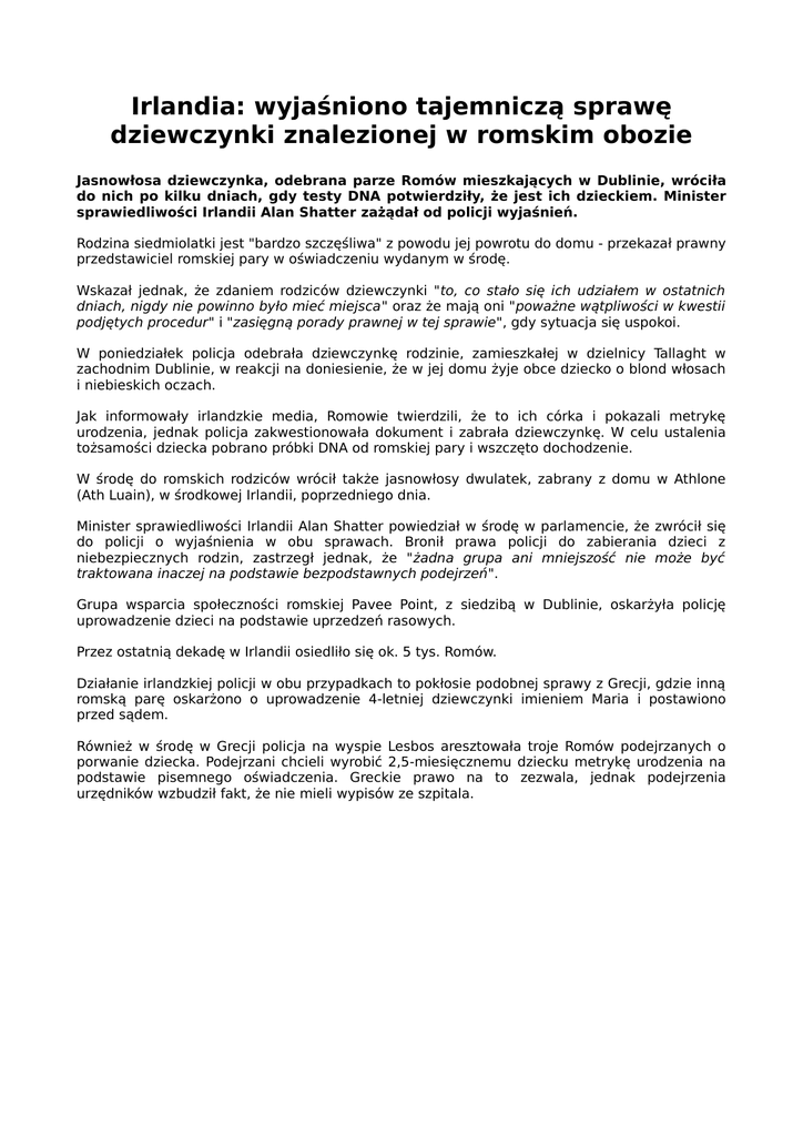 Irlandia: wyjaśniono tajemniczą sprawę dziewczynki znalezionej w romskim obozie Jasnowłosa dziewczynka, odebrana parze Romów mieszkających w Dublinie, wróciła do nich po kilku dniach, gdy testy DNA potwierdziły, że jest ich dzieckiem. Minister sprawiedliwości Irlandii Alan Shatter zażądał od policji wyjaśnień. Rodzina siedmiolatki jest "bardzo szczęśliwa" z powodu jej powrotu do domu - przekazał prawny przedstawiciel romskiej pary w oświadczeniu wydanym w środę. Wskazał jednak, że zdaniem rodziców dziewczynki "to, co stało się ich udziałem w ostatnich dniach, nigdy nie powinno było mieć miejsca" oraz że mają oni "poważne wątpliwości w kwestii podjętych procedur" i "zasięgną porady prawnej w tej sprawie", gdy sytuacja się uspokoi. W poniedziałek policja odebrała dziewczynkę rodzinie, zamieszkałej w dzielnicy Tallaght w zachodnim Dublinie, w reakcji na doniesienie, że w jej domu żyje obce dziecko o blond włosach i niebieskich oczach. Jak informowały irlandzkie media, Romowie twierdzili, że to ich córka i pokazali metrykę urodzenia, jednak policja zakwestionowała dokument i zabrała dziewczynkę. W celu ustalenia tożsamości dziecka pobrano próbki DNA od romskiej pary i wszczęto dochodzenie. W środę do romskich rodziców wrócił także jasnowłosy dwulatek, zabrany z domu w Athlone (Ath Luain), w środkowej Irlandii, poprzedniego dnia. Minister sprawiedliwości Irlandii Alan Shatter powiedział w środę w parlamencie, że zwrócił się do policji o wyjaśnienia w obu sprawach. Bronił prawa policji do zabierania dzieci z niebezpiecznych rodzin, zastrzegł jednak, że "żadna grupa ani mniejszość nie może być traktowana inaczej na podstawie bezpodstawnych podejrzeń". Grupa wsparcia społeczności romskiej Pavee Point, z siedzibą w Dublinie, oskarżyła policję uprowadzenie dzieci na podstawie uprzedzeń rasowych. Przez ostatnią dekadę w Irlandii osiedliło się ok. 5 tys. Romów. Działanie irlandzkiej policji w obu przypadkach to pokłosie podobnej sprawy z Grecji, gdzie inną romską parę oskarżono o uprowadzenie 4-letniej dziewczynki imieniem Maria i postawiono przed sądem. Również w środę w Grecji policja na wyspie Lesbos aresztowała troje Romów podejrzanych o porwanie dziecka. Podejrzani chcieli wyrobić 2,5-miesięcznemu dziecku metrykę urodzenia na podstawie pisemnego oświadczenia. Greckie prawo na to zezwala, jednak podejrzenia urzędników wzbudził fakt, że nie mieli wypisów ze szpitala.