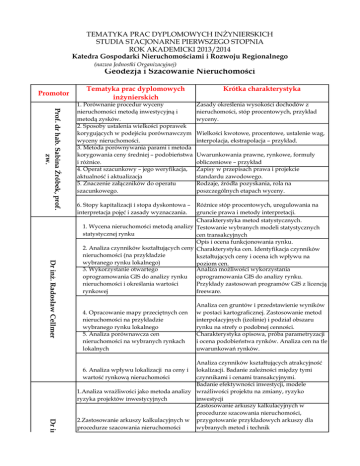 TEMATYKA PRAC DYPLOMOWYCH INśYNIERSKICH STUDIA STACJONARNE PIERWSZEGO STOPNIA ROK AKADEMICKI 2013/2014 Katedra Gospodarki Nieruchomościami i Rozwoju Regionalnego (nazwa Jednostki Organizacyjnej) Geodezja i Szacowanie Nieruchomości Promotor Tematyka prac dyplomowych inŜynierskich Prof. dr hab. Sabina Źróbek, prof. zw. 1. Porównanie procedur wyceny nieruchomości metodą inwestycyjną i metodą zysków. 2. Sposoby ustalenia wielkości poprawek korygujących w podejściu porównawczym wyceny nieruchomości. 3. Metoda porównywania parami i metoda korygowania ceny średniej – podobieństwa i róŜnice. 4. Operat szacunkowy – jego weryfikacja, aktualność i aktualizacja 5. Znaczenie załączników do operatu szacunkowego. Krótka charakterystyka Zasady określenia wysokości dochodów z nieruchomości, stóp procentowych, przykład wyceny. Wielkości kwotowe, procentowe, ustalenie wag, interpolacja, ekstrapolacja – przykład. Uwarunkowania prawne, rynkowe, formuły obliczeniowe – przykład Zapisy w przepisach prawa i projekcie standardu zawodowego. Rodzaje, źródła pozyskania, rola na poszczególnych etapach wyceny. 6. Stopy kapitalizacji i stopa dyskontowa – interpretacja pojęć i zasady wyznaczania. Dr inŜ. Radosław Cellmer RóŜnice stóp procentowych, uregulowania na gruncie prawa i metody interpretacji. Charakterystyka metod statystycznych. 1. Wycena nieruchomości metodą analizy Testowanie wybranych modeli statystycznych statystycznej rynku cen transakcyjnych Opis i ocena funkcjonowania rynku. 2. Analiza czynników kształtujących ceny Charakterystyka cen. Identyfikacja czynników nieruchomości (na przykładzie kształtujących ceny i ocena ich wpływu na wybranego rynku lokalnego) poziom cen. 3. Wykorzystanie otwartego Analiza moŜliwości wykorzystania oprogramowania GIS do analizy rynku oprogramowania GIS do analizy rynku. nieruchomości i określania wartości Przykłady zastosowań programów GIS z licencją rynkowej freeware. 4. Opracowanie mapy przeciętnych cen nieruchomości na przykładzie wybranego rynku lokalnego 5. Analiza porównawcza cen nieruchomości na wybranych rynkach lokalnych Analiza cen gruntów i przedstawienie wyników w postaci kartograficznej. Zastosowanie metod interpolacyjnych (izolinie) i podział obszaru rynku na strefy o podobnej cenności. Charakterystyka opisowa, próba parametryzacji i ocena podobieństwa rynków. Analiza cen na tle uwarunkowań rynków. Analiza czynników kształtujących atrakcyjność lokalizacji. Badanie zaleŜności między tymi czynnikami i cenami transakcyjnymi. Badanie efektywności inwestycji, modele 1.Analiza wraŜliwości jako metoda analizy wraŜliwości projektu na zmiany, ryzyko ryzyka projektów inwestycyjnych inwestycji Zastosowanie arkuszy kalkulacyjnych w procedurze szacowania nieruchomości, 2.Zastosowanie arkuszy kalkulacyjnych w przygotowanie przykładowych arkuszy dla procedurze szacowania nieruchomości wybranych metod i technik 6. Analiza wpływu lokalizacji na ceny i wartość rynkową nieruchomości Dr inŜ. Mirosław Dr inŜ. Mirosław Bełej 3.Ocena preferencji potencjalnych Badania socjologiczne (ankietowe) wybranego nabywców na potrzeby inwestycji na rynku obszaru inwestowania na rynku nieruchomości, nieruchomości wpływ cech na ceny nieruchomości Analiza cen rynku nieruchomości w aspekcie czasowym, badanie tendencji na rynku 4.Konstruowanie indeksów cen nieruchomości, budowa indeksów nieruchomości o funkcji mieszkalnej 5.Analiza cen nieruchomości na Badanie rozkładu przestrzennego cen danego przykładzie rynku nieruchomości segmentu rynku nieruchomości, badanie mieszkalnych zaleŜności i relacji 6. Analiza wysokości kształtowania się Badanie rozkładu przestrzennego cen danego stawek czynszu na rynku nieruchomości segmentu rynku nieruchomości, badanie komercyjnych zaleŜności i relacji TEMATYKA PRAC DYPLOMOWYCH INśYNIERSKICH STUDIA STACJONARNE PIERWSZEGO STOPNIA ROK AKADEMICKI 2013/2014 Katedra Gospodarki Nieruchomościami i Rozwoju Regionalnego (nazwa Jednostki Organizacyjnej) Doradztwo Na Rynku Nieruchomości Promotor Tematyka prac dyplomowych inŜynierskich Krótka charakterystyka Dr inŜ. Radosław Cellmer Charakterystyka czynności pośrednika. 1. Rola pośrednika w obrocie Wywiady z pośrednikami. Ocena jakości usług. nieruchomościami na rynku nieruchomości. Symulacja transakcji. 2. Analiza czynników kształtujących popyt Charakterystyka opisowa uwarunkowań i podaŜ i ceny na nieruchomości gospodarczych, prawnych, demograficznych itp. mieszkaniowe (na przykładzie wybranego Próba oceny i postawienie diagnozy. rynku lokalnego). 3. Zastosowanie metod statystycznych do Wykorzystanie metod ilościowych (analiza analizy cen lokali mieszkalnych (na wariancji, korelacji, regresji itp.) do oceny przykładzie wybranego rynku lokalnego). wpływu wybranych czynników na ceny. 4. Źródła informacji na potrzeby analizy Analiza i charakterystyka poszczególnych źródeł rynku nieruchomości. informacji. Ocena jakości informacji. Charakterystyka i opis systemu MLS. 5. MLS jako narzędzie pracy pośrednika w Charakterystyka istniejących w Polsce systemów obrocie nieruchomościami. MLS. 6. Analiza porównawcza cen Charakterystyka rynku wtórnego i pierwotnego. nieruchomości na rynku pierwotnym i Wykorzystanie metod ilościowych do analiz wtórnym (na wybranym przykładzie). porównawczych. Charakterystyka zasad segmentacji rynku. 7. Segmentacja i analiza rynku na potrzeby Określenie i charakterystyka segmentów na doradztwa na rynku nieruchomości. wybranym rynku lokalnym. 8. Modelowanie zmian cen nieruchomości Analiza szeregów czasowych. Identyfikacja mieszkaniowych w wybranych miastach trendów i wahań sezonowych. Prognozy cen. Polski. Identyfikacja cech rynkowych. Zbudowanie 9. Metody sondaŜowe analizy wpływu cech kwestionariusza. Przeprowadzenie badań rynkowych na ceny nieruchomości. ankietowych. Analiza wyników. Badanie efektywności inwest