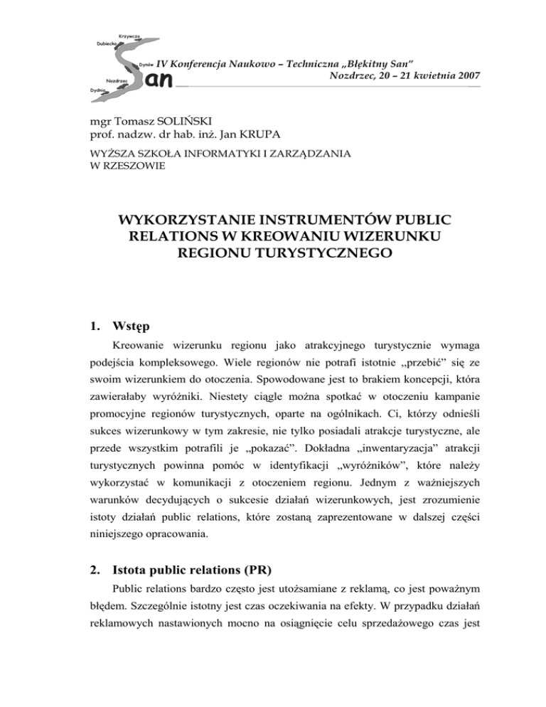 Krzywcza Dubiecko Dynów Nozdrzec IV Konferencja Naukowo – Techniczna „Błękitny San” Nozdrzec, 20 – 21 kwietnia 2007 Dydnia mgr Tomasz SOLIŃSKI prof. nadzw. dr hab. inŜ. Jan KRUPA WYśSZA SZKOŁA INFORMATYKI I ZARZĄDZANIA W RZESZOWIE WYKORZYSTANIE INSTRUMENTÓW PUBLIC RELATIONS W KREOWANIU WIZERUNKU REGIONU TURYSTYCZNEGO 1. Wstęp Kreowanie wizerunku regionu jako atrakcyjnego turystycznie wymaga podejścia kompleksowego. Wiele regionów nie potrafi istotnie ,,przebić” się ze swoim wizerunkiem do otoczenia. Spowodowane jest to brakiem koncepcji, która zawierałaby wyróŜniki. Niestety ciągle moŜna spotkać w otoczeniu kampanie promocyjne regionów turystycznych, oparte na ogólnikach. Ci, którzy odnieśli sukces wizerunkowy w tym zakresie, nie tylko posiadali atrakcje turystyczne, ale przede wszystkim potrafili je „pokazać”. Dokładna „inwentaryzacja” atrakcji turystycznych powinna pomóc w identyfikacji „wyróŜników”, które naleŜy wykorzystać w komunikacji z otoczeniem regionu. Jednym z waŜniejszych warunków decydujących o sukcesie działań wizerunkowych, jest zrozumienie istoty działań public relations, które zostaną zaprezentowane w dalszej części niniejszego opracowania. 2. Istota public relations (PR) Public relations bardzo często jest utoŜsamiane z reklamą, co jest powaŜnym błędem. Szczególnie istotny jest czas oczekiwania na efekty. W przypadku działań reklamowych nastawionych mocno na osiągnięcie celu sprzedaŜowego czas jest Tomasz Soliński, Jan Krupa krótszy aniŜeli w przypadku działań kreujących wizerunek. Jest to o tyle istotne, Ŝe osoby podejmujące działania PR szybko się zniechęcają do nich ze względu na brak widocznych efektów w krótkim okresie czasu. Niepowodzenia w zakresie kreowania wizerunku regionów, w tym równieŜ turystycznych, wynikają z wielu błędów. Jednym z nich są chaotyczne działania – często spontaniczne. Brak systematyki w działaniach nie sprzyja w budowaniu trwałego wizerunku. Innym istotnym błędem popełnianym na etapie projektowania działań PR jest brak wyróŜników i opieranie przekazu na banalnych i powszechnie znanych treściach. Skutkuje to brakiem zainteresowania podmiotów (turystów) wchodzących w skład otoczenia wewnętrznego i zewnętrznego regionu. Moda na działania wizerunkowe wśród regionów prowadzi do wdraŜania planów działań PR, rozbieŜnych z innymi działaniami promocyjnymi. Działania takie mogą być przyczyną powstawania kryzysów wizerunkowych, a z pewnością nie słuŜą efektywności prowadzonych działań marketingowych. Z wielu definicji public relations wynika, Ŝe kreowanie wizerunku powinno mieć ściśle wytyczony cel, z którym będą skorelowane wszelkie działania. Kolejnym aspektem prawidłowo realizowanych działań PR jest plan. Zapewnia on systematykę w realizacji zaplanowanych czynności. NaleŜy równieŜ wspomnieć w tym miejscu o budŜecie, który musi być realny i dostosowany do kosztów zaplanowanych zadań. Działania PR naleŜy prowadzić wykorzystując do tego celu sfery zadaniowe public relations. 3. Sfery zadaniowe PR Kreowanie wizerunku regionu turystycznego w duŜej mierze zaleŜy od przekazów medialnych. W opinii potencjalnych turystów media są jednym z wiarygodniejszych środków przekazu. Z tego względu naleŜy utrzymywać dobre relacje z nimi i systematycznie informować o atutach regionu. Wszelkie wydarzenia organizowane w regionie powinny mieć patronat medialny. Dla wydarzeń szczególnych tj. „np. otwarcie kąpieliska” naleŜy organizować konferencje prasowe z udziałem róŜnych mediów (TV, radio, prasa, Internet). Tworzenie poŜądanego wizerunku w otoczeniu zewnętrznym regionu, wymaga w pierwszej kolejności wykreowania tego wizerunku w otoczeniu wewnętrznym, czyli wśród lokalnego społeczeństwa. Wizerunek regionu 38 Wykorzystanie instrumentów public relations … turystycznego powinien być oparty m.in. na konkretnych „wyróŜnikach” (np. zamek, pomnik przyrody, obiekt zabytkowy). Symboli wyróŜniających nie powinno być więcej jak trzy, poniewaŜ większa liczba wprowadza chaos komunikacyjny i tym samym potencjalny turysta odbiera taki region neutralnie, a nawet negatywnie. Prowadzenie działań PR wymaga oprócz wiedzy i umiejętności, dodatkowo zasobów kapitałowych. Sferą zadaniową public relations pomocną w pozyskaniu kapitału, jest sponsoring. Prowadzenie działań sponsorskich naleŜy rozpatrywać w dwóch kategoriach. Pierwsza z nich dotyczy zdobywania środków finansowych na organizowane przedsięwzięcia, natomiast druga dotyczy sponsorowania przedsięwzięć. Poprzez takie działania samorząd kreuje pozytywny wizerunek w otoczeniu, co wpływa równieŜ na zainteresowanie inwestorów i turystów. Kompleksowe budowanie wizerunku regionu turystycznego wymaga stosowania innych narzędzi PR, wśród których istotne miejsce zajmuje komunikacja kryzysowa. Przygotowanie się na nadejście kryzysu jest niezwykle waŜne dla funkcjonowania samorządu. W tym celu naleŜy opracować odpowiednie procedury i systematycznie szkolić pracowników w tym zakresie. Zarządzanie kryzysem jest o tyle istotne, Ŝe w przypadku, gdy się pojawi, potrafimy utrzymać właściwą komunikację z mediami, pracownikami oraz otoczeniem zewnętrznym. Wiele organizacji dotkniętych przez kryzys zbankrutowało, jednak te, które przetrwały mają świadomość jego ogromnej siły. W regionach turystycznych sytuacją kryzysową moŜe być np. chwilowe zanieczyszczenie środowiska oraz negatywne artykuły prasowe na ten temat. 4. Jakie są grupy docelowe działań PR? Zadaniem organizacji samorządowej jest utrzymywanie stałych kontaktów z otoczeniem. Otoczenie regionu turystycznego moŜemy podzielić na wewnętrzne oraz zewnętrzne. Do tego pierwszego zalicza się m.in. społeczność lokalna, media oraz turyści wewnętrzni. Natomiast do zewnętrznego naleŜą turyści zewnętrzni