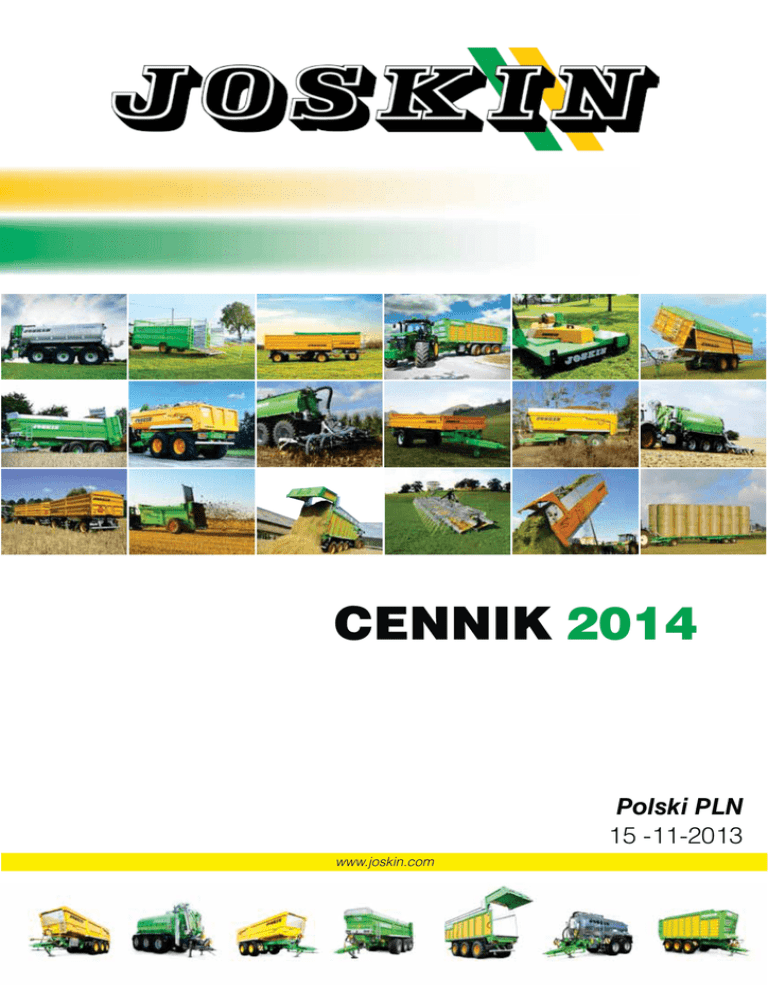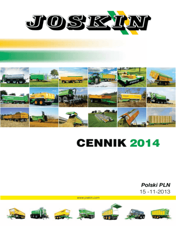 CENNIK 2014 Polski PLN 15 -11-2013 www.joskin.com 15-11-2013 Spis treĞci i Dealers Training Zbiorniki na wodĊ .......................................................................................... 6 - 7 Mieszadła do zbiorników stałych ..................................................................... 8 Wozy asenizacyjne: gama .......................................................................... 9 - 21 Wozy asenizacyjne: opcje ........................................................................ 23 - 41 Osie wzmocnione ................................................................................ 23 Koła ............................................................................................. 24 - 27 Akcesoria do zaczepu ......................................................................... 28 OĞwietlenie .......................................................................................... 28 Osie skrĊtne ........................................................................................ 28 Układ hamulcowy ................................................................................ 28 Wałki .................................................................................................... 29 Pompy próĪniowe i akcesoria .............................................................. 29 Garda .................................................................................................. 30 Pompy odĞrodkowe ............................................................................. 31 Pompy Ğlimakowe i krzywkowe ........................................................... 32 Pompy przepływowe: Ğlimakowa lub krzywkowa ................................. 33 Zdalne pompowanie + centrala smarowania + centrala hydrauliczna ... 34 DostĊp do zbiornika od góry ............................................................... 35 Rozdrabniacz Simple-Cut .................................................................... 35 WskaĨniki poziomu .............................................................................. 35 Króüce przy zbiorniku .......................................................................... 35 Zawory zasysające .............................................................................. 35 Zawory hydrauliczne ........................................................................... 35 RamiĊ pompujące przegubowe, hydrauliczne ..................................... 36 RamiĊ pompujące Jumbo .................................................................... 36 Napełnianie od góry ............................................................................ 36 WysiĊgniki ........................................................................................... 37 WĊĪe i wyposaĪenie ........................................................................... 38 Akcesoria róĪne .................................................................................. 39 Rozlewacze ......................................................................................... 39 Systemy mieszania ............................................................................. 39 Przygotowania ..................................................................................... 39 Złącza .................................................................................................. 39 Centrale hydrauliczne .......................................................................... 40 Hydraulika ........................................................................................... 40 ISOBUS + centrale hydrauliczne ......................................................... 41 Rampy rozlewające .................................................................... 42 - 46, 52 - 53 Aplikatory ..................................................................................................... 47 - 53 Cargo-TRACK ............................................................................................. 54 - 55 Cargo-LIFT ................................................................................................... 56 - 58 CARGO ......................................................................................................... 59 - 67 Rozrzutniki obornika SIROKO ........................................................................ 68 Rozrzutniki obornika TORNADO3 ................................................................. 69 Rozrzutniki obornika Ferti-CAP ..................................................................... 70 Rozrzutniki obornika Ferti-SPACE ................................................................. 71 Opcje wspólne do rozrzutników obornika .......................................... 72 - 77 Przyczepy do bydła (BETIMAX) .............................................................. 78 - 80 Wywrotki, przyczepy objĊtoĞciowe i platformy ................................. 81 - 103 Wywrotki do robót budowlanych Trans-KTP 9, 11 i 15 T ...................... 81 Wywrotki do robót budowlanych Trans-KTP HARDOX ................ 82 - 83 Przyczepy platformowe WAGO-LOADER ............................................ 85 Przyczepy platformowe WAGO (półzawieszane) ................................. 86 Przyczepy platformowe WAGO (ciągniĊte) .......................................... 87 Przyczepy platformowe: opcje wspólne ............................................... 88 Przyczepy platformowe: koła ............................................................... 89 Wywrotki ze składanymi burtami Trans-EX 3 - 7 T ............................. 90 Wywrotki z trójstronnym wywrotem Delta-CAP ................................... 91 Wywrotki Tetra-CAP ............................................................................. 92 Wywrotki Tetra-SPACE ........................................................................ 93 Opcje wspólne - Tetra-CAP i Delta-CAP ...........................
