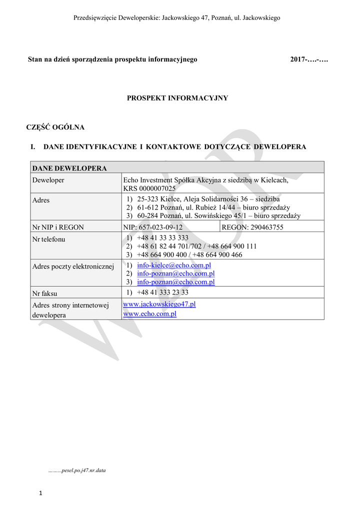 Przedsięwzięcie Deweloperskie: Jackowskiego 47, Poznań, ul. Jackowskiego Stan na dzień sporządzenia prospektu informacyjnego 2017-….-…. PROSPEKT INFORMACYJNY CZĘŚĆ OGÓLNA I. DANE IDENTYFIKACYJNE I KONTAKTOWE DOTYCZĄCE DEWELOPERA DANE DEWELOPERA Deweloper Adres Nr NIP i REGON Echo Investment Spółka Akcyjna z siedzibą w Kielcach, KRS 0000007025 1) 25-323 Kielce, Aleja Solidarności 36 – siedziba 2) 61-612 Poznań, ul. Rubież 14/44 – biuro sprzedaży 3) 60-284 Poznań, ul. Sowińskiego 45/1 – biuro sprzedaży Nr faksu NIP: 657-023-09-12 REGON: 290463755 1) +48 41 33 33 333 2) +48 61 82 44 701/702 / +48 664 900 111 3) +48 664 900 400 / +48 664 900 466 1) [email protected] 2) [email protected] 3) [email protected] 1) +48 41 333 23 33 Adres strony internetowej dewelopera www.jackowskiego47.pl www.echo.com.pl Nr telefonu Adres poczty elektronicznej ……...pesel.po.j47.nr.data 1 Przedsięwzięcie Deweloperskie: Jackowskiego 47, Poznań, ul. Jackowskiego II. DOŚWIADCZENIE DEWELOPERA HISTORIA I UDOKUMENTOWANE DOŚWIADCZENIE DEWELOPERA PRZYKŁAD UKOŃCZONEGO PRZEDSIĘWZIĘCIA DEWELOPERSKIEGO (należy wskazać (o ile istnieją) trzy ukończone przedsięwzięcia deweloperskie, w tym ostatnie) Adres Kasztanowa Aleja – etap II 60-792 Poznań, ul. Wojskowa 7 Data rozpoczęcia 2012-12-05 Data wydania ostatecznego 2014-05-20 pozwolenia na użytkowanie PRZYKŁAD INNEGO UKOŃCZONEGO PRZEDSIĘWZIĘCIA DEWELOPERSKIEGO Park Sowińskiego – etap I Adres Poznań, ul. Sowińskiego 43, 45, 45A, 47A, 49, 51, 51A Data rozpoczęcia 2014-06-09 Data wydania ostatecznego 2016-05-10 pozwolenia na użytkowanie OSTATNIE UKOŃCZONE PRZEDSIĘWZIĘCIE DEWELOPERSKIE Adres Data rozpoczęcia Park Avenue Apartments 30-322 Kraków, ul. Czarodziejska 2-2F; 4 2014-10-09 Data wydania ostatecznego 2016-05-18 pozwolenia na użytkowanie Czy przeciwko deweloperowi prowadzono (lub prowadzi się) postępowania egzekucyjne na kwotę powyżej 100 000 zł ……...pesel.po.j47.nr.data 2 Nie Przedsięwzięcie Deweloperskie: Jackowskiego 47, Poznań, ul. Jackowskiego III. INFORMACJE DOTYCZĄCE NIERUCHOMOŚCI I PRZEDSIĘWZIĘCIA DEWELOPERSKIEGO INFORMACJE DOTYCZĄCE GRUNTU Adres i nr działki ewiden- Województwo: wielkopolskie cyjnej Powiat: Miasto Poznań Obręb: Nr 0021, Jeżyce Arkusz mapy: 16 Numer działki: 112 Powierzchnia działki: 6.678 m2 Położenie: ul. Jackowskiego Nr księgi wieczystej PO1P/00101990/8 Istniejące obciążenia hipo- Brak obciążeń i wniosków teczne nieruchomości lub wnioski o wpis w dziale czwartym księgi wieczystej W przypadku braku księgi Nie dotyczy wieczystej informacja o powierzchni działki i stanie prawnym nieruchomości Brak planu Plan zagospodarowania przestrzennego dla sąsiadujących działek Informacje zawarte w pub- Zestawienie poniżej: licznie dostępnych dokumentach dotyczących przewidzianych inwestycji w promieniu 1 km od przedmiotowej nieruchomości, w szczególności o budowie lub rozbudowie dróg, budowie linii szynowych oraz przewidzianych korytarzach powietrznych, a także znanych innych inwestycjach komunalnych, w szczególności oczyszczalniach ścieków, spalarniach śmieci, wysypiskach, cmentarzach ……...pesel.po.j47.nr.data 3 Przedsięwzięcie Deweloperskie: Jackowskiego 47, Poznań, ul. Jackowskiego Decyzje o pozwoleniu na budowę, o warunkach zabudowy oraz lokalizacje celu publicznego: nr decyzji 855/20 15 data przedmiot podania/decyzji 05-052015 21/17/6/6 , 21/17/7/14 ul.Szpitalna nr 27/33 pozwolenie na budowę teren zabudowy usługowej - inna ustalenie lokalizacji inwestycji celu publicznego pozytywna pozwolenie na budowę teren dróg publicznych ustalenie lokalizacji inwestycji celu publicznego pozytywna 847/20 15 04-052015 zmiana decyzji nr 791/2013 pozwolenia na budowę dla przebudowy pomieszczeń budynku głównego na bloki operacyjne i Oddziały Pooperacyjne Szpitala Klinicznego im.K.Jonschera UA-VI-A04.6740.302.2013z dnia 24.04.2013 r. pozwolenie na budowę - modernizacja budynku ptaszarni na terenie Starego ZOO 21/13/86/6 ul.Zwierzyniecka nr 19 97/201 5 04-052015 ustalenie lokalizacji inwestycji o celu publicznego dla sieci gazowej 21/18/11/2 , 21/18/85 , 21/18/9/21 , 21/18/9/70 , 21/18/9/75 , 21/18/9/77 ul.Szamotulska nr brak, ul.Józefa Paszty nr brak 762/20 15 23-042015 21/10/154/82 , 21/10/165 ul.Kościelna nr 17-19 89/201 5 17-042015 39/08/34/9 ul.Grunwaldzka nr 6 ustalenie lokalizacji inwestycji celu publicznego pozytywna ustalenie lokalizacji inwestycji celu publicznego pozytywna 81/201 5 08-042015 pozwolenie na budowę sieci elektroenergetycznej nn-0,4kV - pozostałe załączniki przy spr.UA-VI-A04.6740.3170.2014 ustalenie lokalizacji inwestycji celu publicznego dla przebudowy, termomodernizacji i modernizacji energetycznej budynku Collegium Chemicum UAM wraz ze zmianą sposobu użytkowania wybranych pomieszczeń na potrzeby przychodni lekarskiej, zewn. dozimnymi ins ustalenie lokalizacji inwestycji celu publicznego dla budowy sieci elektroenergetycznej oświetlenia drogowego przy ul.Zwierzynieckiej 21/13/66/4 , 21/13/66/5 , 21/13/67 , 21/13/75/32 ul.Zwierzyniecka nr brak 79/201 5 01-042015 ustalenie lokalizacji inwestycji celu publicznego dla budowy sieci elektroenergetycznej SN-15kV, stacja transformatorowa SN/nn ul.Michała Kajki nr brak, ul.Zofii Nałkowskiej nr brak pozwolenie na budowę teren dróg publicznych 533/20 15 25-032015 pozwolenie na budowę elektroenergetycznej sieci kablowej SN-15kV 21/07/109/1 , 21/07/110 , 21/07/111/2 , 21/07/112 , 21/07/113/2 , 21/07/55/3 , 21/07/56/7 , 21/07/66/2 , 21/07/68/2 , 21/07/91/4 21/17/13/1 , 21/17/74/1 , 21/18/83/1 , 21/18/83/9 ustalenie lokalizacji inwestycji celu publicznego pozytywna ustalenie lokalizacji inwestycji celu publicznego pozytywna pozwolenie na budowę teren dróg publicznych pozwolenie na budowę teren zabudowy usługowej - inna 59/201 5 18-032015 ustalenie lokalizacji inwestycji celu publicznego dla budowy sieci elektroenergetycznej oświetlenia drogowego przy ul.Dą