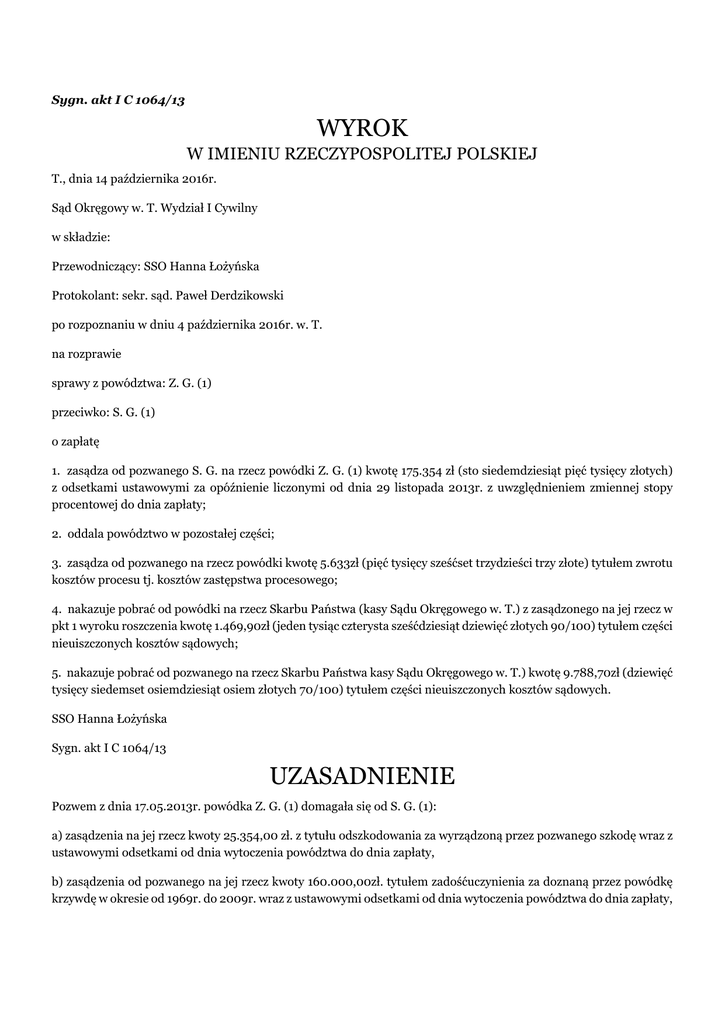 Sygn. akt I C 1064/13 WYROK W IMIENIU RZECZYPOSPOLITEJ POLSKIEJ T., dnia 14 października 2016r. Sąd Okręgowy w. T. Wydział I Cywilny w składzie: Przewodniczący: SSO Hanna Łożyńska Protokolant: sekr. sąd. Paweł Derdzikowski po rozpoznaniu w dniu 4 października 2016r. w. T. na rozprawie sprawy z powództwa: Z. G. (1) przeciwko: S. G. (1) o zapłatę 1. zasądza od pozwanego S. G. na rzecz powódki Z. G. (1) kwotę 175.354 zł (sto siedemdziesiąt pięć tysięcy złotych) z odsetkami ustawowymi za opóźnienie liczonymi od dnia 29 listopada 2013r. z uwzględnieniem zmiennej stopy procentowej do dnia zapłaty; 2. oddala powództwo w pozostałej części; 3. zasądza od pozwanego na rzecz powódki kwotę 5.633zł (pięć tysięcy sześćset trzydzieści trzy złote) tytułem zwrotu kosztów procesu tj. kosztów zastępstwa procesowego; 4. nakazuje pobrać od powódki na rzecz Skarbu Państwa (kasy Sądu Okręgowego w. T.) z zasądzonego na jej rzecz w pkt 1 wyroku roszczenia kwotę 1.469,90zł (jeden tysiąc czterysta sześćdziesiąt dziewięć złotych 90/100) tytułem części nieuiszczonych kosztów sądowych; 5. nakazuje pobrać od pozwanego na rzecz Skarbu Państwa kasy Sądu Okręgowego w. T.) kwotę 9.788,70zł (dziewięć tysięcy siedemset osiemdziesiąt osiem złotych 70/100) tytułem części nieuiszczonych kosztów sądowych. SSO Hanna Łożyńska Sygn. akt I C 1064/13 UZASADNIENIE Pozwem z dnia 17.05.2013r. powódka Z. G. (1) domagała się od S. G. (1): a) zasądzenia na jej rzecz kwoty 25.354,00 zł. z tytułu odszkodowania za wyrządzoną przez pozwanego szkodę wraz z ustawowymi odsetkami od dnia wytoczenia powództwa do dnia zapłaty, b) zasądzenia od pozwanego na jej rzecz kwoty 160.000,00zł. tytułem zadośćuczynienia za doznaną przez powódkę krzywdę w okresie od 1969r. do 2009r. wraz z ustawowymi odsetkami od dnia wytoczenia powództwa do dnia zapłaty, a także zasądzenia od pozwanego na rzecz powódki kosztów procesu, w tym kosztów zastępstwa procesowego W uzasadnieniu podała m.in. iż w trakcie trwania związku małżeńskiego pozwany (były mąż) dopuścił się wobec powódki szeregu zachowań noszących znamiona przestępstwa znęcania się fizycznego i psychicznego. Za dopuszczenie się tych zachowań w okresie od 1969r. do 1.10.2009r. pozwany został skazany prawomocnym wyrokiem Sądu Rejonowego w. T. w sprawie o sygn. akt VIII K 625/10. Wyrok ten został utrzymany w mocy wyrokiem Sądu Okręgowego w. T. z dnia 10.02.2011r. sygn. akt IX Ka 12/11. Wskazane tam zachowania pozwanego spowodowały cierpienia u powódki zarówno natury fizycznej jak i psychicznej. Powódka doznawała bólu fizycznego, co wynika z istoty nagannych zachowań pozwanego skierowanych przeciwko zdrowiu powódki. Ponadto powódka przez cały okres małżeństwa żyła w strachu przed zachowaniami pozwanego. Powódka była w długotrwałym stresie, co powodowało bóle somatyczne np. głowy, trzustki. Bardzo przeżywała panującą sytuację w domu, zwłaszcza agresywne zachowania męża, co ujawniało się częstym płaczem, tłumieniem emocji i poczuciem bezsilności. Często dopiero po jakimś czasie i w odosobnieniu odreagowywała zachowania męża. Objawiało się to poczuciem smutku, zniechęcenia i przygnębienia. Pozwany często wracał do domu pod wpływem alkoholu, zapraszał też do domu stron kolegów i razem spożywali alkohol, a powódka miała im usługiwać. Nie skarżyła się nikomu i tłumiła emocje w sobie, bo wiedziała, że mieszka w małej miejscowości, ona i mąż są znanymi osobami, bo ona była nauczycielką, a mąż żołnierzem zawodowym. Wstydziła się tego, że mąż znęca się nad nią. W dniu 1.10.2009r. powódka w obawie o swoje życie była zmuszona uciec z domu i szukać schronienia u swoich sióstr. Taka radykalna reakcja była rezultatem agresywnego zachowania pozwanego oraz kierowanych przez niego gróźb pozbawienia życia powódki. W dniu 12.10.2009r. powódka zgłosiła się z prośbą o udzielenie pomocy do (...) Centrum Pomocy (...) w T. gdzie została objęta opieką psychologiczną. Natomiast od 16.11.2009r. powódka pozostaje pod stałą opieką lekarza psychiatry w (...) Przychodni (...) w T.. Z. G. (1) obecnie korzysta z pomocy w Miejskim Ośrodku (...) w T.. Powódka była zmuszona opuścić wspólny dom stron w 2009r. albowiem obawiała się o swoje życie i zdrowie. W pierwszych dniach po ucieczce z domu udała się do siostry A. S., a potem do drugiej siostry K. C.. Następnie powódka była zmuszona zamieszkać w hostelu Stowarzyszenia (...) Na Rzecz Pomocy (...). Bardzo źle się tam jednak czuła. Zdaniem powódki pozwany swoim nagannym zachowaniem opisanym w sentencji wyroku sądu karnego naruszył szereg dóbr osobistych powódki m.in. zdrowie, godność, prawo do poczucia bezpieczeństwa w rodzinie, prawo do prywatności. W przedmiotowej sprawie mamy do czynienia z krzywdą powódki, a więc szkodą niemajątkową wywołaną naruszeniem dobra osobistego, polegającą na fizycznych dolegliwościach i psychicznych cierpieniach. Z tego powodu Z. G. (1) w pozwie domagała się zasądzenia od pozwanego kwoty 160.000,00zł. tytułem zadośćuczynienia. Kwotę tą uzasadniła wieloletnim okresem znęcania się nad nią przez pozwanego, a więc okresem, w którym doznała ona znaczącej krzywdy. Na wysokość żądanego zadośćuczynienia miał wpływ rozmiar cierpień jakich doznała, głównie natury psychicznej, ale także fizycznej, charakter naruszonych dóbr osobistych powódki, między innymi zdrowia, godności i prywatności. Jej zdaniem oceniając krzywdę należy wziąć pod uwagę dotychczasową krzywdę doznaną przez nią (intensywność bólu fizycznego i cierpień psychicznych), a także konsekwencje czynu niedozwolonego w życiu osobistym i społecznym. Powódka jako nauczycielka żyła wiele lat z poczuciem wstydu, albowiem jako osoba mająca za zadanie kreować pozytywne wzorce społeczne, nie mo