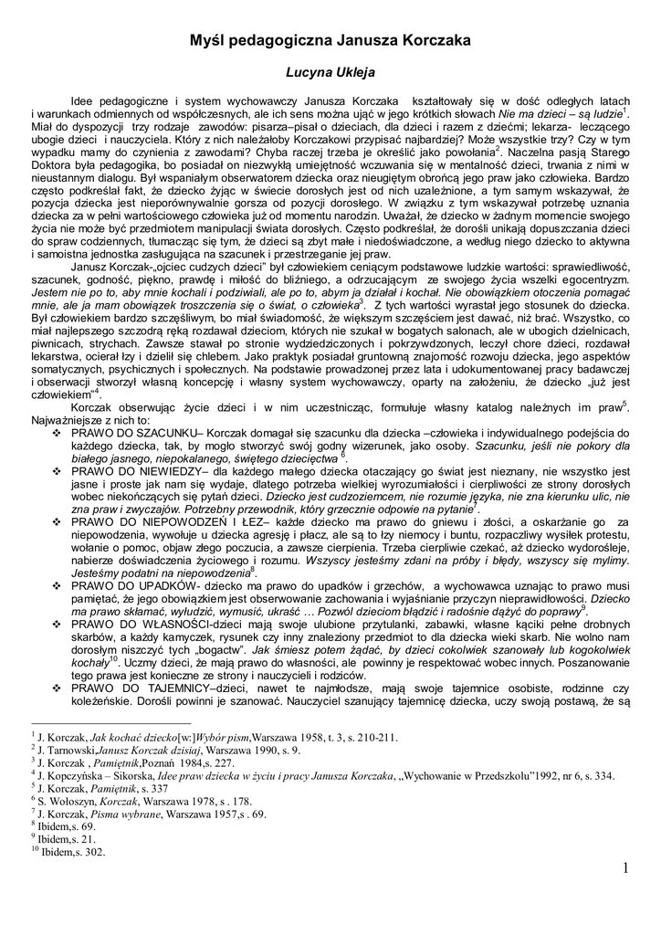 Myśl pedagogiczna Janusza Korczaka Lucyna Ukleja Idee pedagogiczne i system wychowawczy Janusza Korczaka kształtowały się w dość odległych latach i warunkach odmiennych od współczesnych, ale ich sens można ująć w jego krótkich słowach Nie ma dzieci – są ludzie1. Miał do dyspozycji trzy rodzaje zawodów: pisarza–pisał o dzieciach, dla dzieci i razem z dziećmi; lekarza- leczącego ubogie dzieci i nauczyciela. Który z nich należałoby Korczakowi przypisać najbardziej? Może wszystkie trzy? Czy w tym wypadku mamy do czynienia z zawodami? Chyba raczej trzeba je określić jako powołania2. Naczelna pasją Starego Doktora była pedagogika, bo posiadał on niezwykłą umiejętność wczuwania się w mentalność dzieci, trwania z nimi w nieustannym dialogu. Był wspaniałym obserwatorem dziecka oraz nieugiętym obrońcą jego praw jako człowieka. Bardzo często podkreślał fakt, że dziecko żyjąc w świecie dorosłych jest od nich uzależnione, a tym samym wskazywał, że pozycja dziecka jest nieporównywalnie gorsza od pozycji dorosłego. W związku z tym wskazywał potrzebę uznania dziecka za w pełni wartościowego człowieka już od momentu narodzin. Uważał, że dziecko w żadnym momencie swojego życia nie może być przedmiotem manipulacji świata dorosłych. Często podkreślał, że dorośli unikają dopuszczania dzieci do spraw codziennych, tłumacząc się tym, że dzieci są zbyt małe i niedoświadczone, a według niego dziecko to aktywna i samoistna jednostka zasługująca na szacunek i przestrzeganie jej praw. Janusz Korczak-„ojciec cudzych dzieci” był człowiekiem ceniącym podstawowe ludzkie wartości: sprawiedliwość, szacunek, godność, piękno, prawdę i miłość do bliźniego, a odrzucającym ze swojego życia wszelki egocentryzm. Jestem nie po to, aby mnie kochali i podziwiali, ale po to, abym ja działał i kochał. Nie obowiązkiem otoczenia pomagać mnie, ale ja mam obowiązek troszczenia się o świat, o człowieka3. Z tych wartości wyrastał jego stosunek do dziecka. Był człowiekiem bardzo szczęśliwym, bo miał świadomość, że większym szczęściem jest dawać, niż brać. Wszystko, co miał najlepszego szczodrą ręką rozdawał dzieciom, których nie szukał w bogatych salonach, ale w ubogich dzielnicach, piwnicach, strychach. Zawsze stawał po stronie wydziedziczonych i pokrzywdzonych, leczył chore dzieci, rozdawał lekarstwa, ocierał łzy i dzielił się chlebem. Jako praktyk posiadał gruntowną znajomość rozwoju dziecka, jego aspektów somatycznych, psychicznych i społecznych. Na podstawie prowadzonej przez lata i udokumentowanej pracy badawczej i obserwacji stworzył własną koncepcję i własny system wychowawczy, oparty na założeniu, że dziecko „już jest człowiekiem” 4. Korczak obserwując życie dzieci i w nim uczestnicząc, formułuje własny katalog należnych im praw5. Najważniejsze z nich to: PRAWO DO SZACUNKU– Korczak domagał się szacunku dla dziecka –człowieka i indywidualnego podejścia do każdego dziecka, tak, by mogło stworzyć swój godny wizerunek, jako osoby. Szacunku, jeśli nie pokory dla białego jasnego, niepokalanego, świętego dziecięctwa 6. PRAWO DO NIEWIEDZY– dla każdego małego dziecka otaczający go świat jest nieznany, nie wszystko jest jasne i proste jak nam się wydaje, dlatego potrzeba wielkiej wyrozumiałości i cierpliwości ze strony dorosłych wobec niekończących się pytań dzieci. Dziecko jest cudzoziemcem, nie rozumie języka, nie zna kierunku ulic, nie zna praw i zwyczajów. Potrzebny przewodnik, który grzecznie odpowie na pytanie7. PRAWO DO NIEPOWODZEŃ I ŁEZ– każde dziecko ma prawo do gniewu i złości, a oskarżanie go za niepowodzenia, wywołuje u dziecka agresję i płacz, ale są to łzy niemocy i buntu, rozpaczliwy wysiłek protestu, wołanie o pomoc, objaw złego poczucia, a zawsze cierpienia. Trzeba cierpliwie czekać, aż dziecko wydorośleje, nabierze doświadczenia życiowego i rozumu. Wszyscy jesteśmy zdani na próby i błędy, wszyscy się mylimy. Jesteśmy podatni na niepowodzenia8. PRAWO DO UPADKÓW- dziecko ma prawo do upadków i grzechów, a wychowawca uznając to prawo musi pamiętać, że jego obowiązkiem jest obserwowanie zachowania i wyjaśnianie przyczyn nieprawidłowości. Dziecko ma prawo skłamać, wyłudzić, wymusić, ukraść … Pozwól dzieciom błądzić i radośnie dążyć do poprawy9. PRAWO DO WŁASNOŚCI-dzieci mają swoje ulubione przytulanki, zabawki, własne kąciki pełne drobnych skarbów, a każdy kamyczek, rysunek czy inny znaleziony przedmiot to dla dziecka wieki skarb. Nie wolno nam dorosłym niszczyć tych „bogactw”. Jak śmiesz potem żądać, by dzieci cokolwiek szanowały lub kogokolwiek kochały10. Uczmy dzieci, że mają prawo do własności, ale powinny je respektować wobec innych. Poszanowanie tego prawa jest konieczne ze strony i nauczycieli i rodziców. PRAWO DO TAJEMNICY–dzieci, nawet te najmłodsze, mają swoje tajemnice osobiste, rodzinne czy koleżeńskie. Dorośli powinni je szanować. Nauczyciel szanujący tajemnicę dziecka, uczy swoją postawą, że są 1 J. Korczak, Jak kochać dziecko[w:]Wybór pism,Warszawa 1958, t. 3, s. 210-211. J. Tarnowski,Janusz Korczak dzisiaj, Warszawa 1990, s. 9. 3 J. Korczak , Pamiętnik,Poznań 1984,s. 227. 4 J. Kopczyńska – Sikorska, Idee praw dziecka w życiu i pracy Janusza Korczaka, „Wychowanie w Przedszkolu”1992, nr 6, s. 334. 5 J. Korczak, Pamiętnik, s. 337 6 S. Wołoszyn, Korczak, Warszawa 1978, s . 178. 7 J. Korczak, Pisma wybrane, Warszawa 1957,s . 69. 8 Ibidem,s. 69. 9 Ibidem,s. 21. 10 Ibidem,s. 302. 2 1 sprawy, o których nie mówi się wszystkim. Należy przekonać dzieci, że mamy szacunek dla ich tajemnicy, że zapytania: Czy możesz mi powiedzieć? Nie oznacza „musisz”11. PRAWO DO RADOŚCI-radość to nieodłączny przyjaciel dzieci, a szczęście ma swoje źródło w naszym wnętrzu. W miłej i radosnej atmosferz