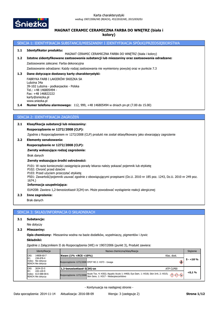 Karta charakterystyki według 1907/2006/WE (REACH), 453/2010/WE, 2015/830/EU MAGNAT CERAMIC CERAMICZNA FARBA DO WNĘTRZ (biała i kolory) SEKCJA 1: IDENTYFIKACJA SUBSTANCJI/MIESZANINY I IDENTYFIKACJA SPÓŁKI/PRZEDSIĘBIORSTWA 1.1 Identyfikator produktu: 1.2 MAGNAT CERAMIC CERAMICZNA FARBA DO WNĘTRZ (biała i kolory) Istotne zidentyfikowane zastosowania substancji lub mieszaniny oraz zastosowania odradzane: Zastosowanie zalecane: Farba dekoracyjna Zastosowanie odradzane: Każdy rodzaj zastosowania nie wymieniony powyżej oraz w punkcie 7.3 1.3 Dane dotyczące dostawcy karty charakterystyki: 1.4 FABRYKA FARB I LAKIERÓW SNIEZKA SA Lubzina 34a 39-102 Lubzina - podkarpackie - Polska Tel.: +48 146805494 Fax: +48 146822222 [email protected] www.sniezka.pl Numer telefonu alarmowego: 112, 999, +48 146805494 w dniach pn-pt (7.00 do 15.00) SEKCJA 2: IDENTYFIKACJA ZAGROŻEŃ 2.1 Klasyfikacja substancji lub mieszaniny: Rozporządzenie nr 1272/2008 (CLP): Zgodnie z Rozporządzeniem nr 1272/2008 (CLP) produkt nie został sklasyfikowany jako stwarzający zagrożenie 2.2 Elementy oznakowania: Rozporządzenie nr 1272/2008 (CLP): Zwroty wskazujące rodzaj zagrożenia: Brak danych Zwroty wskazujące środki ostrożności: P101: W razie konieczności zasięgnięcia porady lekarza należy pokazać pojemnik lub etykietę P102: Chronić przed dziećmi P103: Przed użyciem przeczytać etykietę P501: Zawartość/pojemnik usuwać zgodnie z obowiązującymi przepisami (Dz.U. 2010 nr 185 poz. 1243, Dz.U. 2010 nr 249 poz. 1674.) Informacja uzupełniająca: EUH208: Zawiera 1,2-benzoizotiazol-3(2H)-on. Może powodować wystąpienie reakcji alergicznej 2.3 Inne zagrożenia: Brak danych SEKCJA 3: SKŁAD/INFORMACJA O SKŁADNIKACH 3.1 Substancje: Nie dotyczy 3.2 Mieszaniny: Opis chemiczny: Mieszanina wodna na bazie dodatków, wypełniaczy, pigmentów i żywic Składniki: Zgodnie z Załącznikiem II do Rozporządzenia (WE) nr 1907/2006 (punkt 3), Produkt zawiera: Identyfikacja CAS: 14808-60-7 EC: 238-878-4 Index: Nie dotyczy REACH: Nie dotyczy CAS: 2634-33-5 EC: 220-120-9 Index: 613-088-00-6 REACH: Nie dotyczy Nazwa chemiczna/klasyfikacja Kwarc (1% <RCS <10%) Stężenie Klas. dost. 5 - <10 % Rozporządzenie 1272/2008 STOT RE 2: H373 - Uwaga 1,2-benzoizotiazol-3(2H)-on Rozporządzenie 1272/2008 ATP CLP00 Acute Tox. 4: H302; Aquatic Acute 1: H400; Eye Dam. 1: H318; Skin Irrit. 2: H315; Skin Sens. 1: H317 - Niebezpieczeństwo <0,1 % - Kontynuacja na następnej stronie Data sporządzenia: 2014-11-14 Aktualizacja: 2016-08-09 Wersja: 3 (zastępuje 2) Strona 1/12 Karta charakterystyki według 1907/2006/WE (REACH), 453/2010/WE, 2015/830/EU MAGNAT CERAMIC CERAMICZNA FARBA DO WNĘTRZ (biała i kolory) SEKCJA 3: SKŁAD/INFORMACJA O SKŁADNIKACH (Ciąg dalszy) Więcej informacji nt. zagrożeń stwarzanych przez substancje – patrz sekcja 8, 11, 12, 15 i 16 SEKCJA 4: ŚRODKI PIERWSZEJ POMOCY 4.1 Opis środków pierwszej pomocy: Objawy w wyniku zatrucia mogą wystąpić dopiero po narażeniu, w związku z czym w razie wątpliwości, bezpośredniego narażenia na produkt chemiczny lub przeciągającego się złego samopoczucia należy skonsultować się z lekarzem i pokazać mu Kartę Charakterystyki produktu. Przez wdychanie: Produkt nie został sklasyfikowany jako niebezpieczny w przypadku jego wdychania, ale pomimo to w razie stwierdzenia objawów zatrucia zaleca się usunąć poszkodowanego z miejsca narażenia oraz zapewnić mu dostęp świeżego powietrza i spokój. Jeżeli objawy nie ustąpią, należy wezwać pomoc lekarską. Przez kontakt ze skórą: Produkt nie został sklasyfikowany jako niebezpieczny w kontakcie ze skórą. Pomimo to, w razie kontaktu ze skórą zaleca się zdjąć zanieczyszczoną odzież i buty, oczyścić skórę i umyć poszkodowanego pod prysznicem mydłem neutralnym a następnie obficie spłukać wodą. W razie wyraźnych dolegliwości skonsultować się z lekarzem. Przez kontakt z oczami: Obficie płukać oczy wodą o temperaturze pokojowej przez 15 minut. Jeżeli poszkodowany nosi soczewki kontaktowe, należy je usunąć o ile nie są przyklejone do oka, w przeciwnym razie można spowodować dalsze obrażenia. We wszystkich przypadkach, po umyciu poszkodowanego, należy jak najszybciej skonsultować się z lekarzem i pokazać mu Kartę Charakterystyki produktu. Przez połknięcie / aspirację: 4.2 Nie wywoływać wymiotów a w razie gdyby wystąpiły należy trzymać głowę przechyloną do przodu aby zapobiec aspiracji zawartości żołądka. Zapewnić poszkodowanemu spokój. Przepłukać usta i gardło, ponieważ najprawdopodobniej zostały zanieczyszczone przy połknięciu. Najważniejsze ostre i opóźnione objawy oraz skutki narażenia: Ostre i opóźnione skutki narażenia podano w sekcji 2 i 11 4.3 Wskazania dotyczące wszelkiej natychmiastowej pomocy lekarskiej i szczególnego postępowania z poszkodowanym: Brak danych SEKCJA 5: POSTĘPOWANIE W PRZYPADKU POŻARU 5.1 Środki gaśnicze: 5.2 Produkt niepalny w normalnych warunkach postępowania, magazynowania i użytkowania. W razie zapalenia na skutek niewłaściwego postępowania, magazynowania lub użytkowania należy raczej stosować gaśnice proszkowe (proszek ABC), zgodnie z Rozporządzeniem w sprawie urządzeń ochrony przeciwpożarowej. NIE ZALECA SIĘ używać wody bieżącej jako środka gaśniczego. Szczególne zagrożenia związane z substancją lub mieszaniną: 5.3 W wyniku spalania lub rozkładu termicznego powstają subprodukty reakcji, które mogą być wysoko toksyczne i w konsekwencji mogą stanowić poważne zagrożenie dla zdrowia. Informacje dla straży pożarnej: W zależności od rozmiarów pożaru może się okazać konieczne zastosowanie kompletnej odzieży ochronnej i autonomicznego sprzętu do oddychania. Należy mieć do dyspozycji minimalny zasób urządzeń awaryjnych i środków działania (koce przeciwpożarowe, podręczna apteczka) zgodnie z Dyrektywą 89/654/EC. Dodatkowe postanowienia: Działać zgodnie z We