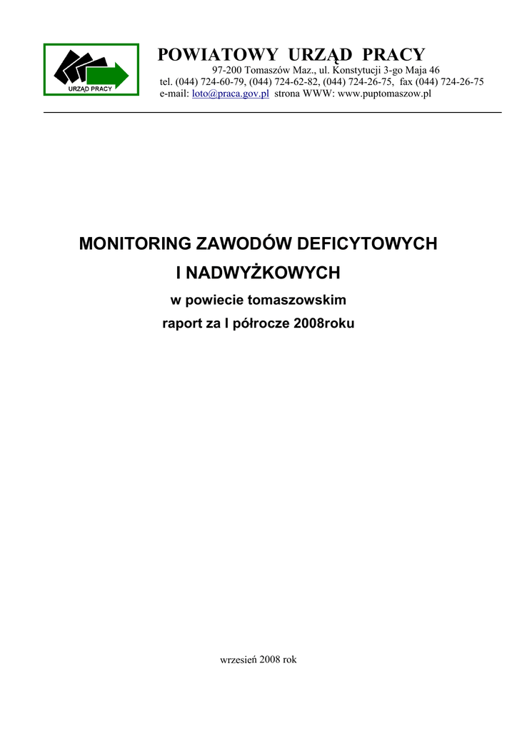 POWIATOWY URZĄD PRACY 97-200 Tomaszów Maz., ul. Konstytucji 3-go Maja 46 tel. (044) 724-60-79, (044) 724-62-82, (044) 724-26-75, fax (044) 724-26-75 e-mail: [email protected] strona WWW: www.puptomaszow.pl MONITORING ZAWODÓW DEFICYTOWYCH I NADWYśKOWYCH w powiecie tomaszowskim raport za I półrocze 2008roku wrzesień 2008 rok I. WSTĘP Monitoring zawodów jest procesem systematycznego obserwowania zjawisk zachodzących na rynku pracy. PrzeobraŜenia społeczno-gospodarcze powodują, Ŝe popyt i podaŜ na określone zawody ulegają zmianie, w związku z tym niezbędna jest szybka ewaluacja kwalifikacji zawodowych, a gdy zachodzi konieczność nawet zupełna zmiana zawodu. W ramach monitoringu określa się rankingi zawodów deficytowych i nadwyŜkowych, co jest istotne dla lokalnej edukacji jak i potrzeb szkoleniowych bezrobotnych. Zawody o najniŜszych i najwyŜszych wskaźnikach intensywności deficytu / nadwyŜki uwzględniane są w systemie działań dopasowujących popyt na pracę do podaŜy pracy. Metodologia zawarta w zaleceniach metodycznych do prowadzenia monitoringu zawodów deficytowych i nadwyŜkowych (wydanych przez Departament Rynku Pracy Ministerstwa Gospodarki,Pracy i Polityki Społecznej - Warszawa 2003) jednocześnie określa pojęcie zawodu deficytowego, nadwyŜkowego, czy zrównowaŜonego poprzez wielkość wskaźnika intensywności nadwyŜki / deficytu. Do zawodów deficytowych zaliczyć naleŜy wszystkie zawody, dla których wskaźnik W nk (stosunek średniej miesięcznej liczby zgłoszonych ofert pracy w danym zawodzie do średniej miesięcznej liczby zarejestrowanych bezrobotnych w danym zawodzie) jest większy od 1,1. Zawody zrównowaŜone wykazujące równowagę na rynku pracy określa wskaźnik 0,9 « Wkn«1,1. Zawody nadwyŜkowe posiadają wskaźnik intensywności nadwyŜki W kn <0,9 . Statystyka z zakresu stosowania zawodów i specjalności zarejestrowanych bezrobotnych sporządzana jest na podstawie Rozporządzenia Ministra Gospodarki Pracy z dnia 8 grudnia 2004 r. w sprawie klasyfikacji zawodów i specjalności dla potrzeb rynku pracy oraz zakresu jej stosowania (Dz. U. Nr 265, poz. 2644). Klasyfikacja zawodowa jest pięciopoziomowym, hierarchicznie usystematyzowanym zbiorem zawodów i specjalności występujących na rynku pracy. Grupuje poszczególne zawody w coraz bardziej zagregowane grupy oraz ustala ich symbole i nazwy. Struktura klasyfikacji oparta jest na systemie pojęć, z których najwaŜniejsze to: zawód, specjalność, umiejętność oraz kwalifikacje zawodowe. Zawód zdefiniowany został jako zbiór zadań (zespół czynności) wyodrębnionych w wyniku społecznego podziału pracy, wykonywanych stale lub z niewielkimi zmianami przez poszczególne osoby i wymagających odpowiednich kwalifikacji (wiedzy i umiejętności), zdobytych w wyniku kształcenia lub praktyki. Zawód moŜe dzielić się na specjalności. Specjalność jest wynikiem podziału pracy w ramach zawodu, zawiera część czynności o podobnym charakterze ( związanych z wykonywaną funkcją lub podmiotem pracy) wymagających pogłębionej lub dodatkowej wiedzy i umiejętności, zdobytych w wyniku dodatkowego szkolenia lub praktyki. Umiejętność określono jako sprawdzoną moŜliwość wykonywania odpowiedniej klasy zadań w ramach zawodu (specjalności), natomiast przez kwalifikacje zawodowe rozumiane są układy wiedzy i umiejętności wymagane do realizacji składowych zadań zawodowych. Struktura klasyfikacji jest wynikiem grupowania zawodów na podstawie podobieństwa kwalifikacji zawodowych wymaganych dla realizacji zadań danego zawodu (specjalności), z uwzględnieniem obydwu aspektów kwalifikacji, tj. ich poziomu i specjalizacji. 2 Wymienione kryteria posłuŜyły grupowaniu poszczególnych zawodów i specjalności w grupy elementarne, a te z kolei w bardziej zagregowane grupy średnie, duŜe i wielkie. W efekcie struktura klasyfikacji obejmuje: 10 grup wielkich, 30 grup duŜych (jako wewnętrzny podział grup wielkich), 116 grup średnich (jako wewnętrzny podział grup duŜych) i 392 grupy elementarne (jako wewnętrzny podział grup średnich), przy czym grupy elementarne obejmują 1770 zawodów i specjalności. II. ANALIZA BEZROBOCIA WG ZAWODÓW STRUKTURA BEZROBOCIA W/G ZAWODÓW W KOŃCU I PÓŁROCZA 2008 ROKU Na dzień30.06.2008 roku w Powiatowym Urzędzie Pracy w Tomaszowie Maz. zarejestrowanych było 6892 bezrobotnych, w tym 3452 kobiety. Stopa bezrobocia w powiecie tomaszowskim na koniec czerwca 2008 roku wynosiła 14,7 %. Na koniec analizowanego okresu w ewidencji Urzędu Pracy odnotowano: - 5924 bezrobotnych poprzednio pracujących - 86,0%, - 14,0 %. - 968 osób dotychczas nie pracujących Wśród ogółu bezrobotnych zarejestrowanych w PUP 39,8 % (2743 osoby) stanowiły osoby pozostające bez pracy powyŜej 12 m-cy. Osoby zarejestrowane w Urzędzie Pracy w okresie do 12 m-cy od dnia ukończenia nauki w liczbie 119 stanowiły 1,7 % ogółu bezrobotnych. Tabela 1. Liczba osób bezrobotnych zarejestrowanych w końcu I półrocza 2008 roku w/g elementarnych zawodów (zawody z największą liczbą bezrobotnych) L.p. Nazwa zawodu Liczba bezrobotnych 1 2 3 4 5 6 7 bez zawodu sprzedawca robotnik pomocniczy w przemyśle przetwórczym szwaczka robotnik budowlany ślusarz murarz 8 9 10 11 12 13 14 asystent ekonomiczny technik mechanik krawiec kucharz robotnik placowy tkacz pracownik biurowy 3 760 409 255 235 233 183 154 145 129 128 117 106 100 100 Najliczniejszą grupę wśród bezrobotnych stanowią osoby bez zawodu – 760 osób tj. 11,0 % ogółu. W grupie tej odnotowano: - 407 kobiet - 53,6 % - 33 osoby zarejestrowane do 12 m-cy od dnia ukończenia nauki - 4,3 % - 60 osób pozostających bez pracy ponad 12 miesięcy - 7,9 % Na koniec czerwca 2008 roku wśród 6132 bezrobotnych posiadających zawód najwięcej zarejestrowanych było: - sprzedawców -5,9% ogółu - robotników pomocniczych w przemyśle przetwórczym - 3,7% “ - szwaczek - 3,4 % “ - robotników