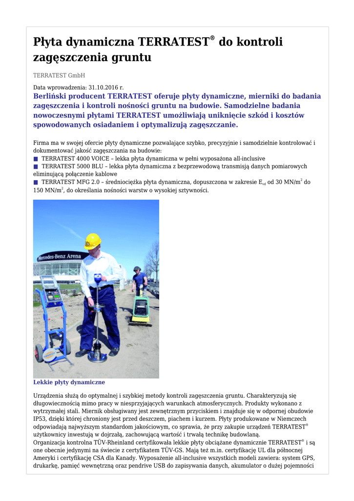 ® Płyta dynamiczna TERRATEST do kontroli zagęszczenia gruntu TERRATEST GmbH Data wprowadzenia: 31.10.2016 r. Berliński producent TERRATEST oferuje płyty dynamiczne, mierniki do badania zagęszczenia i kontroli nośności gruntu na budowie. Samodzielne badania nowoczesnymi płytami TERRATEST umożliwiają uniknięcie szkód i kosztów spowodowanych osiadaniem i optymalizują zagęszczanie. Firma ma w swojej ofercie płyty dynamiczne pozwalające szybko, precyzyjnie i samodzielnie kontrolować i dokumentować jakość zagęszczania na budowie: ■ TERRATEST 4000 VOICE – lekka płyta dynamiczna w pełni wyposażona all-inclusive ■ TERRATEST 5000 BLU – lekka płyta dynamiczna z bezprzewodową transmisją danych pomiarowych eliminującą połączenie kablowe ■ TERRATEST MFG 2.0 – średniociężka płyta dynamiczna, dopuszczona w zakresie Evd od 30 MN/m2 do 150 MN/m2, do określania nośności warstw o wysokiej sztywności. Lekkie płyty dynamiczne Urządzenia służą do optymalnej i szybkiej metody kontroli zagęszczenia gruntu. Charakteryzują się długowiecznością mimo pracy w niesprzyjających warunkach atmosferycznych. Produkty wykonano z wytrzymałej stali. Miernik obsługiwany jest zewnętrznym przyciskiem i znajduje się w odpornej obudowie IP53, dzięki której chroniony jest przed deszczem, piachem i kurzem. Płyty produkowane w Niemczech ® odpowiadają najwyższym standardom jakościowym, co sprawia, że przy zakupie urządzeń TERRATEST użytkownicy inwestują w dojrzałą, zachowującą wartość i trwałą technikę budowlaną. Organizacja kontrolna TÜV-Rheinland certyfikowała lekkie płyty obciążane dynamicznie TERRATEST® i są one obecnie jedynymi na świecie z certyfikatem TÜV-GS. Mają też m.in. certyfikację UL dla północnej Ameryki i certyfikację CSA dla Kanady. Wyposażenie all-inclusive wszystkich modeli zawiera: system GPS, drukarkę, pamięć wewnętrzną oraz pendrive USB do zapisywania danych, akumulator o dużej pojemności (2000 pomiarów lub 600 wydruków), tryb wprowadzania tekstu, a także nawigację głosową, która za pomocą wyraźnie wypowiadanych instrukcji kieruje działaniami operatora i ogłasza wynik pomiaru. TERRATEST 5000 BLU Dotychczas piętą achillesową płyt dynamicznych był kabel pomiarowy łączący płytę z elektroniką. Berlińska firma TERRATEST, eliminując przewód, jako pierwsza na świecie produkuje urządzenia przekazujące dane pomiarowe bezprzewodowo za pomocą Bluetooth. Unikatowe cechy TERRATEST 5000 BLU to między innymi: szybkie i stabilne połączenie Bluetooth, sygnalizujące stan jaskrawe diody LED i bezpłatna aplikacja w systemie Android. Płyta może być wygodnie obsługiwana smartfonem, a dokumentacja cyfrowa w formacie PDF wraz ze zdjęciami terenu, współrzędnymi GPS i innymi danymi może być przekazywana z budowy w czasie rzeczywistym. W aplikacji przewidziano możliwość edycji danych pomiarowych takich jak: położenie obiektu, zleceniodawca, charakterystyka gruntu, nazwa pliku. Istnieje także opcja dodawania komentarzy. Dzięki aplikacji można również nawiązać kontakt telefoniczny lub mailowy z serwisem TERRATEST®. Sławomir Furmańczuk TERRATEST GmbH Adres O firmie Produkty Usługi Artykuły Multimedia Zadaj pytanie Oddziały TERRATEST GmbH Friedrich-Wolf-Strasse 13, 16515 ORANIENBURG OT LEHNITZ (NIEMCY) tel. +48 793 049 094 faks +49 3301 57 87 530 [email protected] www.plyta-dynamiczna.pl ® TERRATEST – berliński producent płyt dynamicznych, mierników do badania zagęszczenia i nośności gruntu TERRATEST 4000 USB all-inclusive, TERRATEST 5000 BLU z Bluetoothem i średniociężkiej płyty TERRATEST MFG 2.0 do badań w zakresie Evd 30-150 MN/m2.