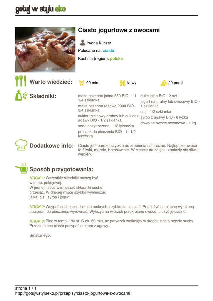 Ciasto jogurtowe z owocami Iwona Kuczer Polecane na: ciasta Kuchnia (region): polska Warto wiedzieć: 90 min. łatwy 20 porcji Składniki: mąka pszenna jasna 550 BIO - 1 i 1/4 szklanka mąka pszenna razowa 2000 BIO 3/4 szklanka cukier trzcinowy drobny lub cukier z agawy BIO - 1/2 szklanka soda oczyszczona - 1/2 łyżeczka proszek do pieczenia BIO - 1 i 1/2 łyżeczka Dodatkowe info: Ciasto jest bardzo szybkie do zrobienia i smaczne. Najlepsze owoce to śliwki, morele, brzoskwinie. W cieście na zdjęciu znalazły się śliwki węgierki. duże jajko BIO - 2 szt. jogurt naturalny lub owocowy BIO 1 szklanka olej - 1/2 szklanka syrop z agawy BIO - 6 łyżka dowolne owoce sezonowe - 1 kg Sposób przygotowania: KROK 1: Wszystkie składniki muszą być w temp. pokojowej. W jednej misce wymieszać składniki suche, przesiać. W drugiej misce szybko wymieszać jajka, olej, syrop i jogurt. KROK 2: Wsypać suche składniki do mokrych, szybko zamieszać. Przełożyć na blachę wyłożoną papierem do pieczenia, wyrównać. Wyłożyć na wierzch przekrojone owoce, ułożyć je ciasno. KROK 3: Piec w temp. 180 st. C ok. 60 min, aż patyczek wetknięty w środek ciasta będzie suchy. Przestudzone ciasto posypać cukrem z agawy. Smacznego. strona 1 / 1 http://gotujwstylueko.pl/przepisy/ciasto-jogurtowe-z-owocami Powered by TCPDF (www.tcpdf.org)