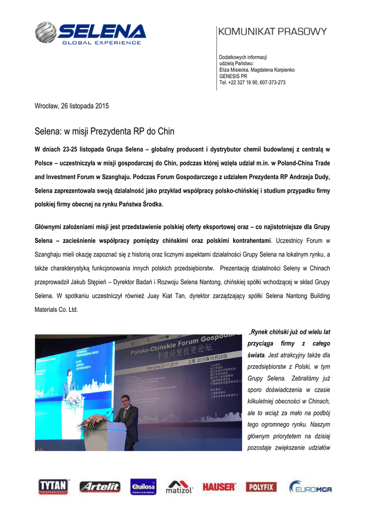Dodatkowych informacji udzielą Państwu: Eliza Misiecka, Magdalena Karpienko GENESIS PR Tel. +22 327 16 90, 607-373-273 Wrocław, 26 listopada 2015 Selena: w misji Prezydenta RP do Chin W dniach 23-25 listopada Grupa Selena – globalny producent i dystrybutor chemii budowlanej z centralą w Polsce – uczestniczyła w misji gospodarczej do Chin, podczas której wzięła udział m.in. w Poland-China Trade and Investment Forum w Szanghaju. Podczas Forum Gospodarczego z udziałem Prezydenta RP Andrzeja Dudy, Selena zaprezentowała swoją działalność jako przykład współpracy polsko-chińskiej i studium przypadku firmy polskiej firmy obecnej na rynku Państwa Środka. Głównymi założeniami misji jest przedstawienie polskiej oferty eksportowej oraz – co najistotniejsze dla Grupy Selena – zacieśnienie współpracy pomiędzy chińskimi oraz polskimi kontrahentami. Uczestnicy Forum w Szanghaju mieli okazję zapoznać się z historią oraz licznymi aspektami działalności Grupy Selena na lokalnym rynku, a także charakterystyką funkcjonowania innych polskich przedsiębiorstw. Prezentację działalności Seleny w Chinach przeprowadził Jakub Stępień – Dyrektor Badań i Rozwoju Selena Nantong, chińskiej spółki wchodzącej w skład Grupy Selena. W spotkaniu uczestniczył również Juay Kiat Tan, dyrektor zarządzający spółki Selena Nantong Building Materials Co. Ltd. „Rynek chiński już od wielu lat przyciąga firmy z całego świata. Jest atrakcyjny także dla przedsiębiorstw z Polski, w tym Grupy Selena. Zebraliśmy już sporo doświadczenia w czasie kilkuletniej obecności w Chinach, ale to wciąż za mało na podbój tego ogromnego rynku. Naszym głównym priorytetem na dzisiaj pozostaje zwiększenie udziałów Dodatkowych informacji udzielą Państwu: Eliza Misiecka, Magdalena Karpienko GENESIS PR Tel. +22 327 16 90, 607-373-273 rynkowych i pozyskiwanie nowych użytkowników dla naszych produktów. W tym roku umocniliśmy swoją pozycję Chinach zwiększając sprzedaż o prawie 40 % w stosunku do roku ubiegłego. Udział w misji gospodarczej Prezydenta RP pozwoli na podkreślenie naszego wkładu w rozwój polsko-chińskiej współpracy gospodarczej oraz na dalszą promocję Seleny w Państwie Środka” – powiedział Jarosław Michniuk, prezes zarządu Selena FM SA Grupa Selena jest obecna na chińskim rynku od 2007 roku. Dwa lata później rozpoczęła produkcję i sprzedaż. Obecnie spółka posiada dwa zakłady produkcyjne zlokalizowane w Nantong i Foshan, wytwarzające produkty przeznaczone na rynki lokalne oraz na eksport. Grupa Selena na chińskim rynku współpracuje z ponad 100 dystrybutorami i partnerami handlowymi oraz posiada trzy centra logistyczne w Foshan, Szanghaju i Pekinie. Poland-China Trade and Investment Forum w Szanghaju zostało zorganizowane we współpracy z Shanghai Commission of Commerce, China Council for the Promotion of International Trade (CCPIT) oraz Shanghai Federation of Industry and Commerce i przy udziale Ministerstwa Spraw Zagranicznych RP, Ministerstwa Gospodarki RP, Polskiej Agencji Informacji i Inwestycji Zagranicznych oraz Polskiej Agencji Rozwoju Przedsiębiorczości. Informacje dodatkowe: Grupa Selena to globalny producent i dystrybutor chemii budowlanej z centralą w Polsce. Selena oferuje szeroką gamę produktów przeznaczonych zarówno dla profesjonalnych wykonawców, jak i użytkowników indywidualnych – główne marki to TYTAN, ARTELIT oraz hiszpańska QUILOSA. Selena jest jednym z trzech największych światowych producentów piany poliuretanowej używanej do montażu okien i drzwi. Grupa w swojej ofercie posiada piany, uszczelniacze, kleje, produkty do hydroizolacji, systemy ociepleń, zamocowania oraz produkty komplementarne. W skład Grupy wchodzi 30 spółek w 17 krajach na całym świecie. Zakłady produkcyjne Seleny są zlokalizowane w Polsce, Brazylii, Korei Południowej, Chinach, Rumunii, Turcji oraz w Hiszpanii i Kazachstanie. Globalne doświadczenia zdobywane na wielu różnych rynkach pozwalają Grupie Selena szybko się rozwijać. Dzięki nim Selena staje się firmą innowacyjną i kreuje nowe rozwiązania dostosowane do potrzeb użytkowników realizując tym samym nową misję Grupy „Razem budujemy sprawniej i lepiej – Together we deliver better building performance”. Grupa Selena była wielokrotnie nagradzana w najbardziej prestiżowych rankingach. Spółka została wyróżniona przez Prezydenta Rzeczypospolitej Polskiej Bronisława Komorowskiego w ramach konkursu Nagrody Gospodarczej Prezydenta RP w kategorii „Trwały Sukces” oraz otrzymała m.in. tytuł Teraz Polska w kategorii „Inwestycja Zagraniczna”. Najwyższa jakość produktów Grupy Selena oraz ich nowoczesność cieszą się uznaniem partnerów i klientów firmy, o czym mogą świadczyć liczne nagrody, jakimi spółka jest honorowana. Od kwietnia 2008 akcje spółki holdingowej Grupy – Selena FM SA – notowane są na Giełdzie Papierów Wartościowych w Warszawie. Więcej informacji o spółce na www.selena.com Dodatkowych informacji udzielą Państwu: Eliza Misiecka, Magdalena Karpienko GENESIS PR Tel. +22 327 16 90, 607-373-273