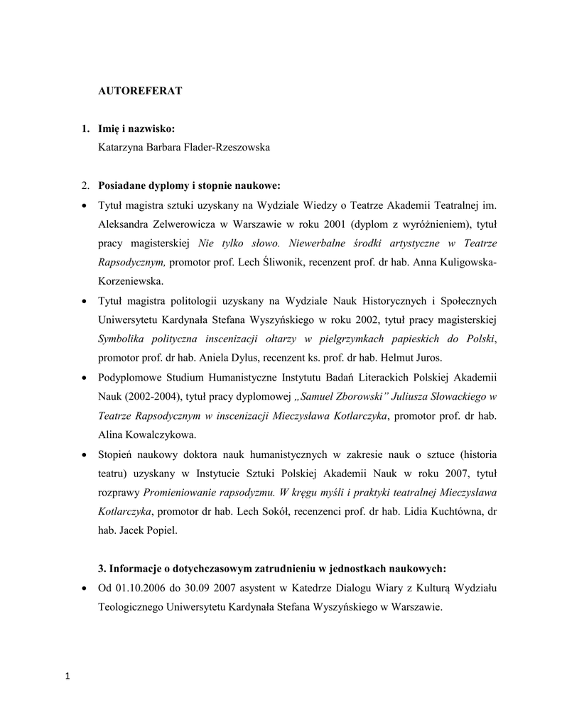 AUTOREFERAT 1. Imię i nazwisko: Katarzyna Barbara Flader-Rzeszowska 2. Posiadane dyplomy i stopnie naukowe: Tytuł magistra sztuki uzyskany na Wydziale Wiedzy o Teatrze Akademii Teatralnej im. Aleksandra Zelwerowicza w Warszawie w roku 2001 (dyplom z wyróżnieniem), tytuł pracy magisterskiej Nie tylko słowo. Niewerbalne środki artystyczne w Teatrze Rapsodycznym, promotor prof. Lech Śliwonik, recenzent prof. dr hab. Anna KuligowskaKorzeniewska. Tytuł magistra politologii uzyskany na Wydziale Nauk Historycznych i Społecznych Uniwersytetu Kardynała Stefana Wyszyńskiego w roku 2002, tytuł pracy magisterskiej Symbolika polityczna inscenizacji ołtarzy w pielgrzymkach papieskich do Polski, promotor prof. dr hab. Aniela Dylus, recenzent ks. prof. dr hab. Helmut Juros. Podyplomowe Studium Humanistyczne Instytutu Badań Literackich Polskiej Akademii Nauk (2002-2004), tytuł pracy dyplomowej „Samuel Zborowski” Juliusza Słowackiego w Teatrze Rapsodycznym w inscenizacji Mieczysława Kotlarczyka, promotor prof. dr hab. Alina Kowalczykowa. Stopień naukowy doktora nauk humanistycznych w zakresie nauk o sztuce (historia teatru) uzyskany w Instytucie Sztuki Polskiej Akademii Nauk w roku 2007, tytuł rozprawy Promieniowanie rapsodyzmu. W kręgu myśli i praktyki teatralnej Mieczysława Kotlarczyka, promotor dr hab. Lech Sokół, recenzenci prof. dr hab. Lidia Kuchtówna, dr hab. Jacek Popiel. 3. Informacje o dotychczasowym zatrudnieniu w jednostkach naukowych: Od 01.10.2006 do 30.09 2007 asystent w Katedrze Dialogu Wiary z Kulturą Wydziału Teologicznego Uniwersytetu Kardynała Stefana Wyszyńskiego w Warszawie. 1 Od 01.10.2008 do 30.09.2010 starszy wykładowca w Warszawskiej Wyższej Szkole Humanistycznej im. Bolesława Prusa na kierunkach Dziennikarstwo i Komunikacja Społeczna oraz Kulturoznawstwo. Od 01.10.2007 adiunkt w Katedrze Dialogu Wiary z Kulturą Wydziału Teologicznego (kierunek Dziennikarstwo i Komunikacja Społeczna) Uniwersytetu Kardynała Stefana Wyszyńskiego w Warszawie. 4. Wskazanie osiągnięcia* wynikającego z art. 16 ust. 2 ustawy z dnia 14 marca 2003 r. o stopniach naukowych i tytule naukowym oraz o stopniach i tytule w zakresie sztuki (Dz. U. nr 65, poz. 595 ze zm.): a) tytuł osiągnięcia naukowego/artystycznego: Katarzyna Flader-Rzeszowska, Teatr przeciwko śmierci. Kryptoteologia Tadeusza Kantora, Wydawnictwo Uniwersytetu Kardynała Stefana Wyszyńskiego, Warszawa 2015, ss. 493. b) omówienie celu naukowego ww. pracy i osiągniętych wyników wraz z omówieniem ich ewentualnego wykorzystania Książka Teatr przeciwko śmierci. Kryptoteologia Tadeusza Kantora jest nowym spojrzeniem na teatr wybitnego polskiego twórcy. Jej głównym celem jest analiza i interpretacja dzieła krakowskiego artysty z perspektywy kryptoteologicznej i teologicznej. Mimo wielu polskich oraz zagranicznych publikacji naukowych i popularnonaukowych opisujących teatr Tadeusza Kantora, nie ma jak dotąd książki w pełni poświęconej wątkom i tropom teologicznym – jawnym i ukrytym – w dziele twórcy Cricot 2. Podejmowano próby odnalezienia w sztuce Kantora motywów i symboli religijnych – zwłaszcza ze względu na dorastanie artysty w Wielopolu Skrzyńskim na plebanii ks. Józefa Radoniewicza, w bliskości obrzędów i tradycji chrześcijańskich oraz judaistycznych (Wielopole było miasteczkiem wielokulturowym i wieloreligijnym) – nigdy jednak nie powstała praca w całości i kompleksowo dedykowana temu zagadnieniu. Sto lat od narodzin artysty i ćwierć wieku od jego śmierci są dobrą okazją do ponownego spojrzenia na teatr Tadeusza Kantora. 2 Swoje rozważania zaczęłam od ustalenia stanu badań pogranicza teatru i teologii. Okazało się, że co najmniej kilka ośrodków naukowych europejskich i spoza Europy zajmuje się dziś relacją między sztuką, kulturą i teologią. Żydowscy, protestanccy i katoliccy teologowie publikują prace poświęcone temu zagadnieniu. Także teatrolodzy coraz śmielej stają na granicy teologicznoteatralnej. W Polsce można wskazać ośrodki naukowe zgłębiające związek między teologią a sztuką sceniczną (cykl międzynarodowych konferencji organizowanych przez Uniwersytet Opolski i towarzyszące im publikacje, konferencja międzynarodowa „Hidden Theology. Open Questions. Intellectual and Spiritual Values of Culture”, która odbyła się w Instytucie Sztuki PAN, czy konferencje i publikacje Instytutu Dialogu Kultury i Religii UKSW są tego najlepszym przykładem). Relacja, o której mowa, coraz częściej bywa określana mianem „teologii wizualnej”, „teologii teatru” i „teologii dramatu”, a próba interpretacji zjawisk sztuki i kultury przez pryzmat narzędzi i metodologii teologicznych – „zwrotem teologicznym w kulturze”. W dalszych analizach, podążając za sugestiami samego artysty, postanowiłam spojrzeć na Kantorowski teatr „od wewnątrz”, starając się zwrócić uwagę nie na to, co już dobrze opisane, lecz na te aspekty, które wciąż pozostają w obszarze przeczucia i domniemania badaczy. W prezentowanej książce poszukiwałam ukrytych tropów i śladów sanctum, tzw. elementów teopoetyckich. Do szczegółowych studiów wybrałam Teatr Miłości i Śmierci – ostatni cykl teatralny Tadeusza Kantora. Zastanawiające jest, że większość badaczy nie uwzględnia faktu, że artysta pod koniec swojego życia Teatr Śmierci rozszerzył o słowo „Miłość”, akcentując tym samym wyraźnie nowe aspekty filozoficzne i poznawcze w swojej sztuce. Teatr z ostatnich lat działalności twórczej Kantora, to teatr, w którym nie tylko śmierć pełnić miała ważną rolę. W moim przekonaniu jej poważną przeciwwagą stawała się idea miłości „potężnej jak śmierć”, miłości zdolnej przeciwstawić się bezsensowi śmierci. Widać to nie tylko w spektaklach powstałych z zespołem Cricot 2, ale także, a może przede wszystkim, w cricotages – małych formach scenicznych, przygoto