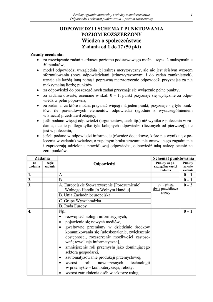 Próbny egzamin maturalny z wiedzy o społeczeństwie Odpowiedzi i schemat punktowania – poziom rozszerzony 1 ODPOWIEDZI I SCHEMAT PUNKTOWANIA POZIOM ROZSZERZONY Wiedza o społeczeństwie Zadania od 1 do 17 (50 pkt) Zasady oceniania: • za rozwiązanie zadań z arkusza poziomu podstawowego można uzyskać maksymalnie 50 punktów, • model odpowiedzi uwzględnia jej zakres merytoryczny, ale nie jest ścisłym wzorem sformułowania (poza odpowiedziami jednowyrazowymi i do zadań zamkniętych), uznaje się każdą inną pełną i poprawną merytorycznie odpowiedź, przyznając za nią maksymalną liczbę punktów, • za odpowiedzi do poszczególnych zadań przyznaje się wyłącznie pełne punkty, • za zadania otwarte, oceniane w skali 0 – 1, punkt przyznaje się wyłącznie za odpowiedź w pełni poprawną, • za zadania, za które można przyznać więcej niż jeden punkt, przyznaje się tyle punktów, ile prawidłowych elementów odpowiedzi (zgodnie z wyszczególnieniem w kluczu) przedstawił zdający, • jeśli podano więcej odpowiedzi (argumentów, cech itp.) niż wynika z polecenia w zadaniu, ocenie podlega tylko tyle kolejnych odpowiedzi (liczonych od pierwszej), ile jest w poleceniu, • jeżeli podane w odpowiedzi informacje (również dodatkowe, które nie wynikają z polecenia w zadaniu) świadczą o zupełnym braku zrozumienia omawianego zagadnienia i zaprzeczają udzielonej prawidłowej odpowiedzi, odpowiedź taką należy ocenić na zero punktów. Zadania nr zadania 1. 2. 3. 4. część zadania Schemat punktowania Odpowiedzi Punkty za poszczególne części zadania A B po 1 pkt za A. Europejskie Stowarzyszenie [Porozumienie] dwie prawidłowe Wolnego Handlu [o Wolnym Handlu] nazwy B. Unia Zachodnioeuropejska C. Grupa Wyszehradzka D. Rada Europy Np.: • rozwój technologii informacyjnych, • pojawienie się nowych mediów, • gwałtowne przemiany w dziedzinie środków komunikowania się [udoskonalenie, zwiększenie dostępności, rozszerzenie możliwości zastosowań; rewolucja informatyczna], • zmniejszenie roli przemysłu jako dominującego sektora gospodarki, • zautomatyzowanie produkcji przemysłowej, • wzrost roli nowoczesnych technologii w przemyśle – komputeryzacja, roboty, • wzrost zatrudnienia osób w sektorze usług. Punkty za całe zadanie 0–1 0–1 0–2 0–1 Próbny egzamin maturalny z wiedzy o społeczeństwie Odpowiedzi i schemat punktowania – poziom rozszerzony 2 5. 6. 7. a) b) 8. 9. 10. a) b) A. – Prawda B. – Fałsz C. – Prawda A. – Fałsz B. – Prawda C. – Fałsz • Województwo, w którym odsetek zatrudnienia w III sektorze jest największy. [województwo] zachodniopomorskie • Województwo, w którym odsetki zatrudnienia w I i II sektorze są najbardziej zbliżone do siebie. [województwo] mazowieckie Np.: • uwarunkowania historyczne: duża liczba gospodarstw o małym areale we wschodnich województwach, wyższy poziom urbanizacji w części zachodniej, • koncentracja przemysłu w aglomeracjach (uwarunkowania związane z rynkiem pracy i środkami transportu), • koncentracja przemysłu w aglomeracjach na Śląsku (uwarunkowania surowcowe), • napływ zagranicznego kapitału, głównie do sektorów pozarolniczych. [Grupa] etniczna Globalizacja [Integracja] A. – parlamentarno-gabinetowy B.– gabinetowo-parlamentarny C.– kanclerski, [parlamentarno – gabinetowy] D. – parlamentarno-komitetowy Dwa z trzech wymienionych : • • • 1996 – referendum uwłaszczeniowe [wyrażenie zgody na rozpoczęcie programu powszechnej prywatyzacji (PPP)], 1997 – referendum konstytucyjne [zatwierdzenie konstytucji RP], 2003 – referendum akcesyjne [unijne] [wyrażenie zgody na przystąpienie Polski do UE]. 0–1 0–1 0–1 0–2 1 pkt za poprawne wskazanie dwóch województw 0–1 1 pkt za podanie dwóch przyczyn 0–1 0–1 0–2 po 1 pkt za każde dwie prawidłowe nazwy 0–2 po 1 pkt za podanie daty referendum i jego nazwy /tematyki/ lub 1 pkt za podanie dwóch dat i 1 pkt za podanie dwóch nazw /tematyki/ referendum 0–2 Próbny egzamin maturalny z wiedzy o społeczeństwie Odpowiedzi i schemat punktowania – poziom rozszerzony 3 1 pkt za prawi0–1 • Hipoteza: dłowe wyodrębKto mogąc udzielić pomocy, bez narażania siebie nienie trzech lub innej osoby na niebezpieczeństwo utraty życia elementów albo ciężkiego uszczerbku na zdrowiu, człowiekowi znajdującemu się w położeniu grożącym bezpośrednim niebezpieczeństwem utraty życia albo ciężkiego uszczerbku na zdrowiu • Dyspozycja: nie udziela pomocy, [każdy kto nie udziela pomocy] • Sankcja: podlega karze pozbawienia wolności do lat 3. W sądach [I instancji] zasiadają ławnicy. 12. 0–1 [W sądach powszechnych są ławnicy]. Uwaga: nie przyznajemy punktu, jeżeli zdający udzieli odpowiedzi, np. „W sądach apelacyjnych [wojskowych] zasiadają ławnicy”. po 1 pkt A. – 3 13. 0–2 za dwa prawidłoB. – 4 we przyporządC. – 1 kowania D. – 2 Np.: 14. 0–1 • niestabilność prawa, • zmienność przepisów prawa, • liberalizacja prawa. Uwaga: należy uznać każdą inną, poprawą merytorycznie odpowiedź świadczącą, że zdający rozumie problem przedstawiony na rysunku. Dwa z wymienionych: 0–1 0–4 15. a) 1 pkt za wymie• USA nie czują się zobowiązane prawem międzynarodowym w realizacji swej polityki bez- nienie dwóch założeń pieczeństwa, • USA mogą interweniować wszędzie i zawsze, gdy uznają to za właściwe, • liczą się tylko subiektywne odczucia USA, • interes bezpieczeństwa USA ma charakter globalny. b) 0–1 • napędzają potężne fale imigracji 1 pkt za wymie• napadają na swoich sąsiadów 11. nienie dwóch skutków c) Dwie z wymienionych: 0–1 • irytacja i niepokój z powodu ogromnej przewagi 1 pkt za wymienienie dwóch USA nad resztą świata, przyczyn • antyamerykanizm wypełnia próżnię ideologiczną po klęsce socjalizmu w walce z kapitalizmem, • hegemonia USA, • je