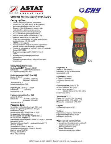 CHY9005 Miernik cęgowy 600A AC/DC Cechy ogólne: • • • • • • • • • • • • • • • Średnica mierzonego przewodu Ø35mm max Pomiary typu True RMS dla ACV, ACA (20÷400Hz) Wskaźnik analogowy BARGRAF (20 razy/s) Zliczanie LCD do 9999 zapewnia wysokie i stałe rozdzielczości w szerokim zakresie pomiaru Automatyczna zmiana zakresów pomiarowych HOLD: zatrzymanie wyniku pomiaru na LCD INRUSH: pomiar prądów rozruchowych AC i DC MAX/MIN: rejestracja wartości MAX, MIN PEAK: zatrzymanie wartości szczytowej wyniku pomiaru prądów lub napięć AC i DC na LCD ∆ZERO: pomiar względny Hz: natychmiastowe przejście do pomiaru częstotliwości podczas pomiaru prądu lub napięcia przemiennego Ochrona na przeciążenie: A: 1000A AC/1200A DC, pozostałe funkcje: 600V AC/DC Bezpieczeństwo zgodne z PN-EN 61010-1 kat. III 1000V Automatyczne wyłączenie po 10 minutach bezczynności Obudowa dwukomponentowa z pokryciem tworzywem antyudarowym Specyfikacja techniczna: Napięcie stałe DCV Zakresy: 0...600,0V Dokładność: ±(1,0%+5c) Rozdzielczość: 0,1V Impedancja wejściowa: 1MΩ Napięcie przemienne ACV True RMS Rezystancja R Zakresy: 0...999,9-9999Ω Dokładność: ±(1,5%+5c) Maksymalna rozdzielczość: 0,1Ω Zakresy: 0...600,0V Dokładność: 20÷100Hz: ±(2,0%+5c) 100÷400Hz: ±(6,0%+5c) Rozdzielczość: 0,1V Impedancja wejściowa: 1MΩ Pojemność C Zakresy: Prąd stały DCA Zakresy: 0...600,0A 400,0Hz Dokładność: ±(0,5%+5c) Czułość: 5Vrms (sygnały TTL) ≥5A (20÷100Hz), ≥10A (100÷400Hz) Rozdzielczość: 0,1Hz Dokładność: ±(2,0%+5c) Rozdzielczość: 0,1A Prąd przemienny ACA True RMS 0...999,9µF Dokładność: ±(5,0%+10c) Rozdzielczość: 0,1µF Częstotliwość Hz Zakresy: 0...20- Zakresy: 0...600,0A Dokładność: 20÷100Hz: ±(2,0%+5c) 100÷400Hz: ±(6,0%+5c) Rozdzielczość: 0,1A Temperatura °C, °F Pozostałe dane: Ciągłość Wyświetlacz: LCD podświetlany 4 cyfry (9999 max) Bargraf: 40 segmentów (próbkowanie 20razy/s) Próbkowanie: 2 razy/s Bezpieczeństwo: PN-EN 61010-1 kat. III 1000V Kompatybilność elektromagnetyczna: PN-EN61326, PN-EN61000-4-2, PN-EN61000-4-3, PN-EN61000-4-8, PN-EN55011, Ochrona wejść na przeciążenie: A: 1000A AC/1200A DC, pozostałe funkcje:600V AC/DC Współczynnik temperatury: 0,1 x (podana dokładność) / °C (0÷18°C, 28÷50°C) Środowisko pracy: 0÷50°C, RH<70% Środowisko przechowywania: -20÷60°C, RH<80% Zasilanie: bateria 9V (6F22) Wymiary: 233x80x43mm Masa: 346 g (z baterią) Zakresy: -40°C÷1200°C (-40°F÷2200°F) Dokładność: ±(0,5% +1°C); ±(0,5% +2°F) Maksymalna rozdzielczość: 0,1°C, 0,1°F Sygnał akustyczny dla R<30Ω Test diod Prąd pomiarowy (typowy): 0,2mA ±1mA Napięcie rozwartego obwodu: <3,0V Dokładność: ±(3,0%+3c) Wyposażenie standardowe: • • • • • sonda temperatury typu perełkowego (szt. 1) adapter sondy temperatury (szt. 1) przewody pomiarowe (para) bateria (zainstalowana) instrukcja obsługi w języku polskim ASTAT Poznań, tel. (061) 848 88 71, faks (061) 848 82 76, http:// www.astat.com.pl