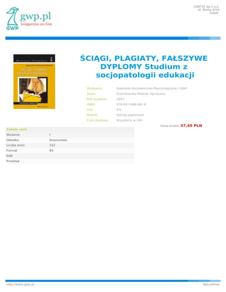 GWP.PL Sp z o.o. Ul. Bema 4/1A Sopot ŚCIĄGI, PLAGIATY, FAŁSZYWE DYPLOMY Studium z socjopatologii edukacji Wydawca: Gdańskie Wydawnictwo Psychologiczne / GWP Autor: Gromkowska-Melosik Agnieszka Rok wydania: 2007 ISBN: 978-83-7489-061-8 Vat: 5% Nośnik: Wersja papierowa Czas dostawy: Wysyłamy w 24h Cena brutto: 37,45 PLN Tabela cech Wydanie I Okładka broszurowa Liczba stron 152 Format B5 EAN Przekład http://www.gwp.pl AptusShop