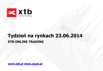 Tydzień na rynkach 23.06.2014 XTB ONLINE TRADING www.xtb.pl www.xpuls.pl Spotkanie 23.06.2014 1. Miniony tydzień w obiektywie: Dolar traci po posiedzeniu Fed Taśmy cd. 2. Bieżący tydzień Carney (wtorek) Wstępne PMI Wstępna inflacja w EMU (piątek) Dane z USA: sprzedaż domów (dziś i jutro), CB (wtorek), zamówienia, finalny PKB (środa), claims, PCE index (czwartek), UoM (piątek) 3. Omówienie pozycji 4. Ciekawe wykresy XTB ul. Ogrodowa 58 00-876 Warszawa +48 222 019 550 [email protected] www.xtb.pl Miniony tydzień w obiektywie Dolar traci po posiedzeniu Fed http://xpuls.pl/amerykanski-rentownosci-szaleja-po-danych/ http://xpuls.pl/czy-fed-zauwazy-dane-makro/ http://xpuls.pl/po-fed-podsumowanie/ http://xpuls.pl/dlaczego-dolar-traci-po-fed/ http://xpuls.pl/eurusd-a-rynek-obligacji-2/ http://xpuls.pl/tydzien-inflacji/ XTB ul. Ogrodowa 58 00-876 Warszawa +48 222 019 550 [email protected] www.xtb.pl Miniony tydzień w obiektywie Taśmy cd. http://xpuls.pl/tasmy-i-zloty/ http://xpuls.pl/early-elections-in-poland-z-naszegoglobalnego-tygodnika/ XTB ul. Ogrodowa 58 00-876 Warszawa +48 222 019 550 [email protected] www.xtb.pl Bieżący tydzień Carney http://xpuls.pl/pozostale-miary-inflacji-w-uk-tez-nizej/ http://xpuls.pl/dane-o-inflacji-z-uk-kompletnie-zignorowane/ http://xpuls.pl/protokol-banku-anglii-niewiele-zmieniapreferujemy-eurgbp/ http://xpuls.pl/pozycja-usdpln-zamykamy/ http://xpuls.pl/mark-carney-przesluchanie-w-parlamencie/ http://xpuls.pl/gbpusd-a-rynek-stopy-3/ XTB ul. Ogrodowa 58 00-876 Warszawa +48 222 019 550 [email protected] www.xtb.pl Bieżący tydzień Wstępne PMI Wstępna inflacja w EMU (piątek) http://xpuls.pl/emu-indeksy-pmi-dla-przemyslu-i-uslug-519pkt-i-528-pkt/ http://xpuls.pl/tydzien-inflacji/ XTB ul. Ogrodowa 58 00-876 Warszawa +48 222 019 550 [email protected] www.xtb.pl Bieżący tydzień Dane z USA: sprzedaż domów (dziś i jutro), CB (wtorek), zamówienia, finalny PKB (środa), claims, PCE index (czwartek), UoM (piątek) http://xpuls.pl/tydzien-inflacji/ XTB ul. Ogrodowa 58 00-876 Warszawa +48 222 019 550 [email protected] www.xtb.pl Pozycje http://xpuls.pl/pozycja-silver/ http://xpuls.pl/pozycja-gbpjpy/ http://xpuls.pl/pozycja-audusd-zamknieta/ http://xpuls.pl/pozycja-usdchf-4/ http://xpuls.pl/pozycja-usdpln-zamykamy/ XTB ul. Ogrodowa 58 00-876 Warszawa +48 222 019 550 [email protected] www.xtb.pl Ciekawe wykresy EURUSD, GOLD, USDJPY GBPUSD, EURGBP, EURJPY US500, W20, EU50 USDPLN, USDTRY COPPER, COFFEE AUDUSD, EURAUD XTB ul. Ogrodowa 58 00-876 Warszawa +48 222 019 550 [email protected] www.xtb.pl Dziękuję za uwagę dr Przemysław Kwiecień CFA X-Trade Brokers Dom Maklerski S.A. ul. Ogrodowa 58 [email protected] 00-876 Warszawa www.xtb.pl