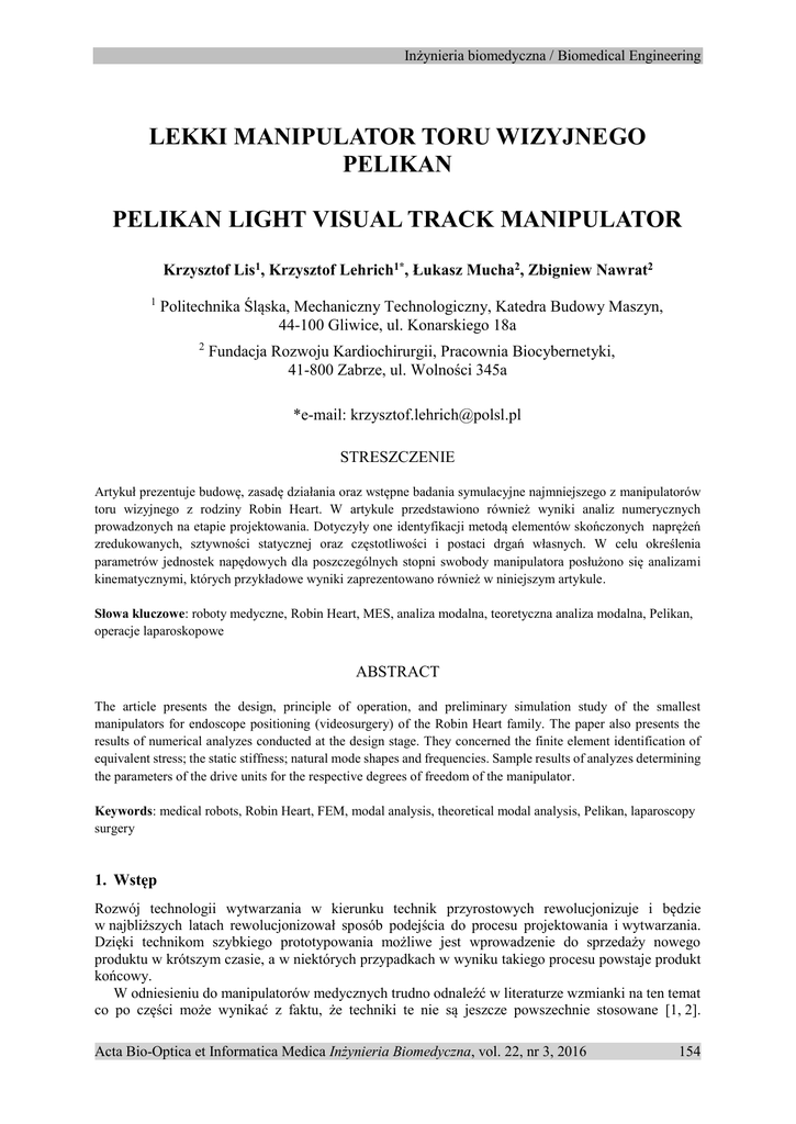 Inżynieria biomedyczna / Biomedical Engineering LEKKI MANIPULATOR TORU WIZYJNEGO PELIKAN PELIKAN LIGHT VISUAL TRACK MANIPULATOR Krzysztof Lis1, Krzysztof Lehrich1*, Łukasz Mucha2, Zbigniew Nawrat2 1 Politechnika Śląska, Mechaniczny Technologiczny, Katedra Budowy Maszyn, 44-100 Gliwice, ul. Konarskiego 18a 2 Fundacja Rozwoju Kardiochirurgii, Pracownia Biocybernetyki, 41-800 Zabrze, ul. Wolności 345a *e-mail: [email protected] STRESZCZENIE Artykuł prezentuje budowę, zasadę działania oraz wstępne badania symulacyjne najmniejszego z manipulatorów toru wizyjnego z rodziny Robin Heart. W artykule przedstawiono również wyniki analiz numerycznych prowadzonych na etapie projektowania. Dotyczyły one identyfikacji metodą elementów skończonych naprężeń zredukowanych, sztywności statycznej oraz częstotliwości i postaci drgań własnych. W celu określenia parametrów jednostek napędowych dla poszczególnych stopni swobody manipulatora posłużono się analizami kinematycznymi, których przykładowe wyniki zaprezentowano również w niniejszym artykule. Słowa kluczowe: roboty medyczne, Robin Heart, MES, analiza modalna, teoretyczna analiza modalna, Pelikan, operacje laparoskopowe ABSTRACT The article presents the design, principle of operation, and preliminary simulation study of the smallest manipulators for endoscope positioning (videosurgery) of the Robin Heart family. The paper also presents the results of numerical analyzes conducted at the design stage. They concerned the finite element identification of equivalent stress; the static stiffness; natural mode shapes and frequencies. Sample results of analyzes determining the parameters of the drive units for the respective degrees of freedom of the manipulator. Keywords: medical robots, Robin Heart, FEM, modal analysis, theoretical modal analysis, Pelikan, laparoscopy surgery 1. Wstęp Rozwój technologii wytwarzania w kierunku technik przyrostowych rewolucjonizuje i będzie w najbliższych latach rewolucjonizował sposób podejścia do procesu projektowania i wytwarzania. Dzięki technikom szybkiego prototypowania możliwe jest wprowadzenie do sprzedaży nowego produktu w krótszym czasie, a w niektórych przypadkach w wyniku takiego procesu powstaje produkt końcowy. W odniesieniu do manipulatorów medycznych trudno odnaleźć w literaturze wzmianki na ten temat co po części może wynikać z faktu, że techniki te nie są jeszcze powszechnie stosowane [1, 2]. Acta Bio-Optica et Informatica Medica Inżynieria Biomedyczna, vol. 22, nr 3, 2016 154 Inżynieria biomedyczna / Biomedical Engineering W niniejszym artykule opisano budowę, zasadę działania oraz wyniki badań symulacyjnych, przeprowadzonych na etapie projektowania prototypu najmniejszego z manipulatorów toru wizyjnego z rodziny Robin Heart. Projekt został zrealizowany w Fundacji Rozwoju Kardiochirurgii im. Z. Religii we współpracy z pracownikami ośrodków naukowych oraz prywatnych firm. 2. Budowa i zasada działania manipulatora Robin Heart Pelikan to prototypowy manipulator, dedykowany dla operacji laparoskopowych przeznaczony dla toru wizyjnego. Jego zadaniem jest podtrzymywanie oraz manipulacja kamerą endoskopową, która stanowi element toru wizyjnego. Umożliwienia ona obserwację pola operacyjnego. Chirurg prowadzący operację minimalnie inwazyjną (laparoskopową) za pomocą pilota lub innego zadajnika ruchu steruje położeniem robota, a co za tym idzie, wpływa na orientację kamery oraz obrazu wyświetlanego na ekranie monitora [3, 4]. Głównymi czynnikami, które zdeterminowały postać konstrukcyjną manipulatora były: możliwość montażu do stołu operacyjnego, oraz mała waga. Pierwszy z wymogów wynikał z faktu, iż podczas operacji pozycja pacjenta wraz ze stołem jest zmieniana i manipulator powinien umożliwiać dostosowywanie toru wizyjnego do tych zmian. Jeżeli zatem manipulator związany jest bezpośrednio ze stołem, to jego pozycja zmienia się wraz ze zmianą pozycji stołu i proces uzyskania właściwego położenia jest dużo łatwiejszy do osiągnięcia [5]. W związku z tym, iż nośność standardowego stołu operacyjnego jest mała w miejscach umożliwiających mocowanie manipulatora, jego masa musiała zostać mocno ograniczona. W założeniach konstrukcyjnych przyjęto również, że manipulator powinien być urządzeniem mobilnym i umożliwiać transport w poręcznej walizce. Zatem był to drugi z argumentów przemawiających za ograniczeniem wymiarów i masy manipulatora. Mając na uwadze powyższe założenia zdecydowano się opracować konstrukcję modułową umożliwiającą łatwy i szybki montaż oraz serwis manipulatora. W celu minimalizacji masy część elementów konstrukcyjnych manipulatora wykonano metodą wydruku 3D z materiału PCABS, wykorzystując urządzenie Vantage SE firmy Stratasys. Poglądowe zestawienie wszystkich materiałów zastosowanych przedstawiono na rysunku 1. Elementy nośne wykonano w postaci nierozłącznie połączonych przegubów ze stopu aluminium i rurek kompozytowych z włókna węglowego. Połączenie elementów wykonanych w technice wydruku 3D z pozostałymi elementami realizowano na drodze klejenia lub łączenia w sposób mechaniczny. W technologii wydruku 3D wykonano wszystkie korpusy 3-go i 4-go stopnia swobody oraz korpus prowadnicy zamykającej równoległobok. Na rysunku 1 przedstawiono projekt robota wraz z systemem mocującym. Rys. 1. Materiały zastosowane w konstrukcji manipulatora Robin Heart Pelikan Acta Bio-Optica et Informatica Medica Inżynieria Biomedyczna, vol. 22, nr 3, 2016 155 Inżynieria biomedyczna / Biomedical Engineering Dla zwiększenia bezpieczeństwa pacjenta założono, iż stałopunktowość manipulatora, rozumiana jako niezmienność położenia punktu przejścia trokaru przez tkanki skórne, realizowana będzie poprzez strukturę kinematyczną na drodze mechanicznej o czterech stopniach swobody [6, 7]. Założono także konieczność zastosowan