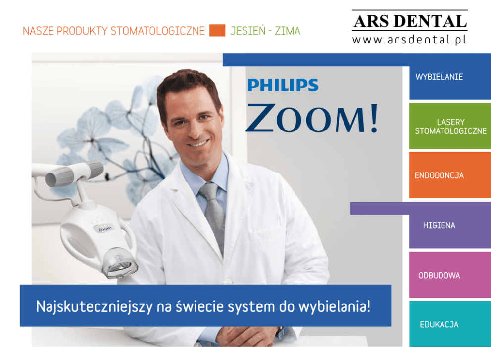NASZE PRODUKTY STOMATOLOGICZNE JESIEŃ - ZIMA WYBIELANIE LASERY STOMATOLOGICZNE ENDODONCJA HIGIENA ODBUDOWA Najskuteczniejszy na świecie system do wybielania! EDUKACJA www.whitesmile.de www.discusdental.com ul. Środkowa 1 03-430 Warszawa tel./fax: +48 (22) 617-81-05 kom.: +48 693-616-999 [email protected] www.arsdental.pl www.austdent.com.au www.garrisondental.com www.ems-company.com www.ffdm-pneumat.com www.arclaser.de www.erskinedental.com Wszystkie podane ceny są cenami brutto i zawierają podatek VAT. Podane ceny są cenami katalogowymi. Katalog nie stanowi oferty w rozumieniu kodeksu cywilnego, podane ceny mogą ulec zmianie. Przedstawiona oferta jest ważna do momentu wyczerpania zapasów. Kilka słów wstępu... Szanowni Państwo, z wielką przyjemnością oddajemy w Państwa ręce najnowszą edycję naszego katalogu. Znajdziecie w nim wiele nowych, interesujących produktów, które wprowadziliśmy w ostatnim czasie do naszej oferty. Przy przygotowywaniu katalogu staraliśmy się aby był on jak najbardziej czytelny i intuicyjny. Dlatego też, postanowiliśmy podzielić go na sześć, oddzielonych kolorystycznie, sekcji tematycznych – Wybielanie, Lasery Stomatologiczne, Endodoncja, Higiena, Odbudowa oraz Edukacja. Największe zmiany w stosunku do poprzedniej edycji zaszły w dziale Wybielanie, gdzie znajdują się oferowane przez nas systemy wybielające. Od września bieżącego roku nawiązaliśmy współpracę z największym w Europie producentem profesjonalnych preparatów do wybielania – WHITEsmile GmbH, którego pełną gamę produktów znajdą Państwo w naszej aktualnej ofercie. Firma WHITEsmile jest niekwestionowanym liderem w zakresie sprzedaży preparatów wybielających w Europie Zachodniej. Wprowadzenie produktów WHITEsmile do sprzedaży pozwoli nam na uzupełnienie dotychczasowej oferty preparatów wybielających o wysokiej jakości materiały do nakładkowego i gabinetowego wybielania. Tak szeroka oferta materiałów wybielających, którą będziemy obecnie dysponowali, pozwoli na dobór optymalnego modelu kuracji nawet dla najbardziej wymagającego pacjenta. Duże zmiany dotyczyć będą również preparatów Nite White ACP i Day White ACP. Od września bieżącego roku zmianie uległ wygląd ich opakowań, zyskały bardziej nowoczesny i ekskluzywny design. Zmianie ulegnie również nazwa, miejsce Nite White i Day White zajmie obecnie marka Philips Zoom. Zapraszamy do lektury naszego katalogu. Z poważaniem, Michał Karpiński Manager ds. sprzedaży WYBIELANIE WHITEsmile - PROFESJONALNE PRODUKTY DO WYBIELANIA ZĘBÓW WHITEsmile to niemiecka firma działająca na europejskim rynku stomatologicznym od 1994 roku. Obecnie jest największym w Europie producentem preparatów do wybielania zębów. Wszystkie oferowane przez nią produkty charakteryzują się bardzo wysoką jakością wykonania oraz dużą skutecznością wybielania. WHITEsmile od zawsze przywiązywała dużą uwagę do jakości oferowanych przez siebie preparatów, dlatego też do dzisiaj wszystkie oferowane przez nią produkty są produkowane w jej własnej fabryce znajdującej się na terenie Niemiec. Wszystkie oferowane materiały zostały poddane testom klinicznym i posiadają certyfikat wyrobu medycznego uprawniający do ich sprzedaży na terenie Unii Europejskiej. WHITEsmile w swojej ofercie posiada trzy linie preparatów do wybielania zębów WS HOME WHITENING, WS LIGHT WHITENING oraz WS POWER WHITENING. Preparaty do nakładkowego wybielania zębów. Przeznaczone do samodzielnego stosowania w domu, w indywidualnie wykonanych dla pacjenta nakładkach. Preparaty do wybielania w gabinecie stomatologicznym z użyciem lampy wybielającej. Doskonale nadają się do pracy ze wszystkimi dostępnymi na rynku lampami wybielającymi. 4 Preparaty do wybielania gabinetowego bez użycia lampy. Zapewniają bardzo dobre rezultaty bez konieczności inwestowania w lampy wybielające. 1 WHITEsmile HOME 2 WHITEsmile HOME 4 strzykawki 1 strzykawka Zestaw dostępny w stężeniu: 10%, 16%, 22% lub 35% CP. Strzykawka dostępna w stężeniu: 10%, 16%, 22% lub 35% CP. Zawartość zestawu: 4 strzykawki z żelem wybielającym (1,2 ml) 1 strzykawka preparatu na nadwrażliwość AWM (1,2 ml) WYBIELANIE Wybielanie nakładkowe NAJLEPSZE NAKŁADKI W POLSCE! Posiadamy bardzo doświadczony zespół, który od wielu lat specjalizuje się w przygotowywaniu nakładek do wybielania. Nasze nakładki charakteryzują się wysoką jakością oraz precyzją wykonania. Do współpracy zapraszamy gabinety stomatologiczne z całej Polski. Wykonujemy nakładki dla gabinetów z terenu całego kraju. 35 Zawartość zestawu: 65 PLN PLN 1 strzykawka z żelem wybielającym (3 ml) 3 WHITEsmile HOME 8 strzykawek Zestaw dostępny w stężeniu: 10%, 16%, 22% lub 35% CP. 4 WHITEsmile HOME 135 PLN 12 strzykawek Zestaw dostępny w stężeniu: 10%, 16%, 22% lub 35% CP. 195 PLN Współpraca z nami to dla Państwa same korzyści: • na terenie Warszawy odbiór wycisków i dowóz wykonanych nakładek jest bezpłatny • krótkie terminy realizacji zamówień - 48 godzin od momentu otrzymania wycisków • dokładne i staranne wykonanie • profesjonalne doradztwo • bardzo konkurencyjna cena Za 2 łu ki zębo we 120 Zawartość zestawu: Zawartość zestawu: 8 strzykawek z żelem wybielającym (1,2 ml) 2 strzykawki preparatu na nadwrażliwość AWM (1,2 ml) pudełko na nakładki dla pacjenta oraz pastę wybielającą WHITEsmile 12 strzykawek z żelem wybielającym (1,2 ml) 3 strzykawki preparatu na nadwrażliwość AWM (1,2 ml) 3 pudełka na nakładki dla pacjentów PLN Informacje i zamówienia: (22) 617-81-05, [email protected], www.arsdental.pl 5 WYBIELANIE ENDODONCJA Wybielanie nakładkowe 7 Nite White ACP 6 strzykawek 6 Nite White ACP 3 strzykawki Zestaw startowy dla jednego pacjenta, zawiera materiał wybielający wystarczający na 18 dwułukowych aplikacji. Zestaw dostępny w stężeniu: 10%, 16% lub 22% CP. Zestaw uzupełniający, zawiera mate